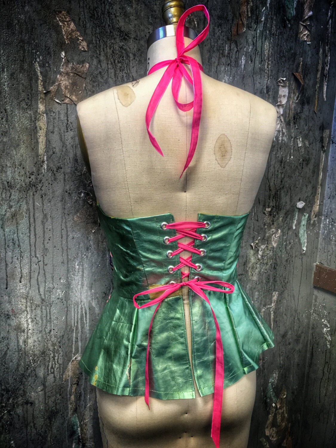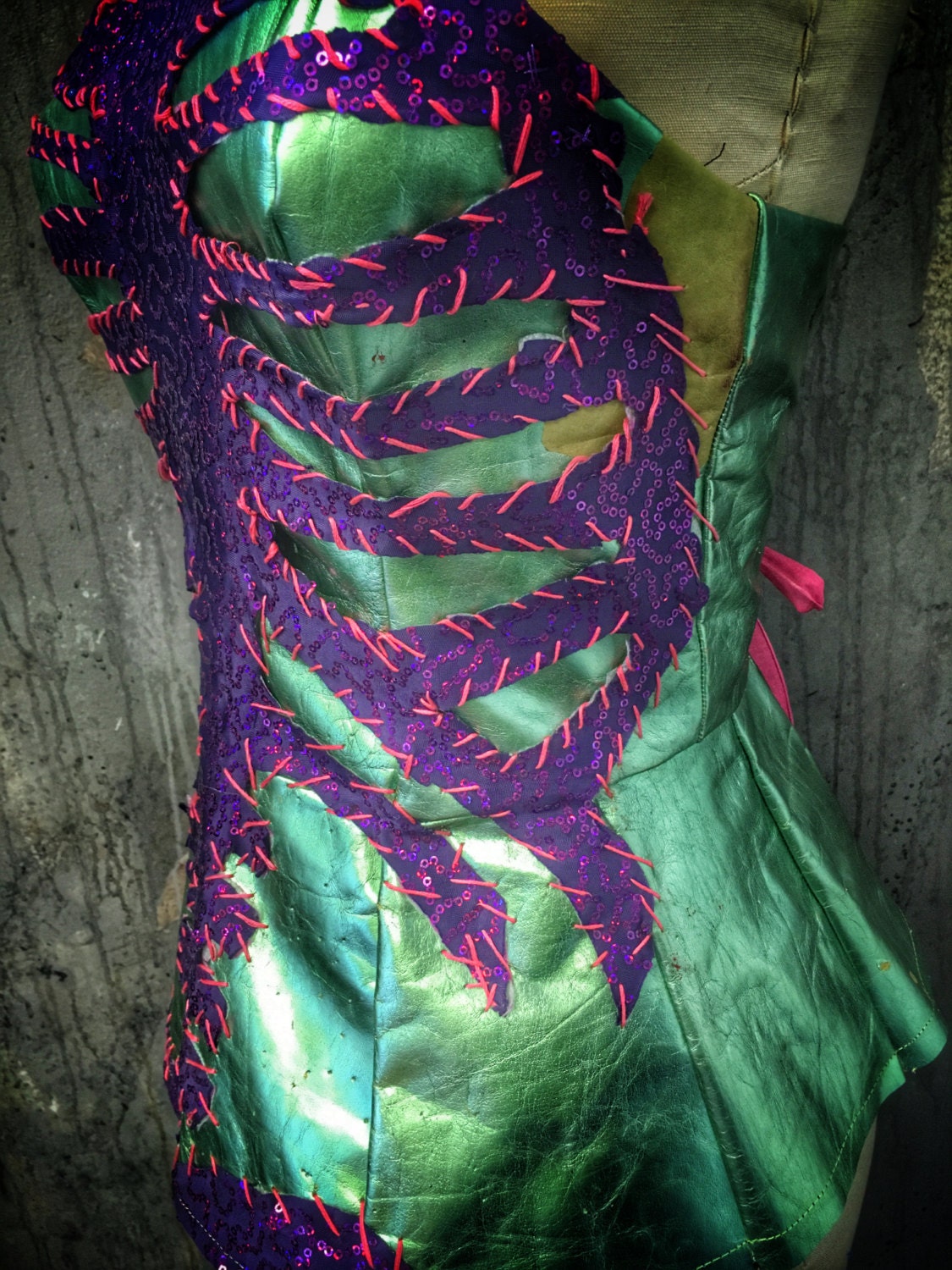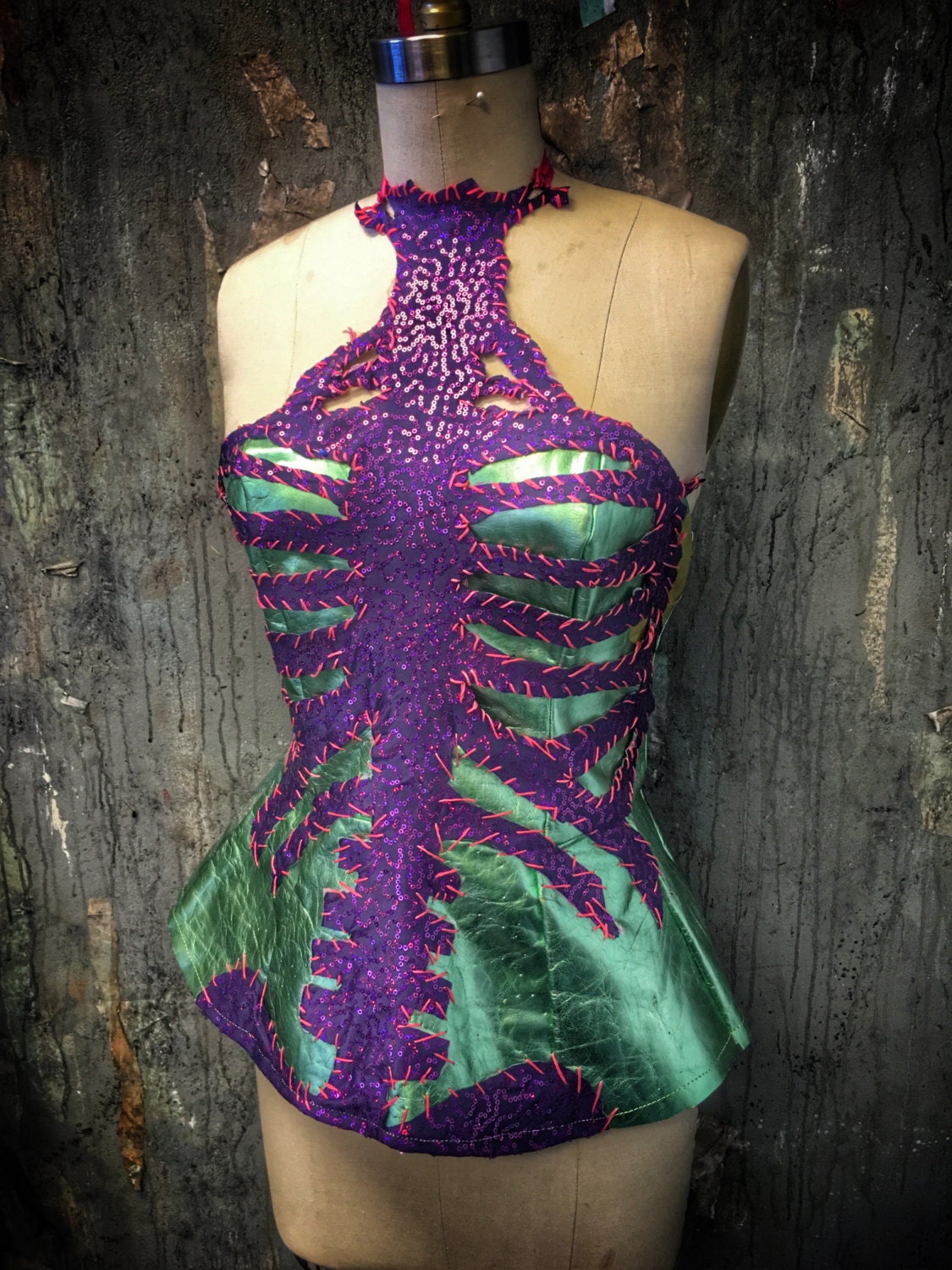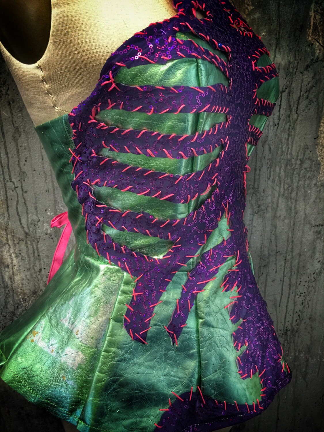 One of a kind Anti.Label corset top made of distressed metallic leather. Corset has purple sequin rib cage overlay with hot pink hand stitching, boning, lining and lace up back.