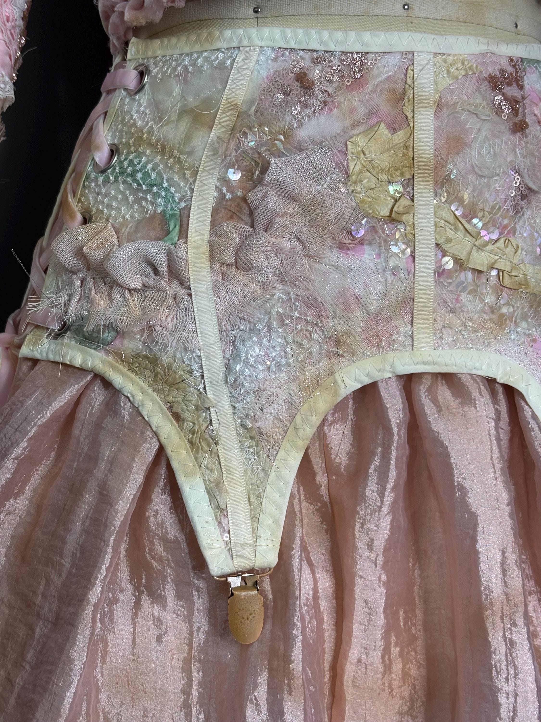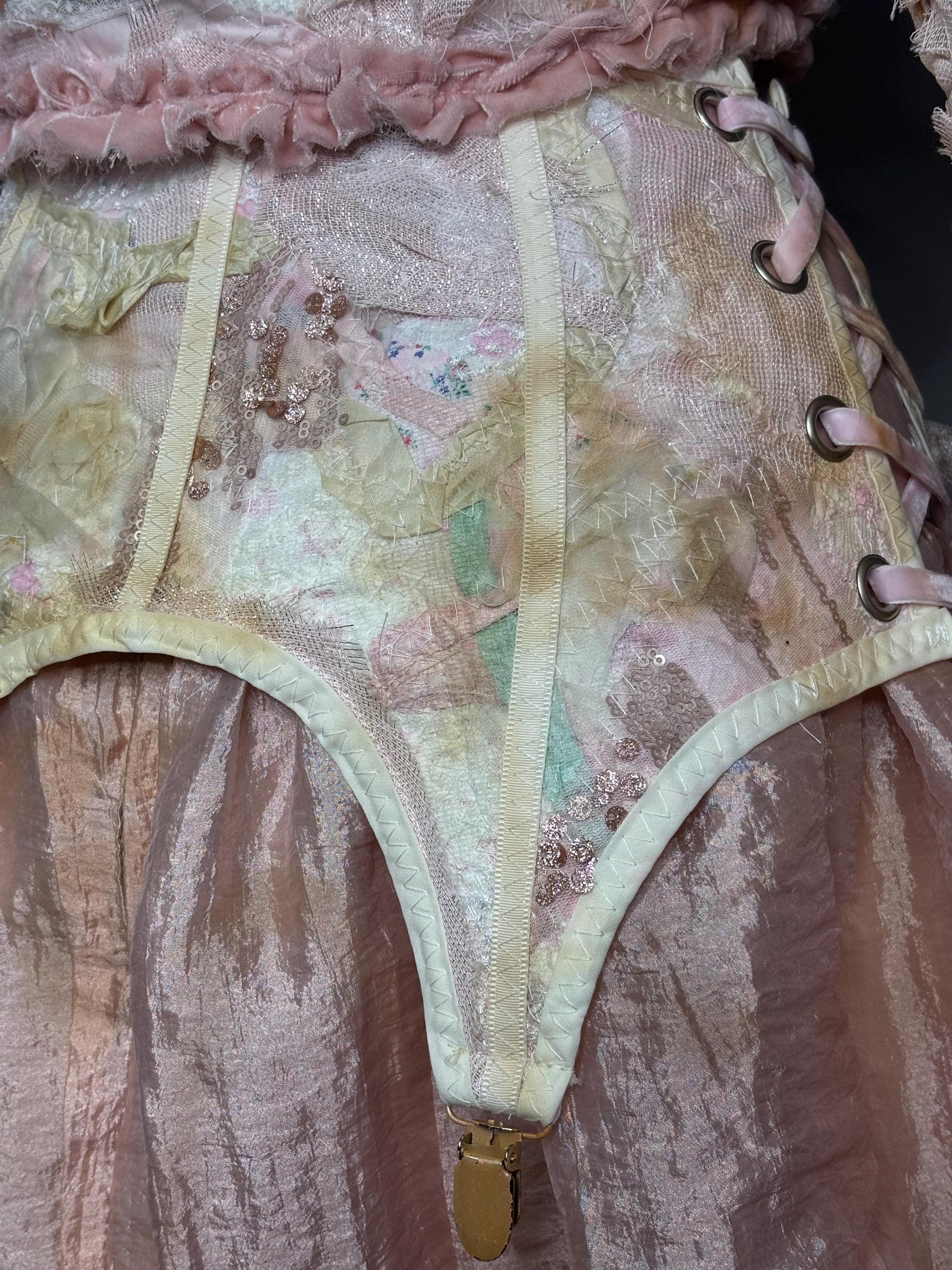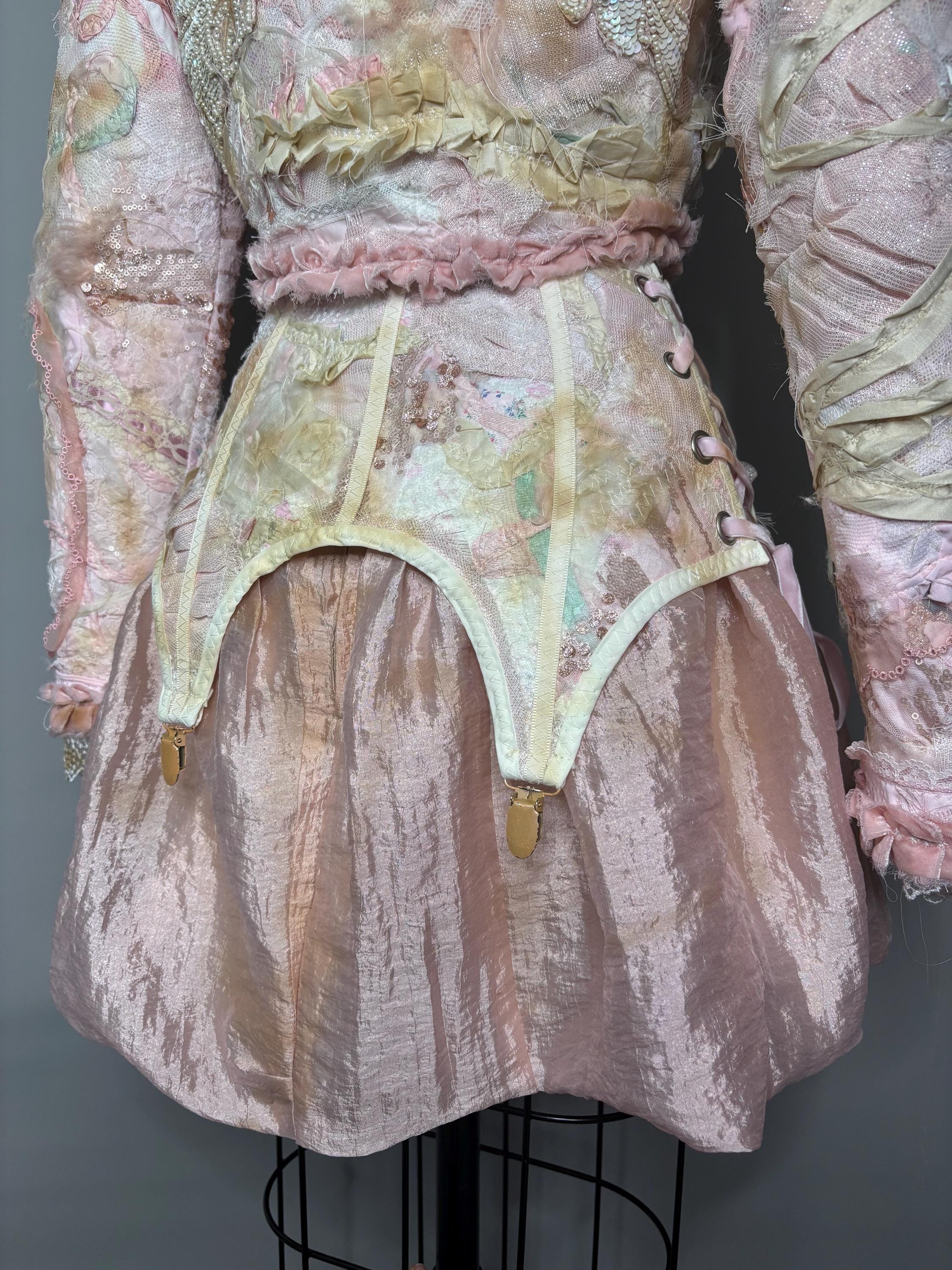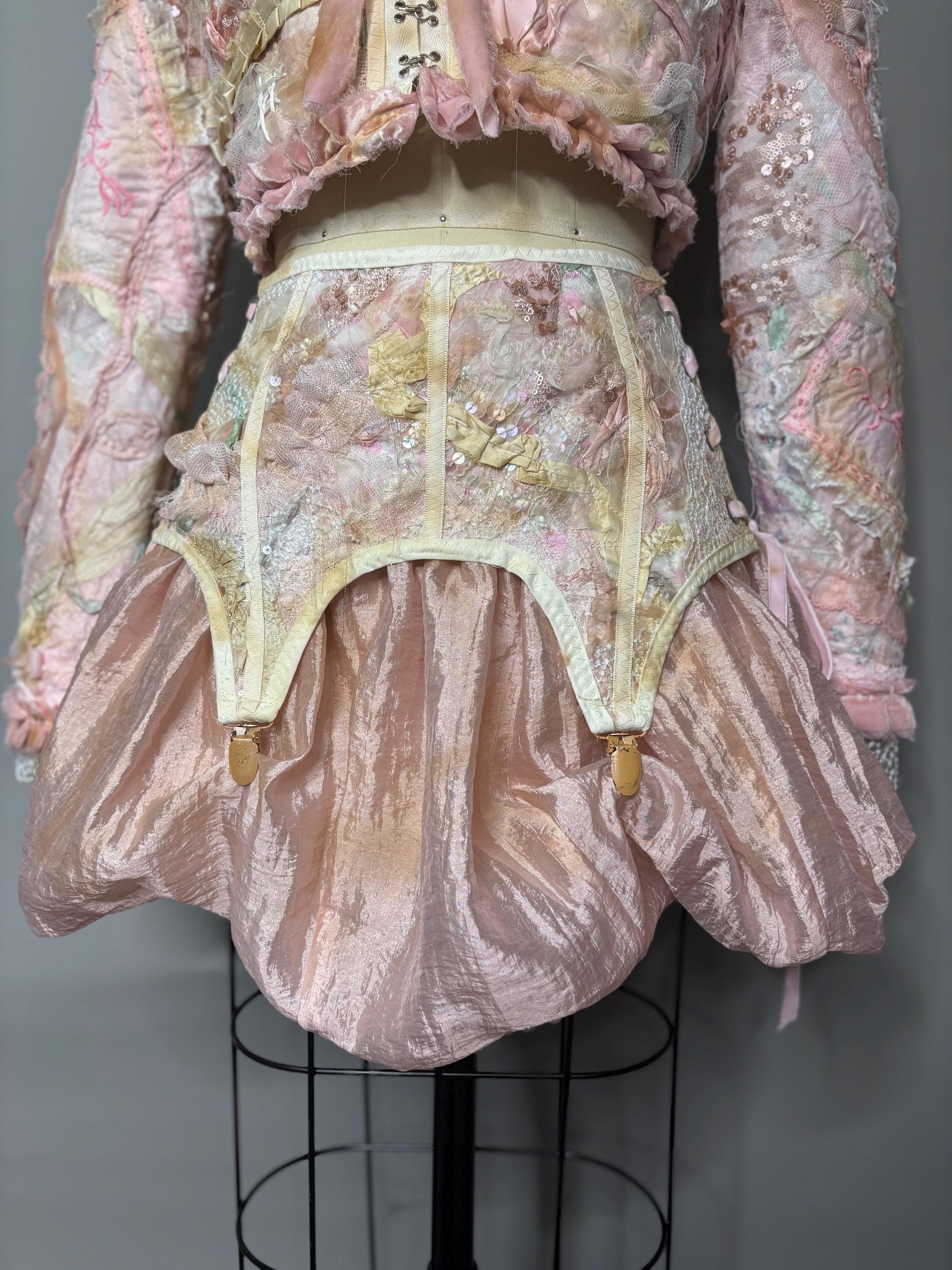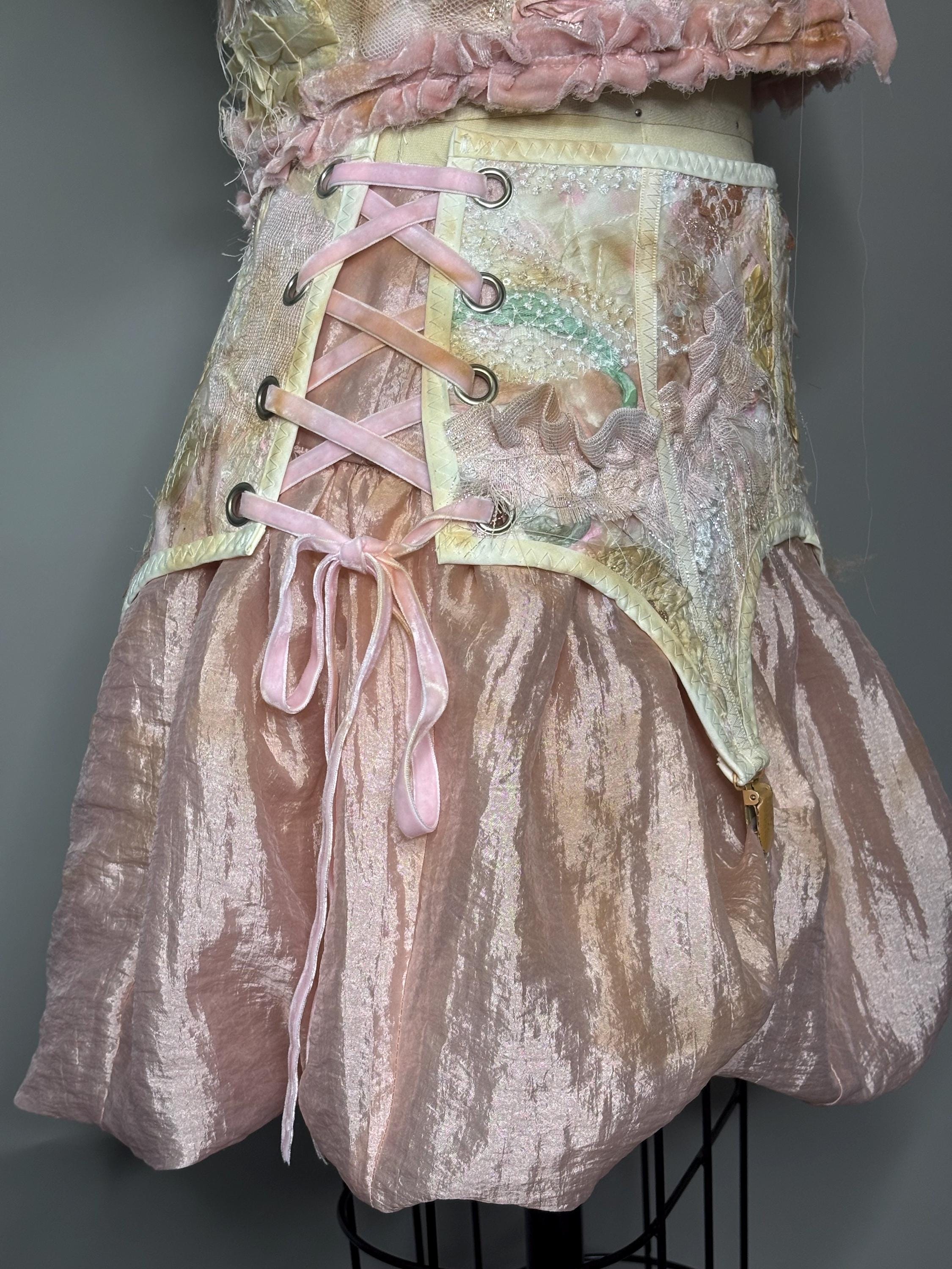 Textured, patchwork garter skirt with extra large grommets and vintage taffeta under skirt. Garter is a mix of wool, mesh, silk, and other vintage materials. Pink underskirt has asymmetrical bubble hem and zip back closure. Sits a little lower on the waist.