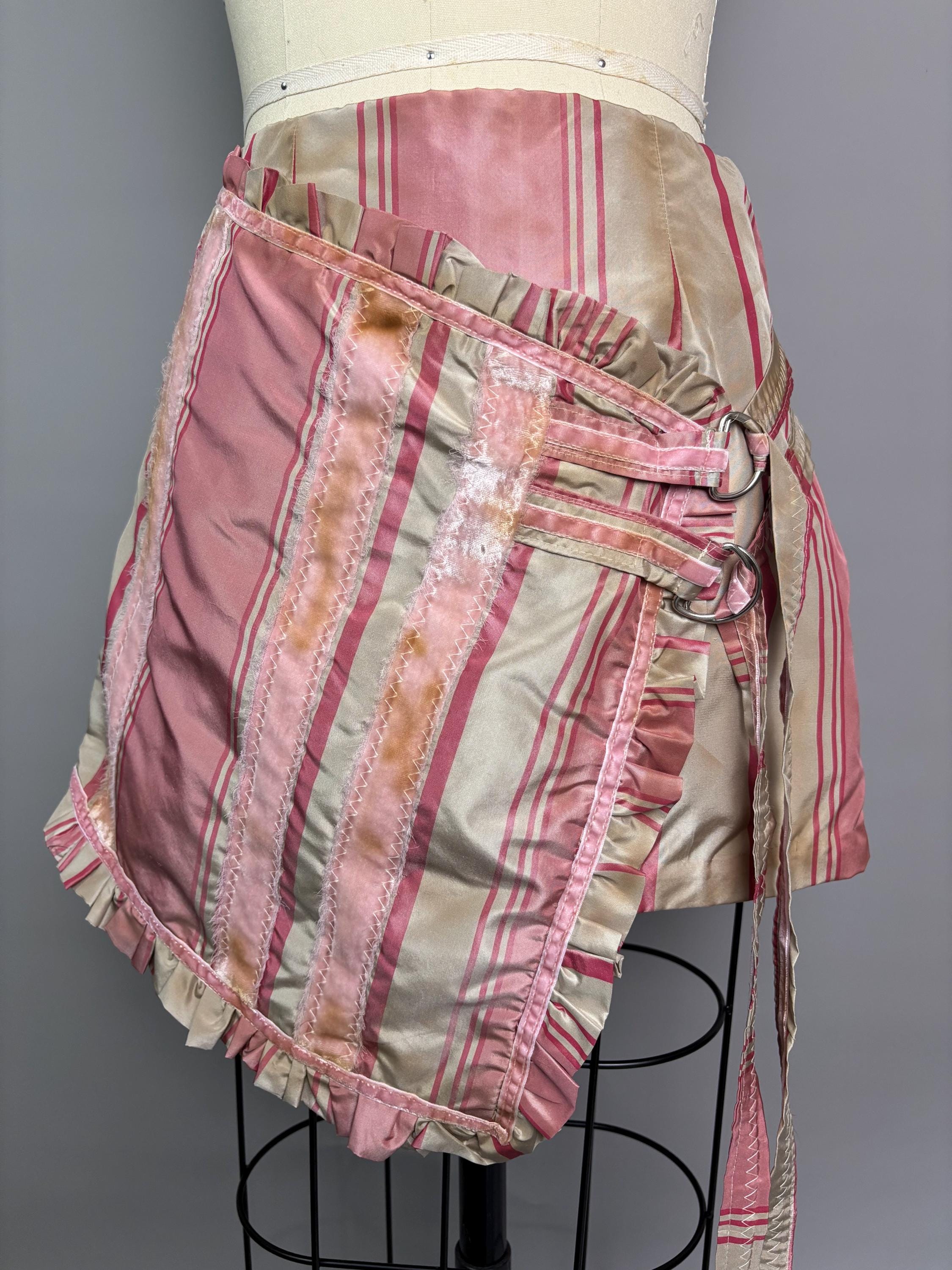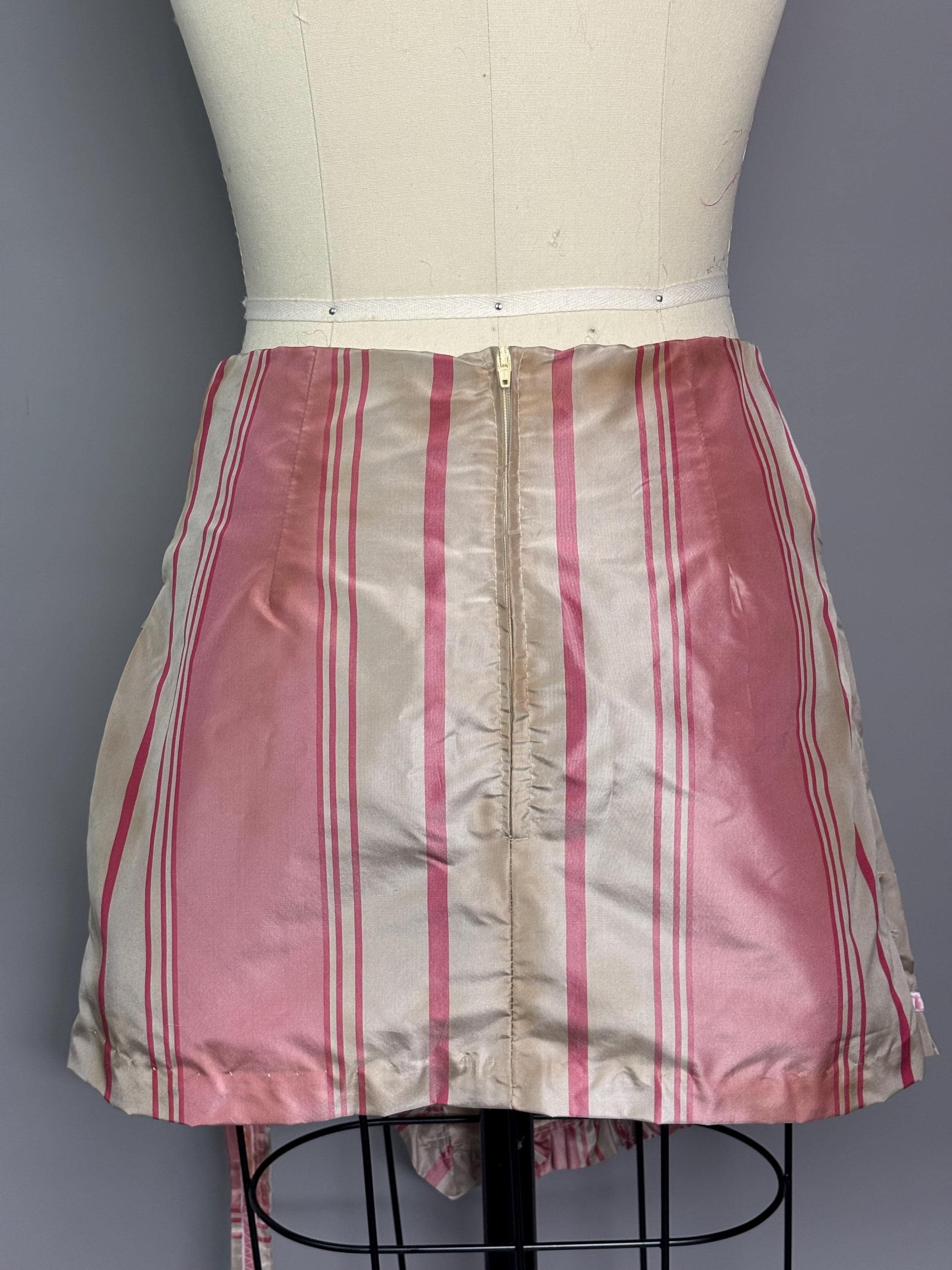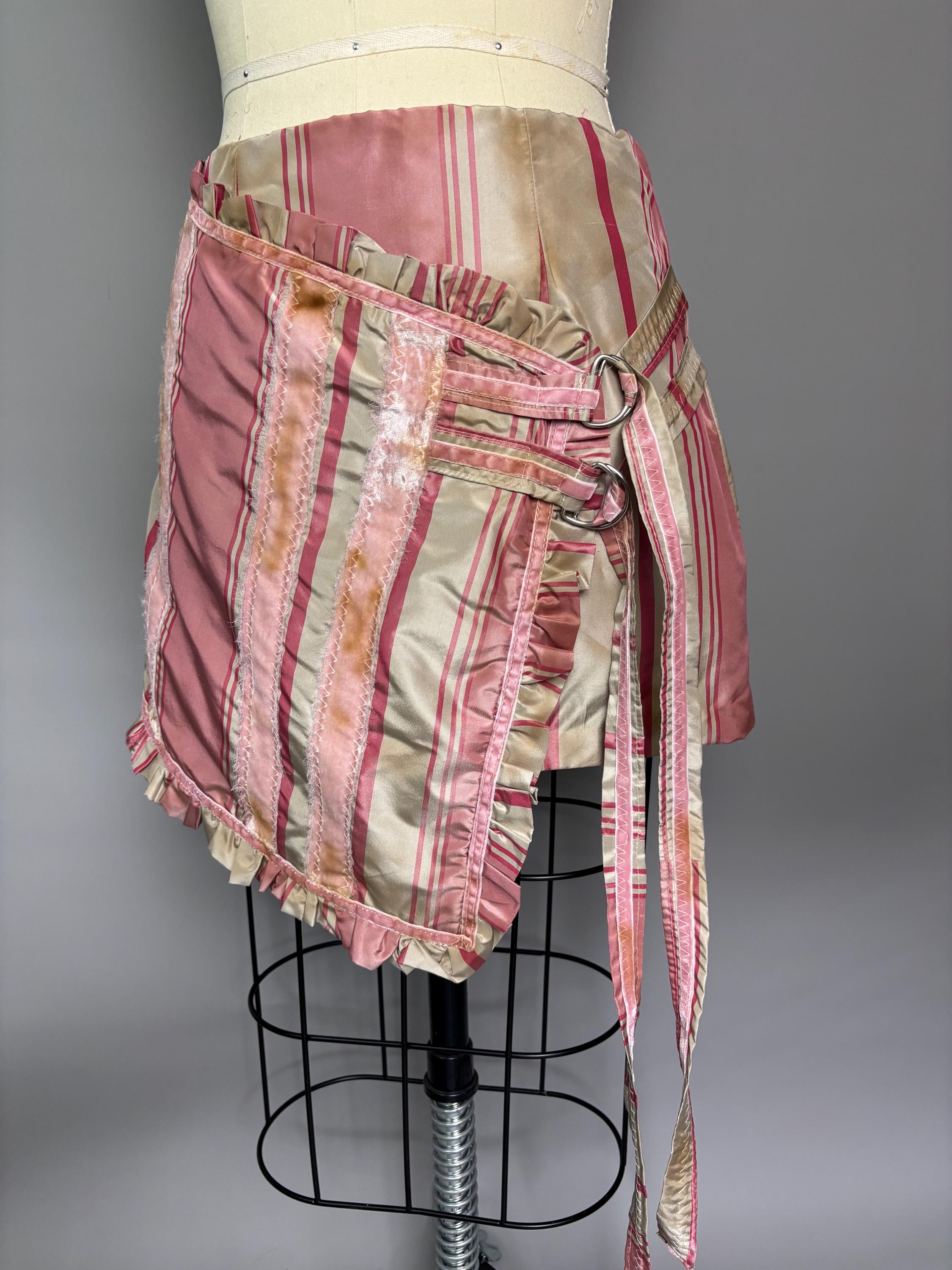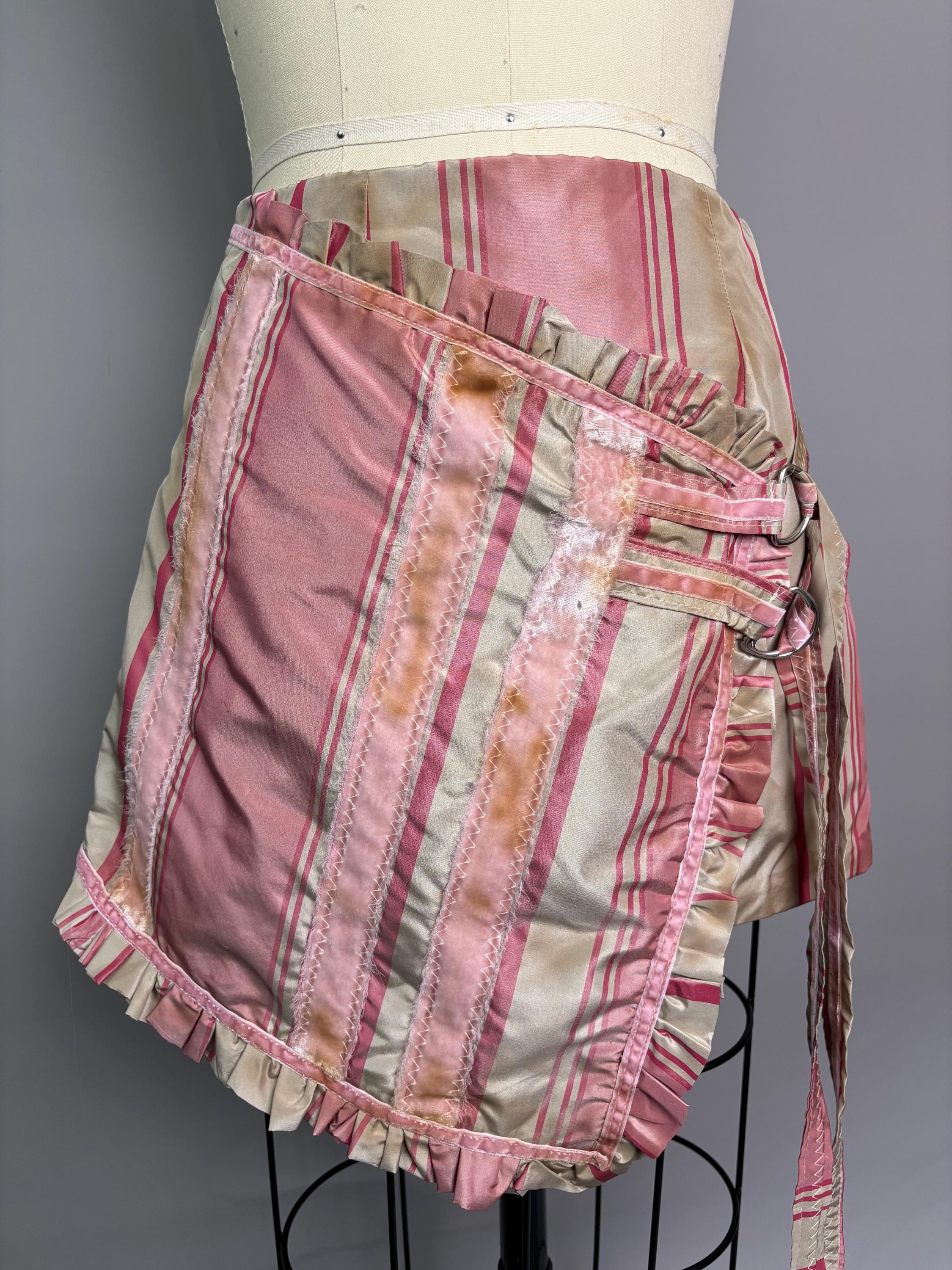 Pink silk striped skirt with velvet accents, faux wrap closure and d-ring detailing. Fully lined, beautifully distressed. Sits a little lower on the waist.