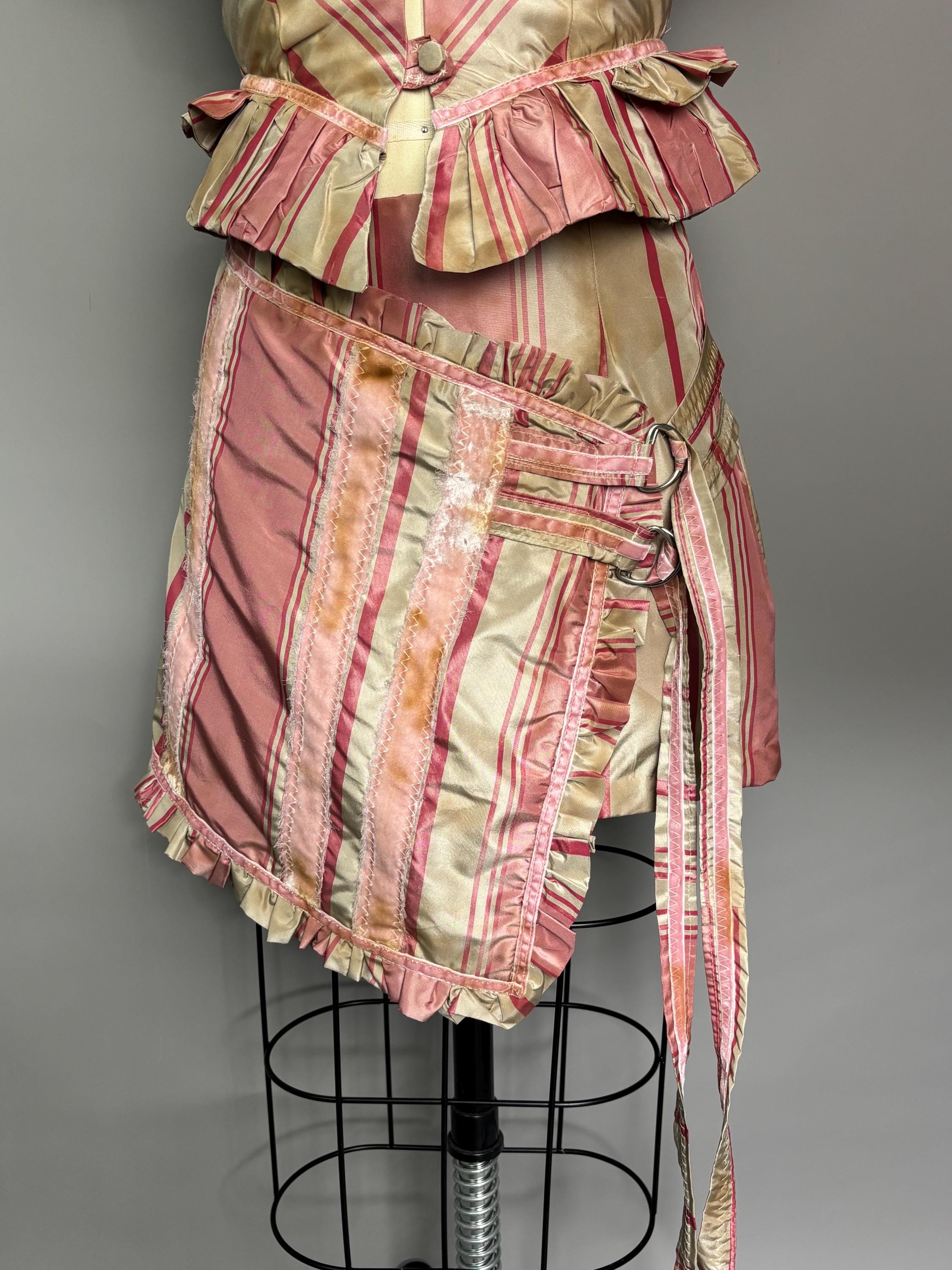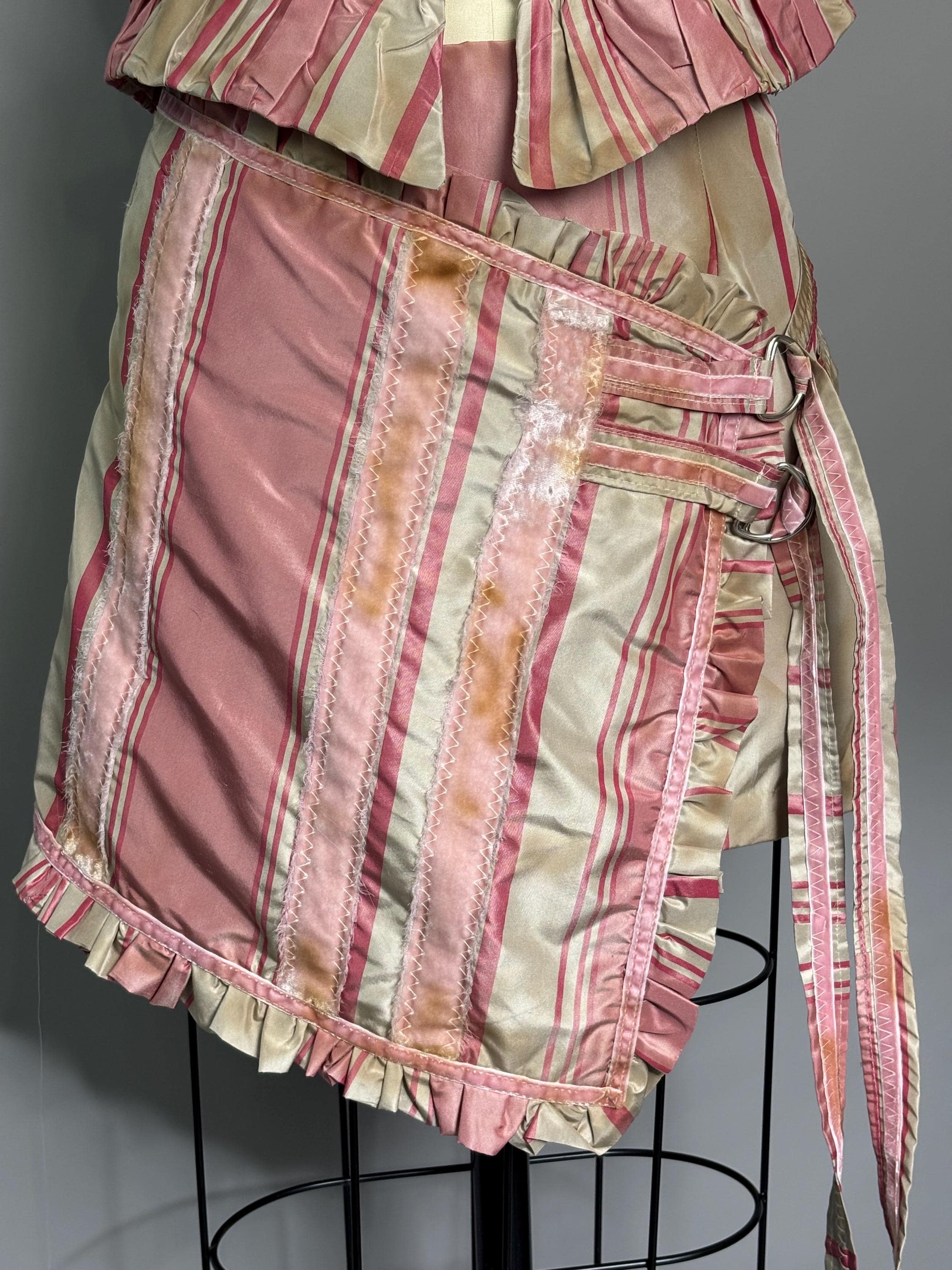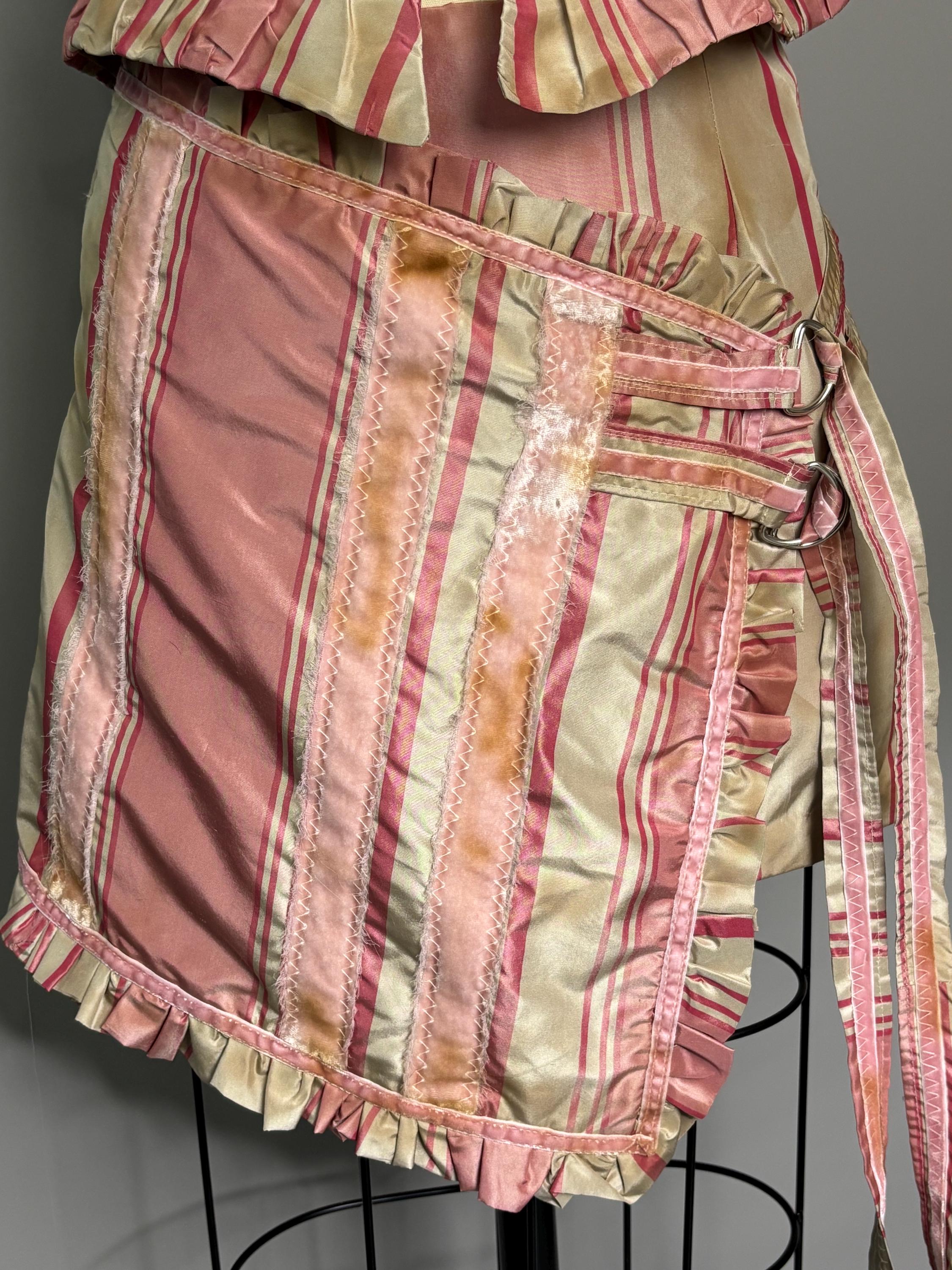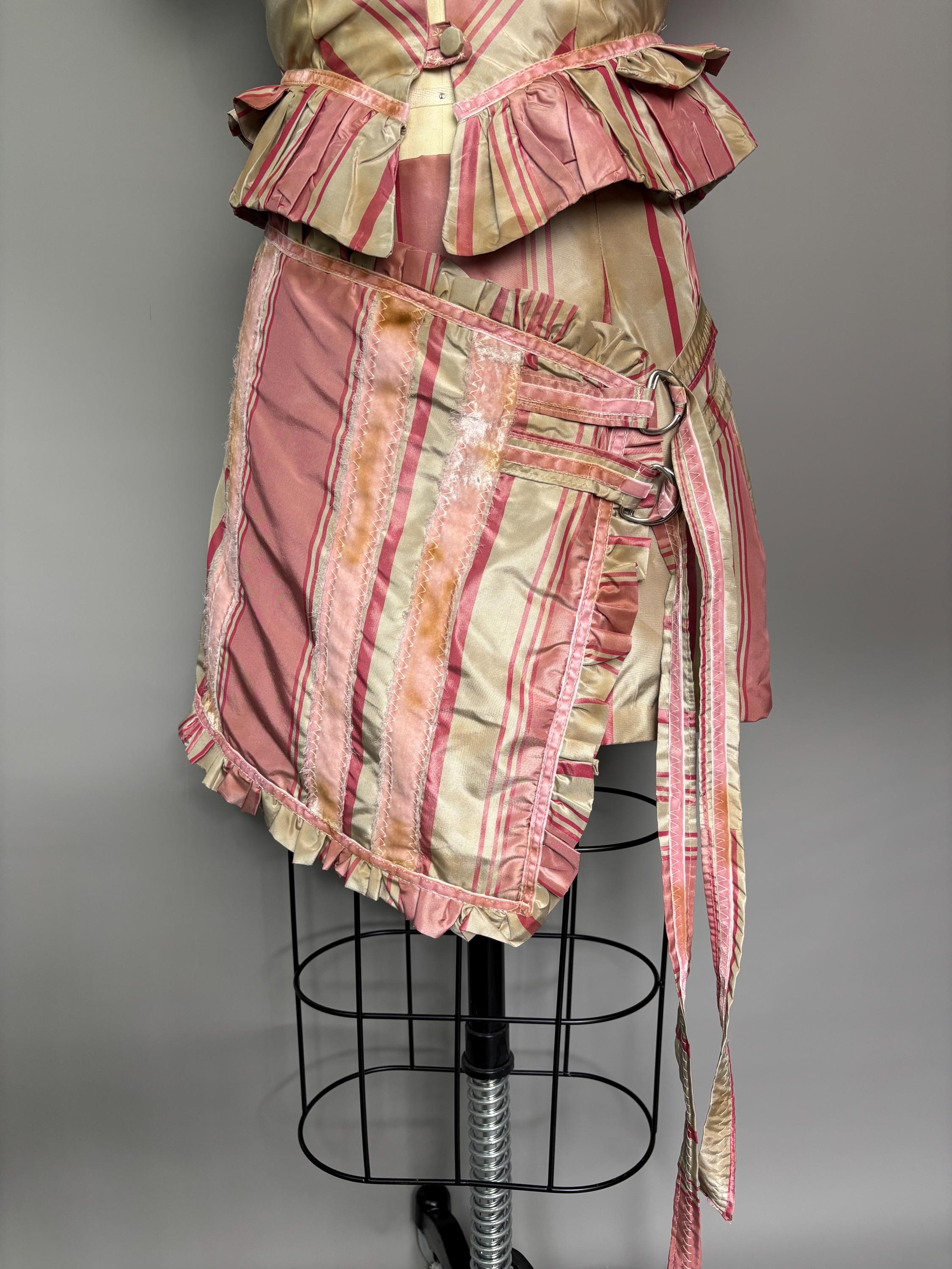 Pink silk striped skirt with velvet accents, faux wrap closure and d-ring detailing. Fully lined, beautifully distressed. Sits a little lower on the waist.