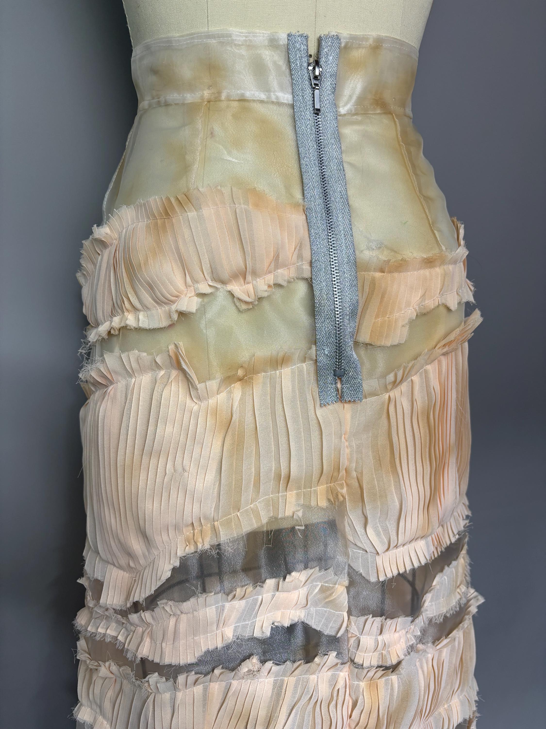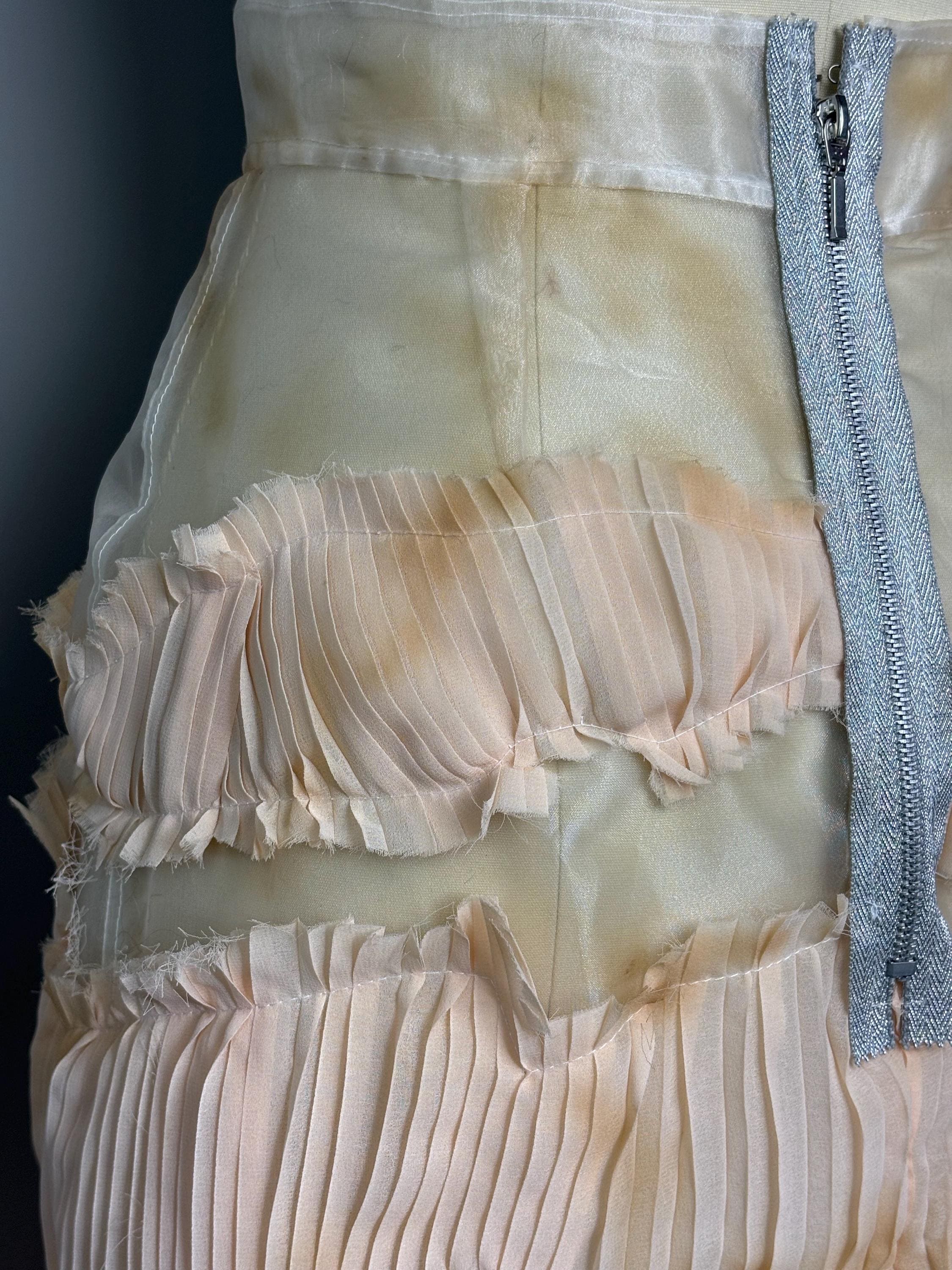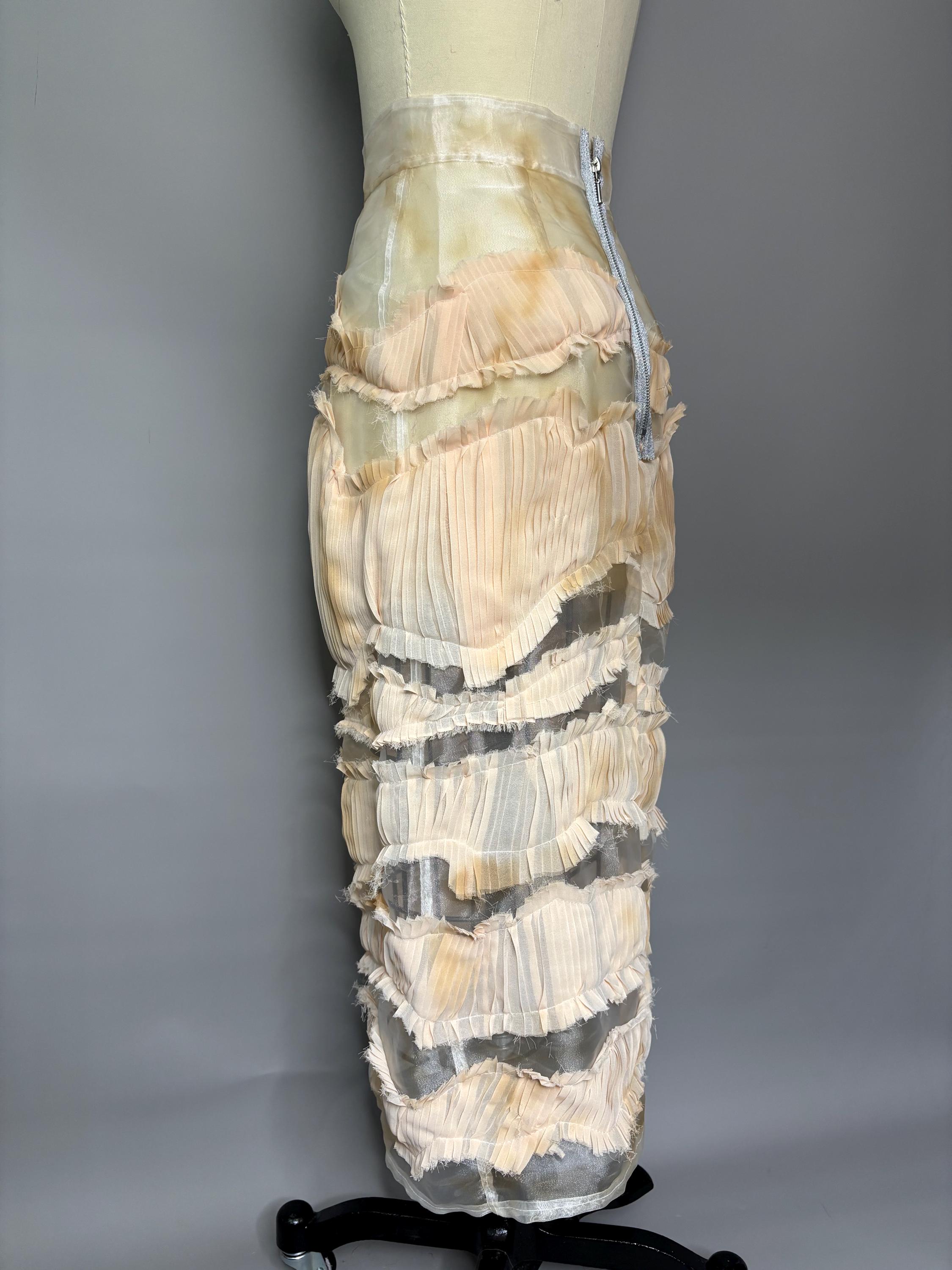 Sheer organza midi skirt with distressed pleated “stripes” and metallic zip closure.