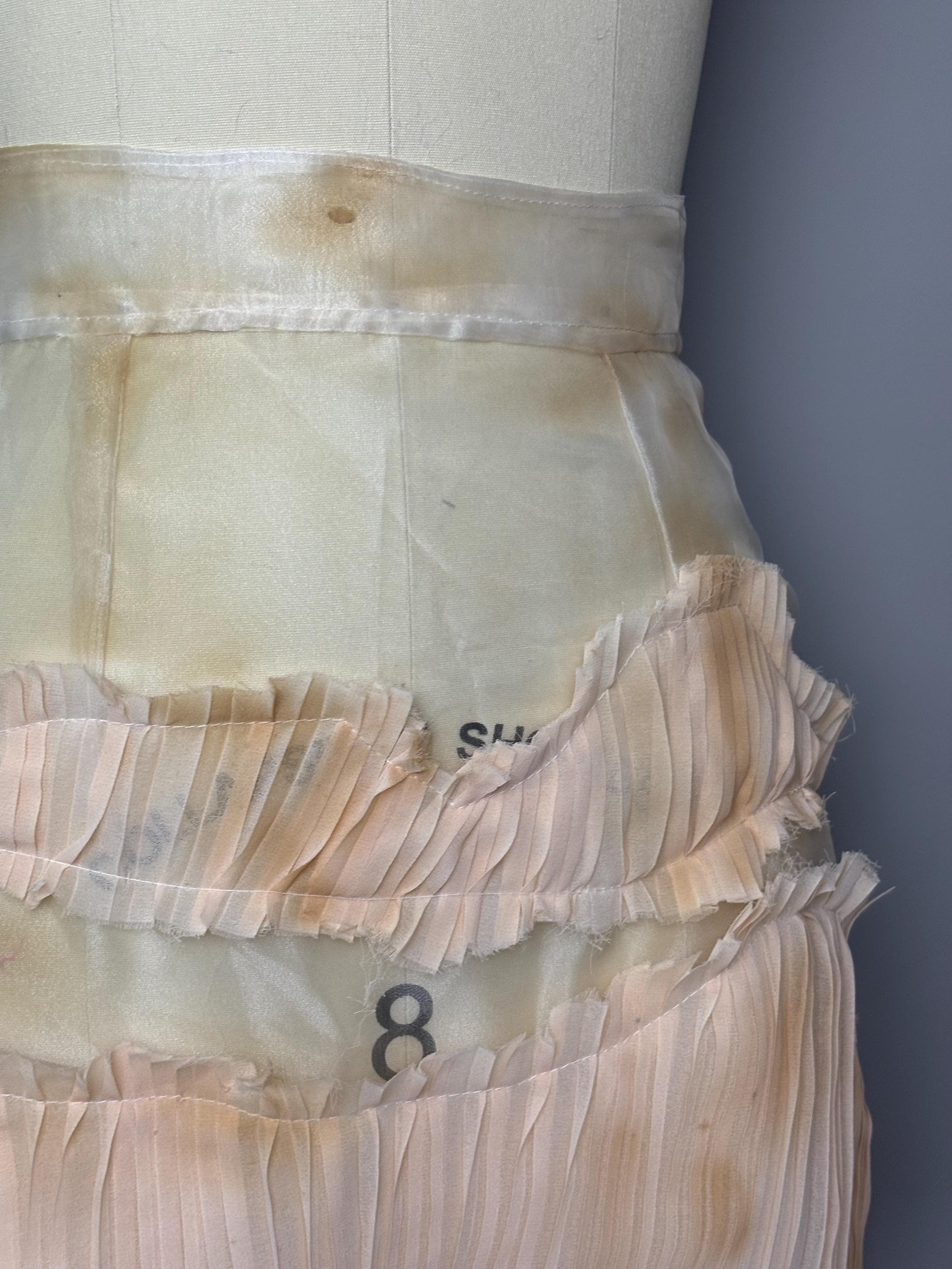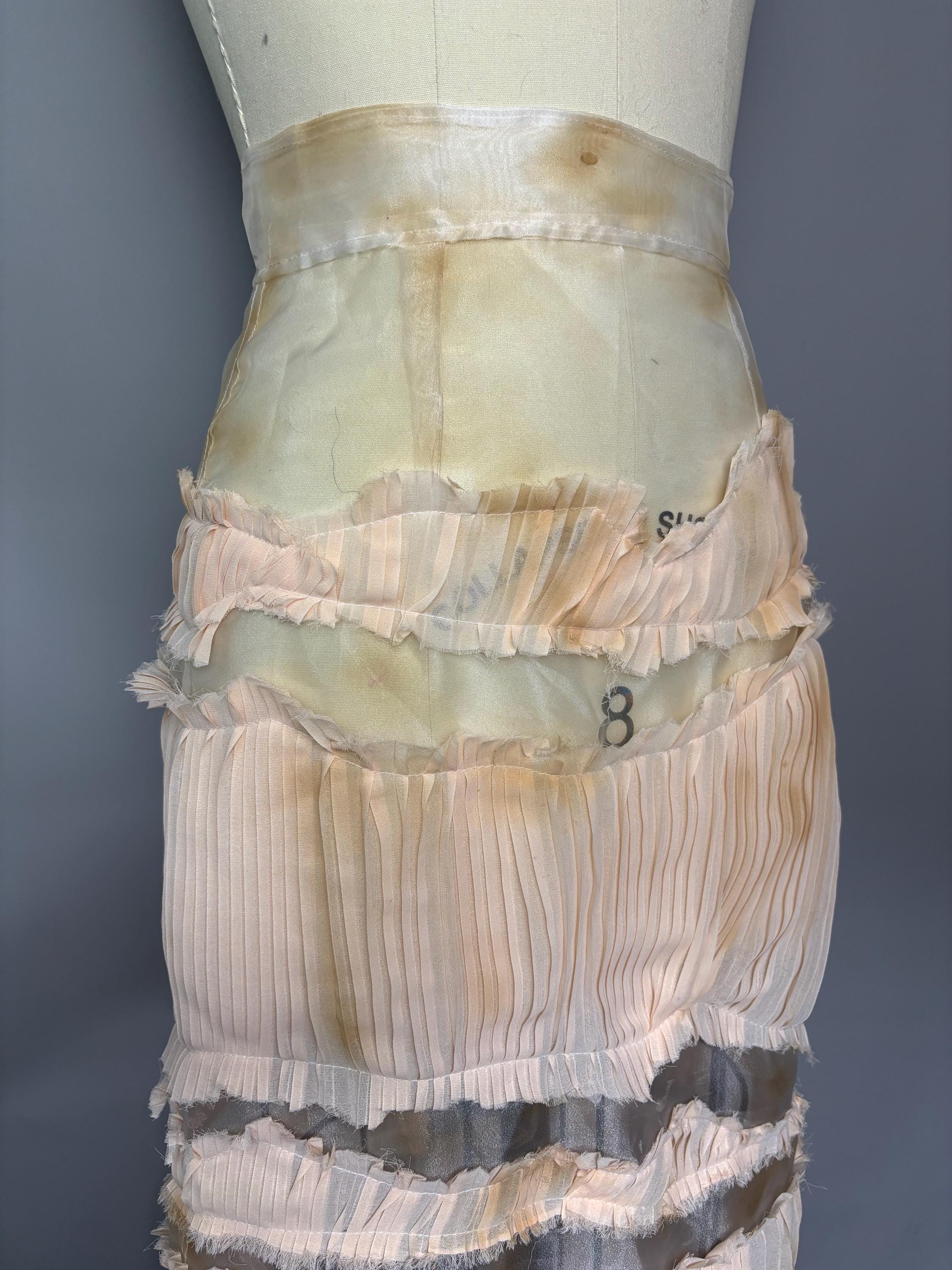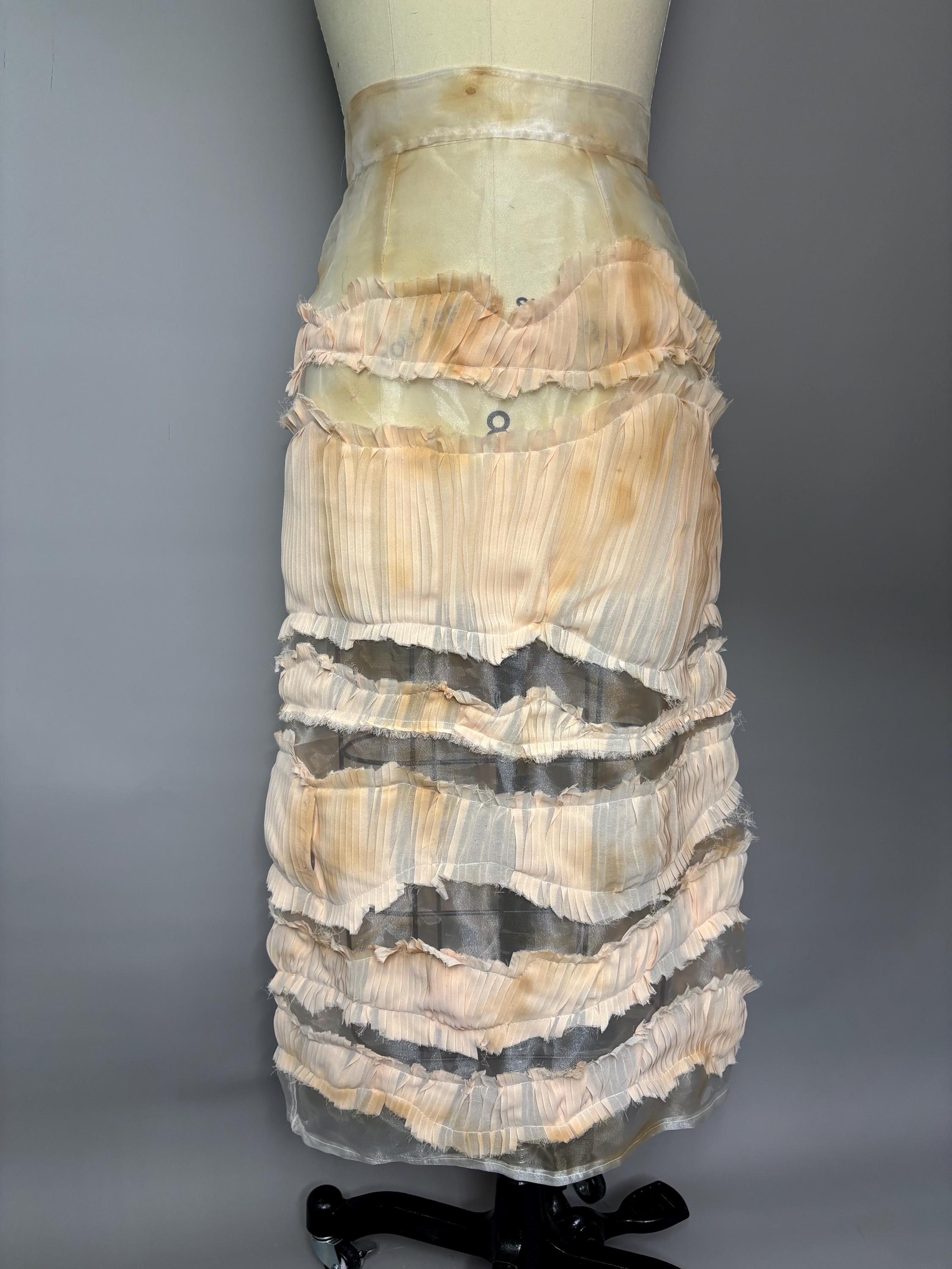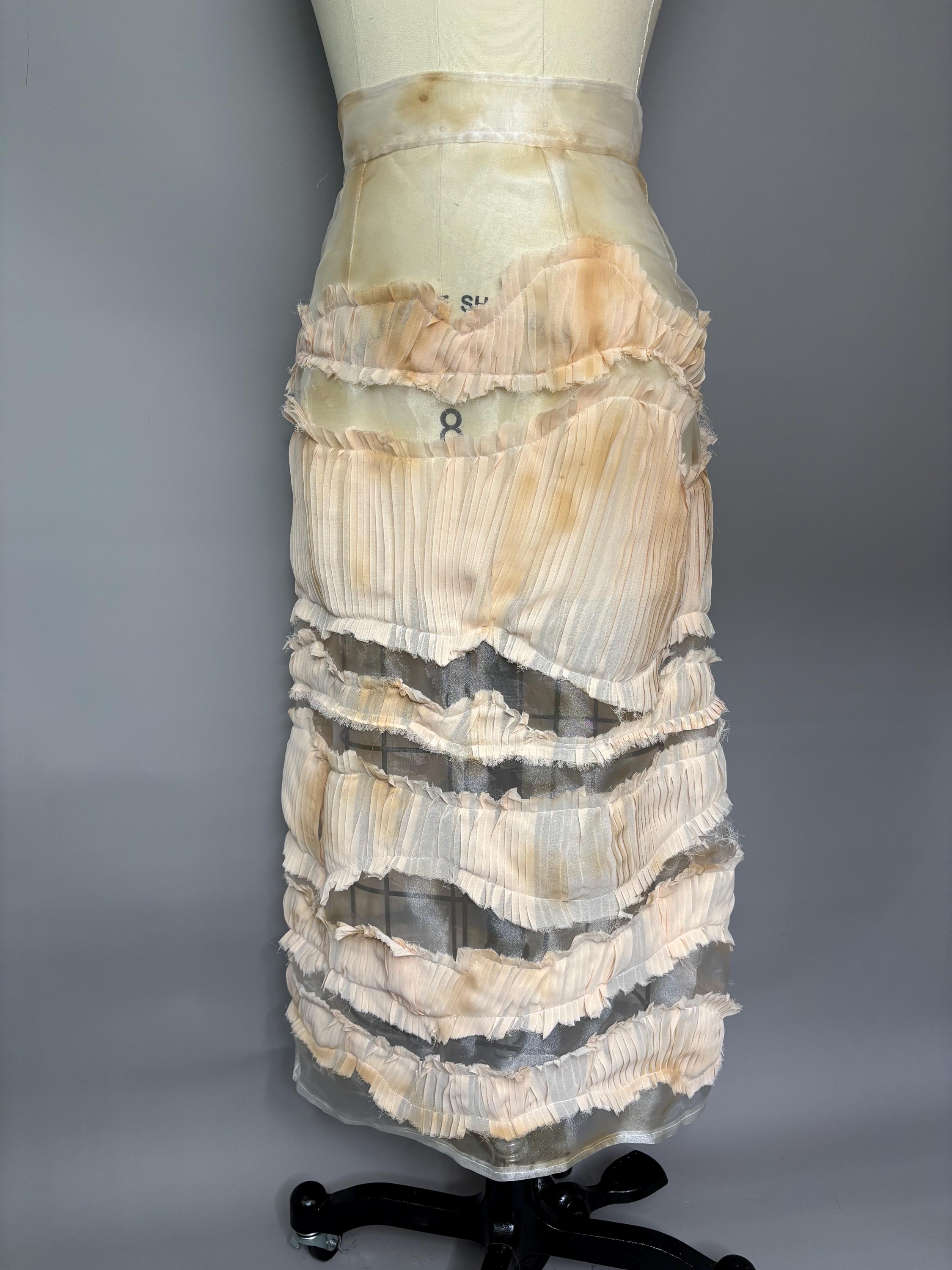 Sheer organza midi skirt with distressed pleated “stripes” and metallic zip closure.