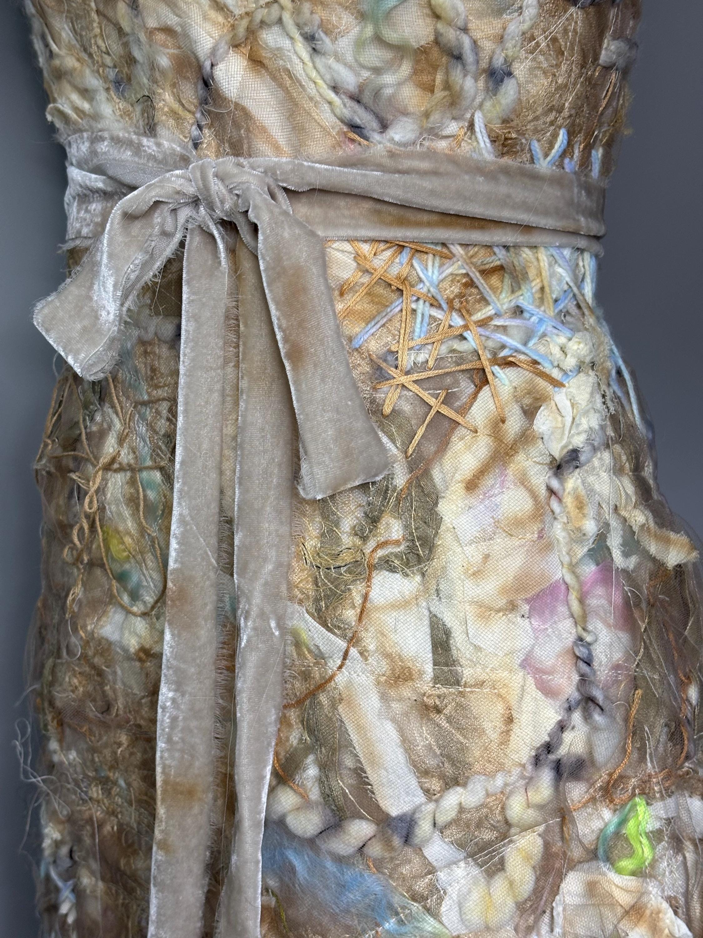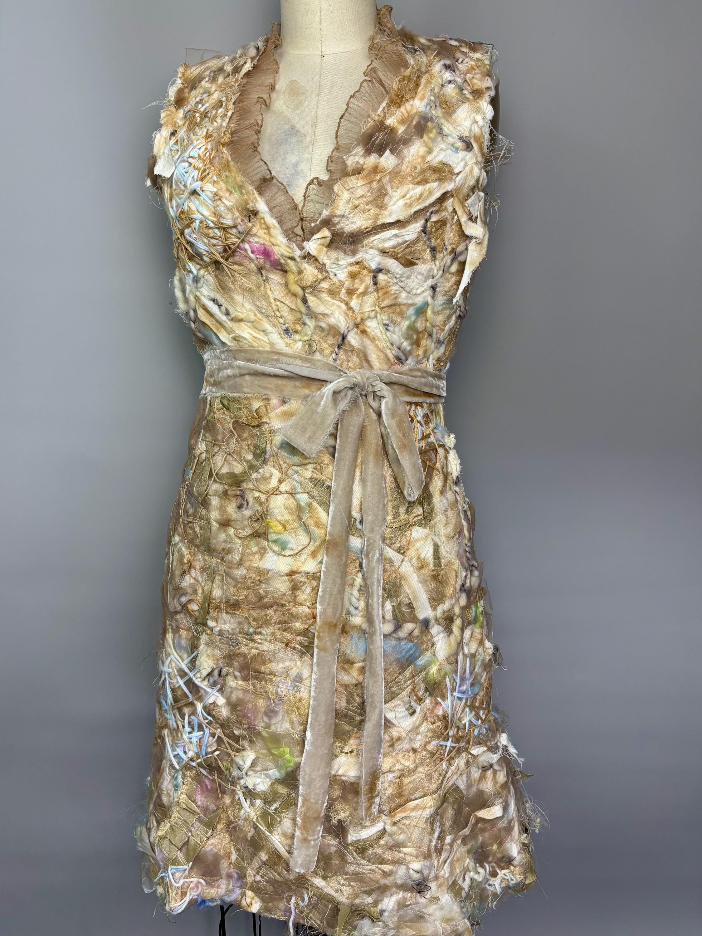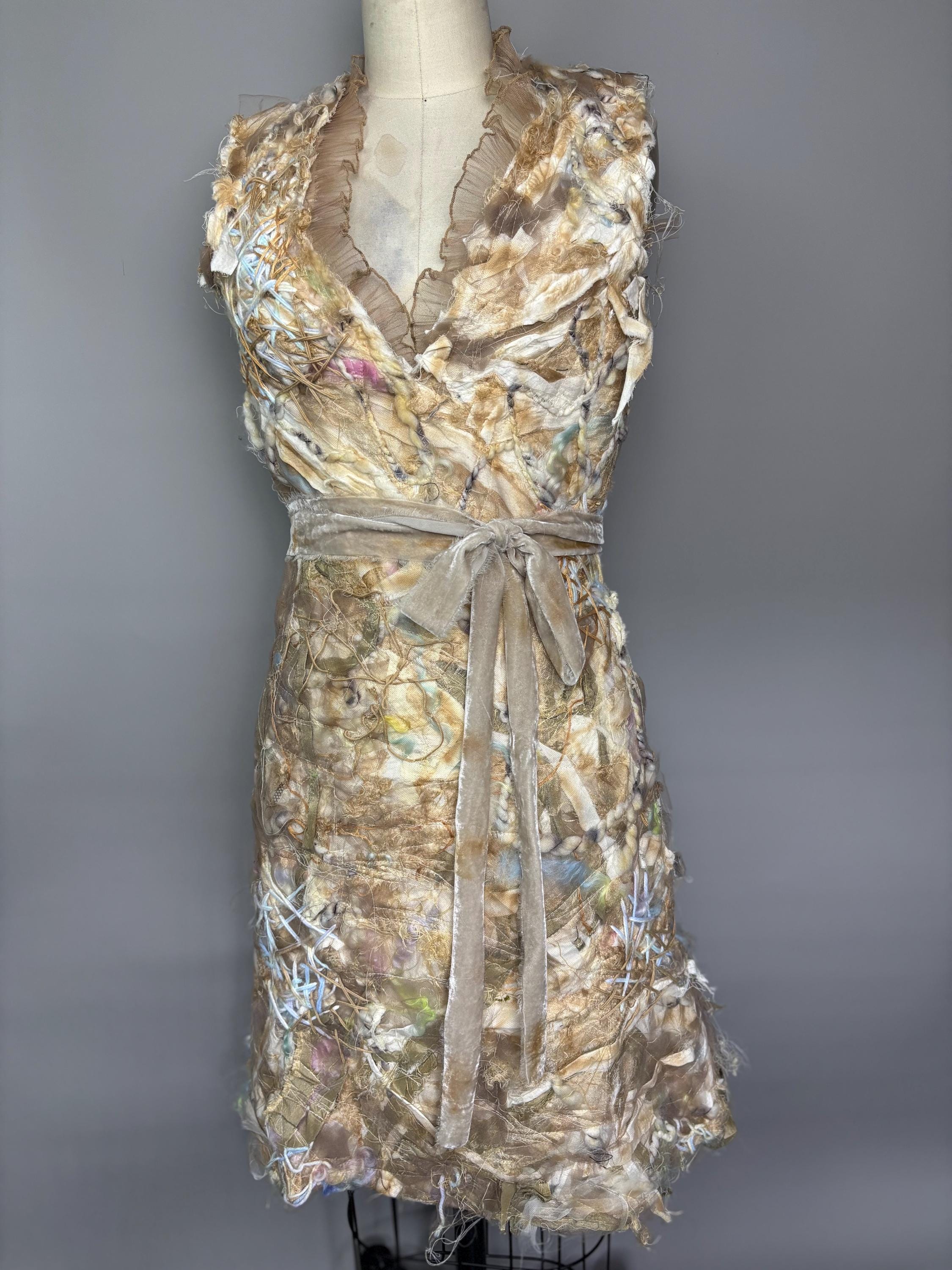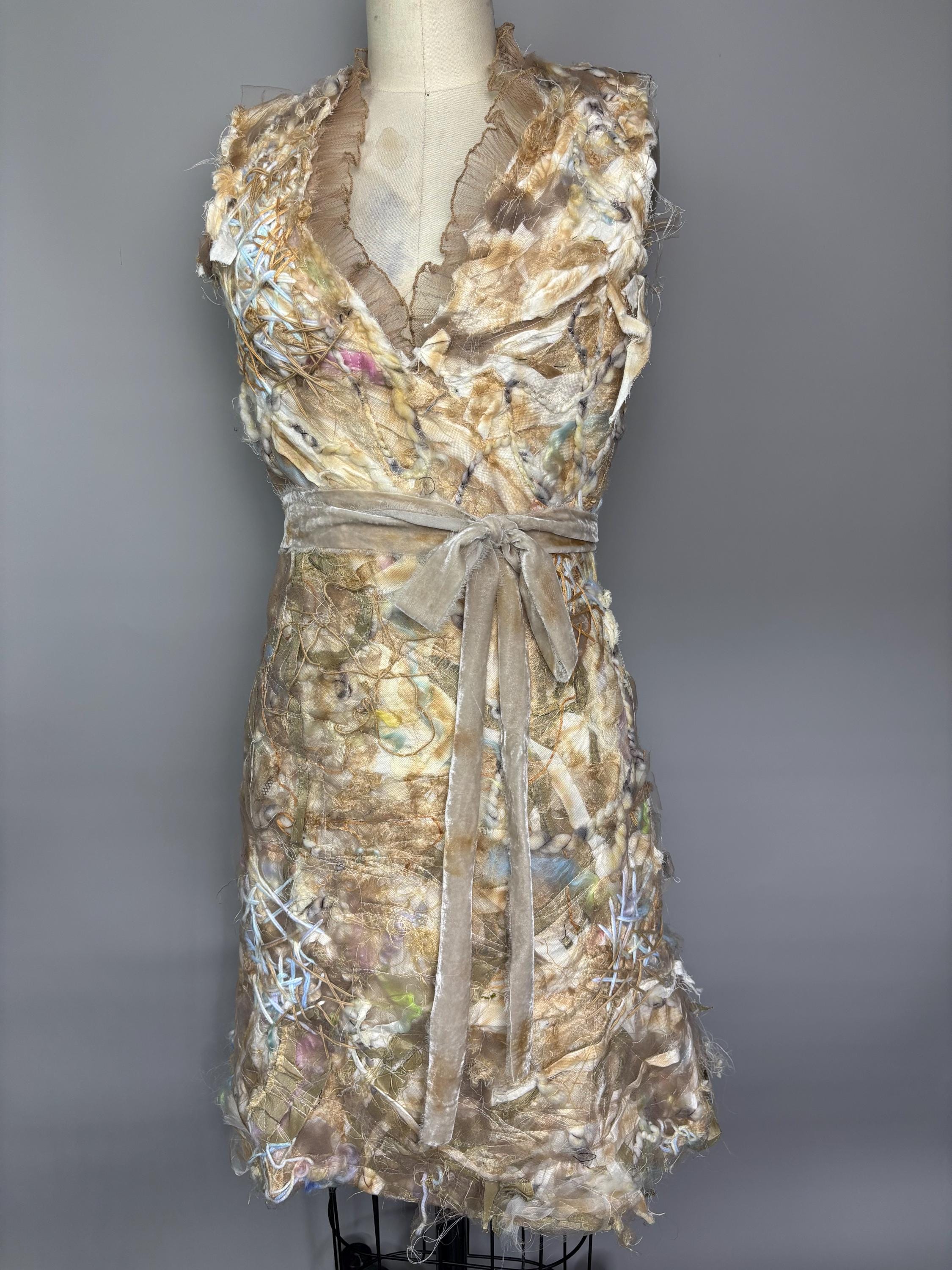 Textured and felted Bodycon min dress with piles of silk, wool, string, ribbons and tulle. Trimmed with beige sheer ruffles and removable velvet bow belt. Dress has zip back closure and a slightly rough lining made of leftover fabric remnants. Inside doesn’t effect the outside fit. I’ve never been made before, and I won’t be made again. Price reflects.