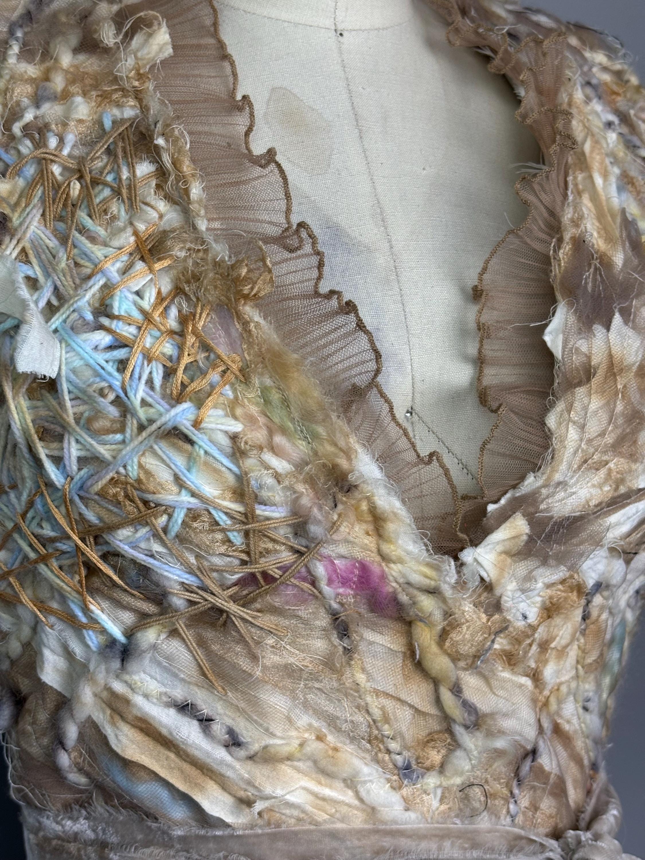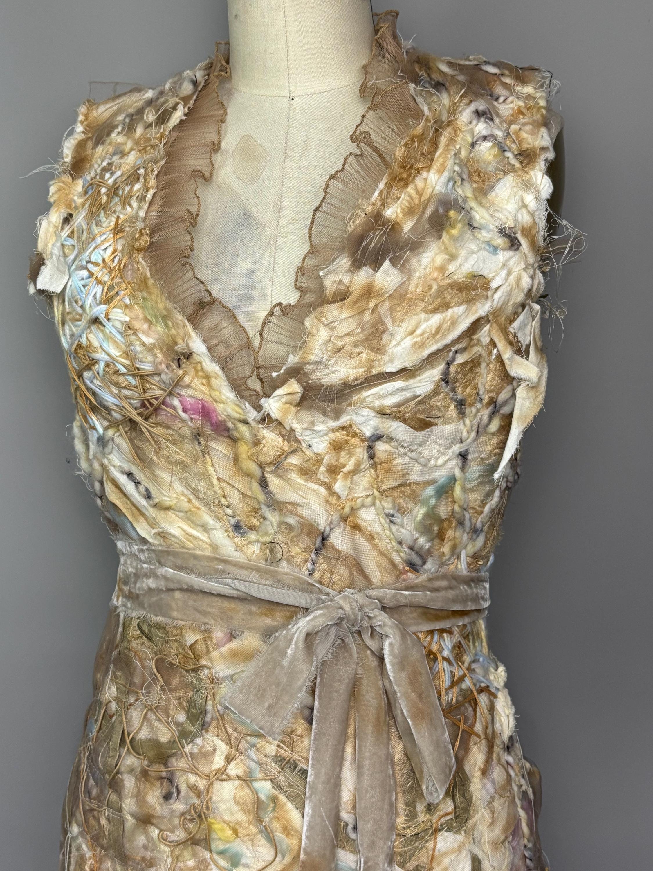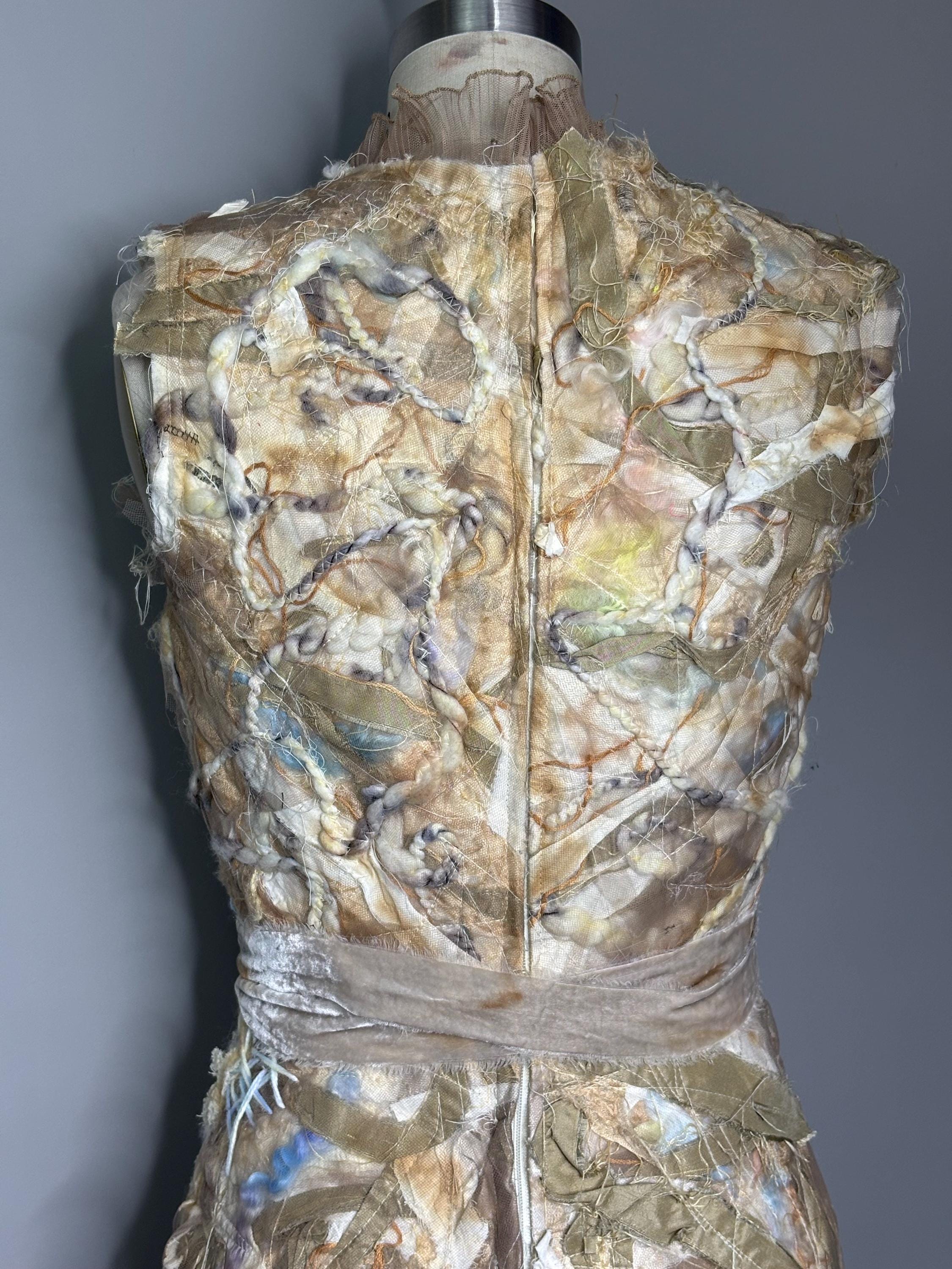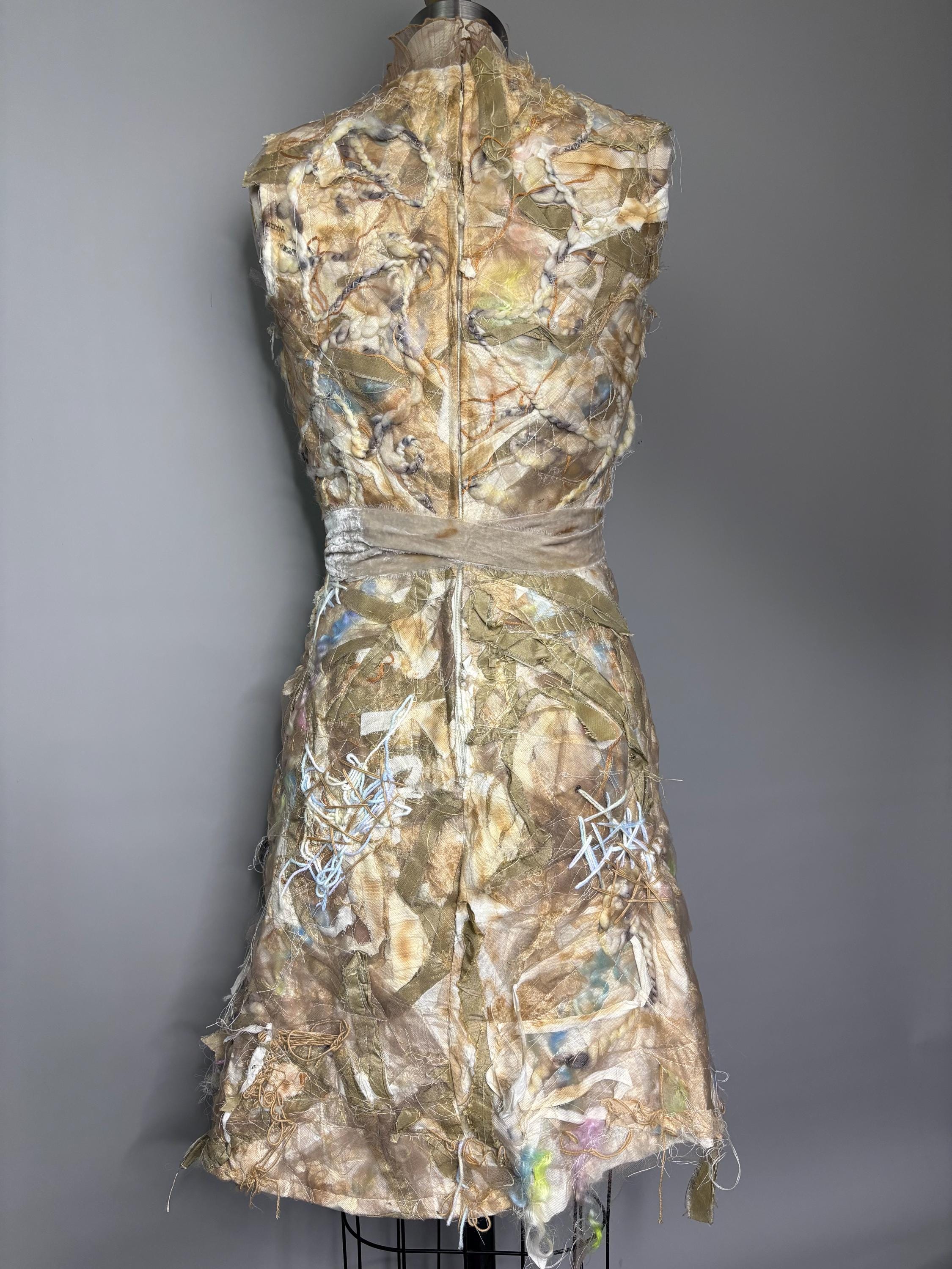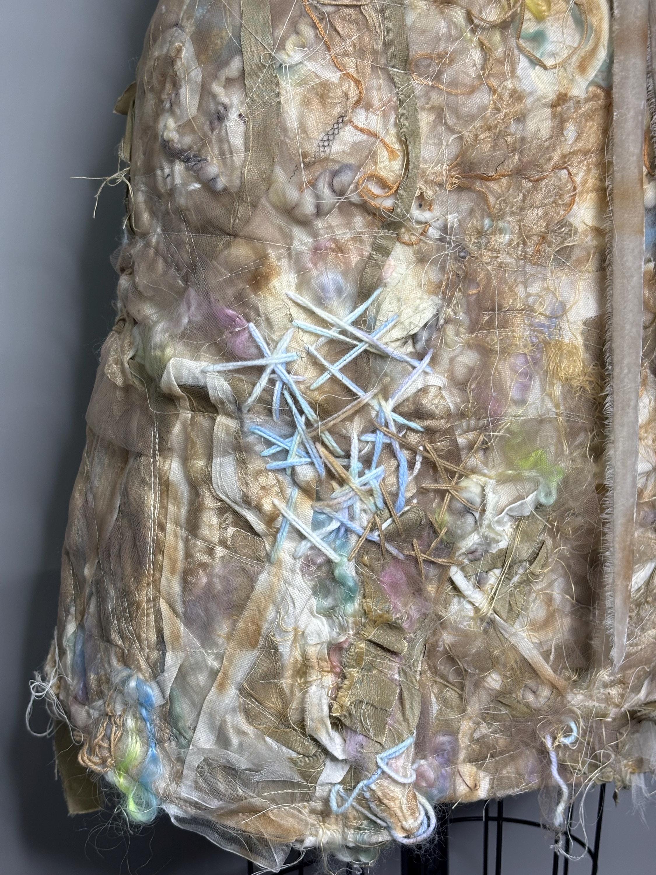 Textured and felted Bodycon min dress with piles of silk, wool, string, ribbons and tulle. Trimmed with beige sheer ruffles and removable velvet bow belt. Dress has zip back closure and a slightly rough lining made of leftover fabric remnants. Inside doesn’t effect the outside fit. I’ve never been made before, and I won’t be made again. Price reflects.