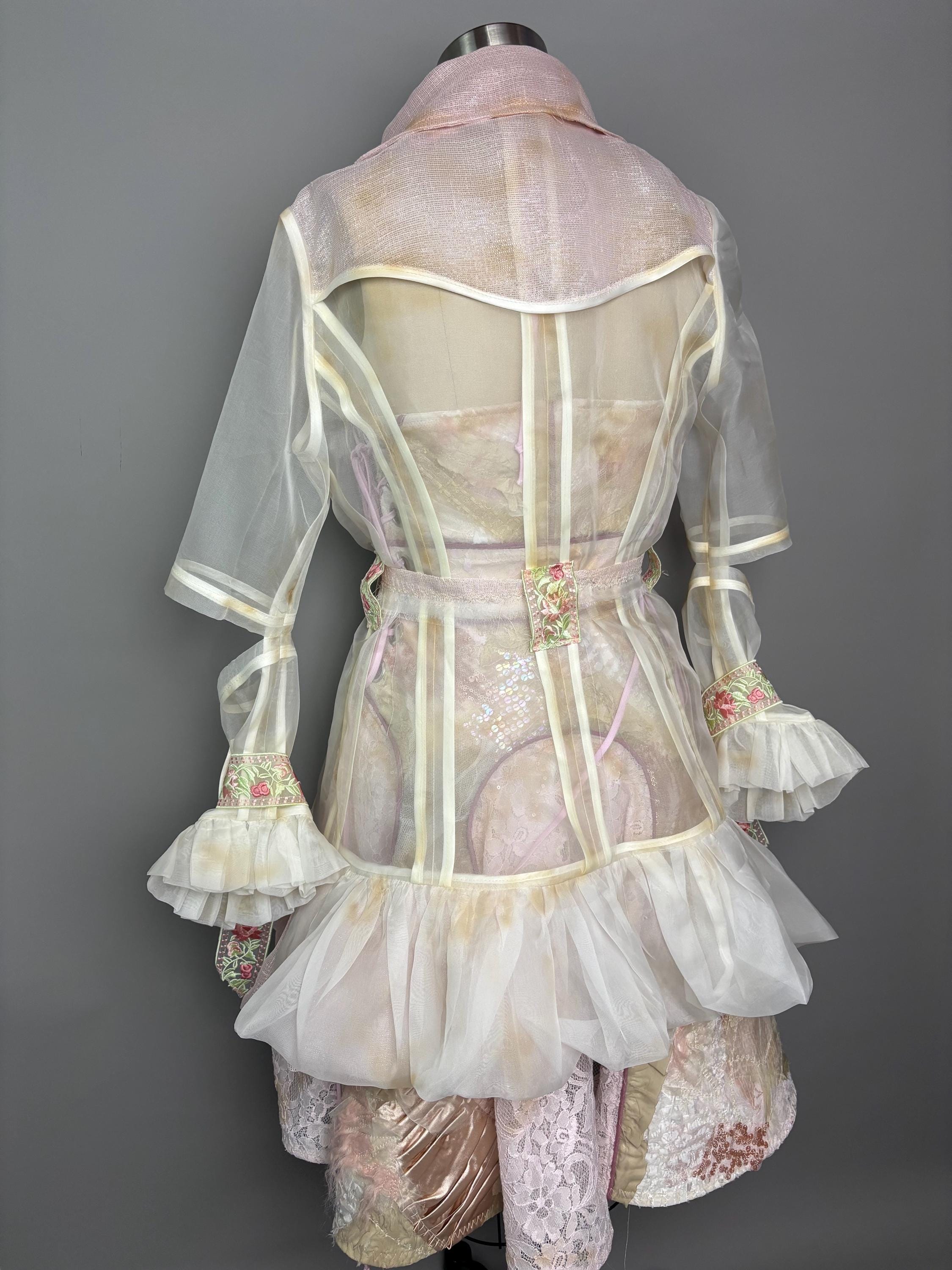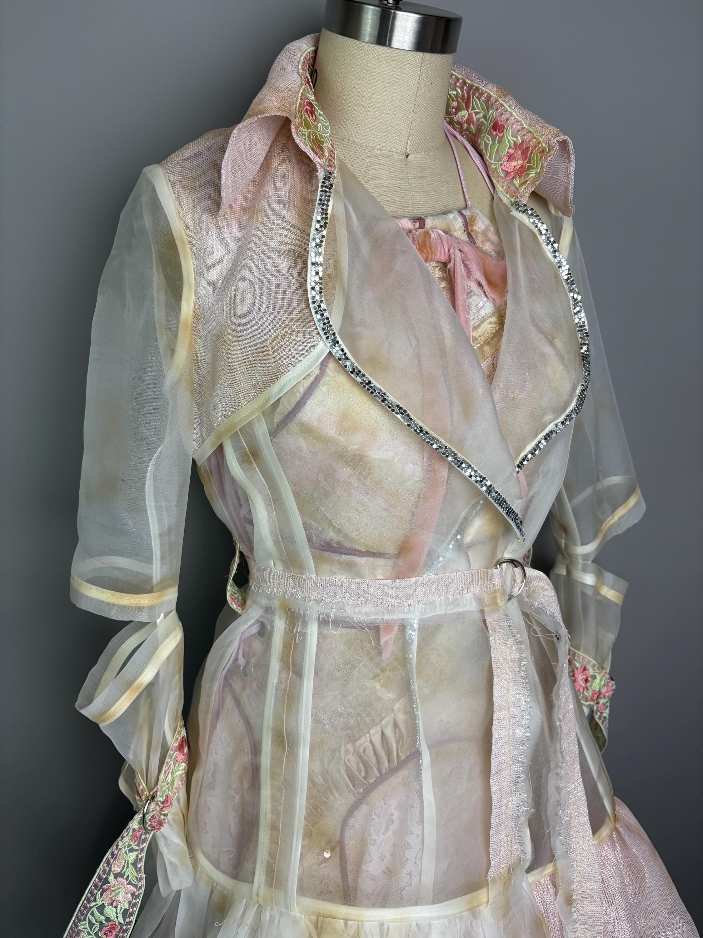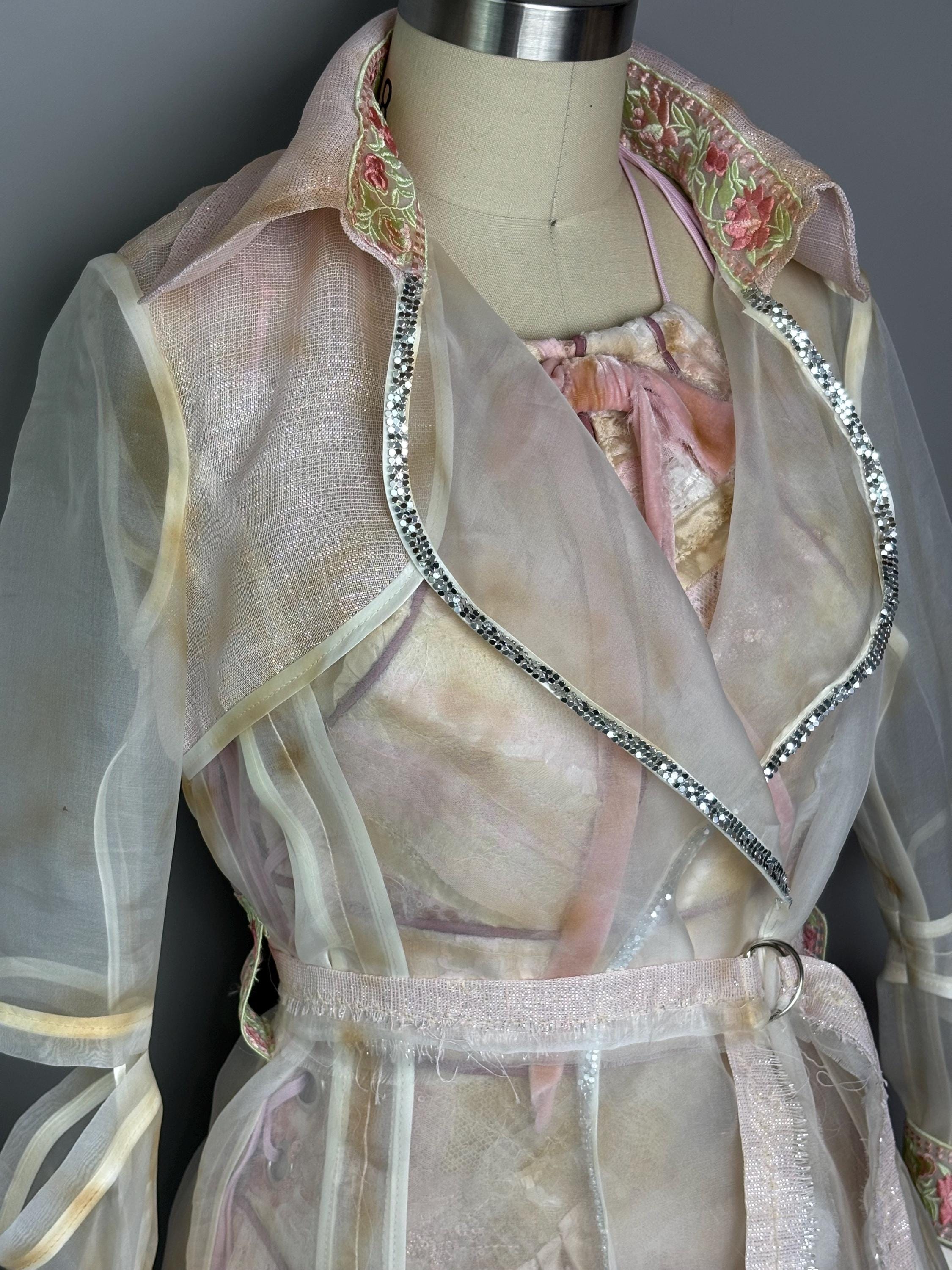 Distressed sheer silk jacket with pastel contrast detailing, “chain metal” trim and cut out sleeves. Jacket has no closure other than a tattered, raw edged D-ring belt.