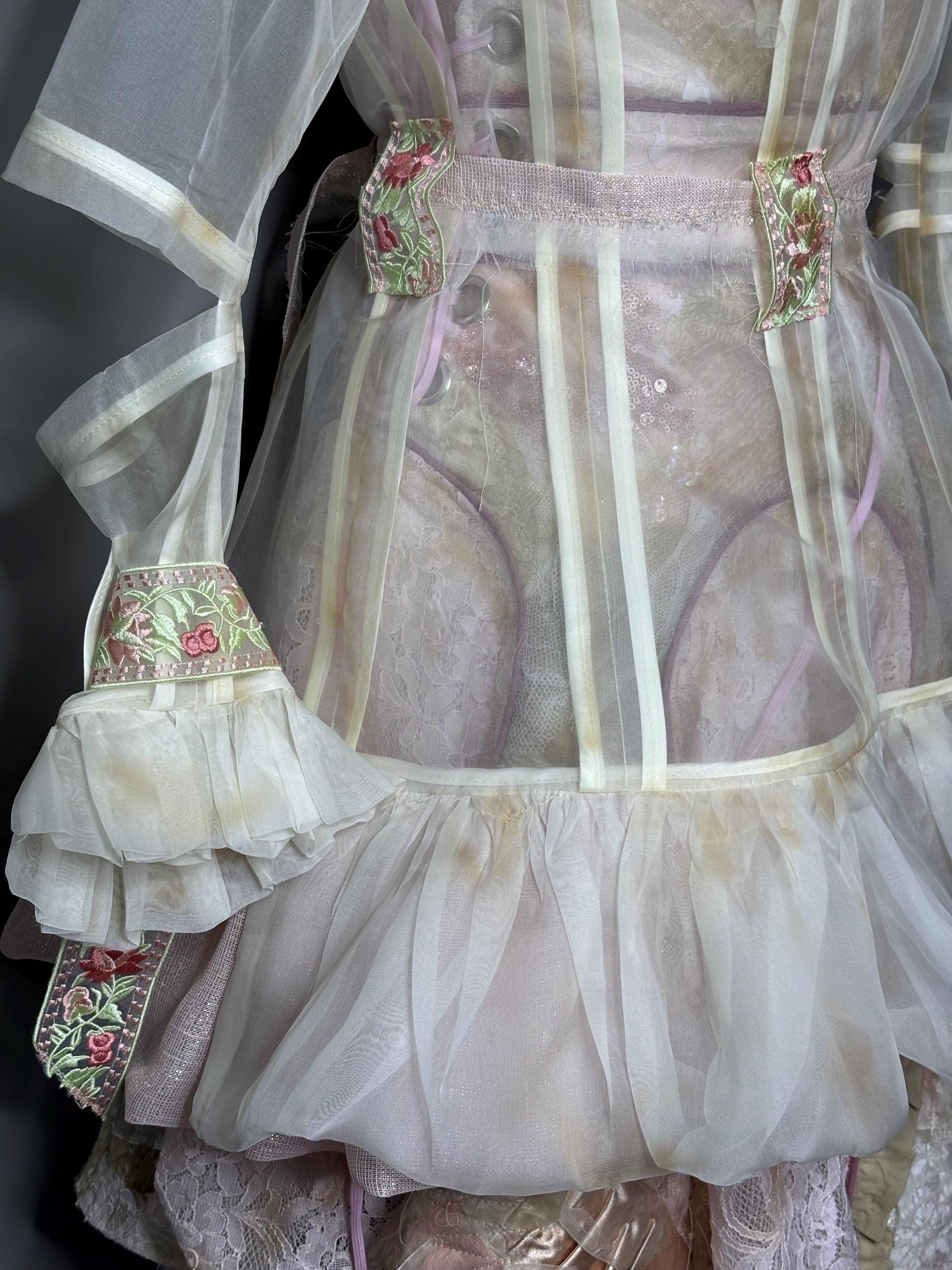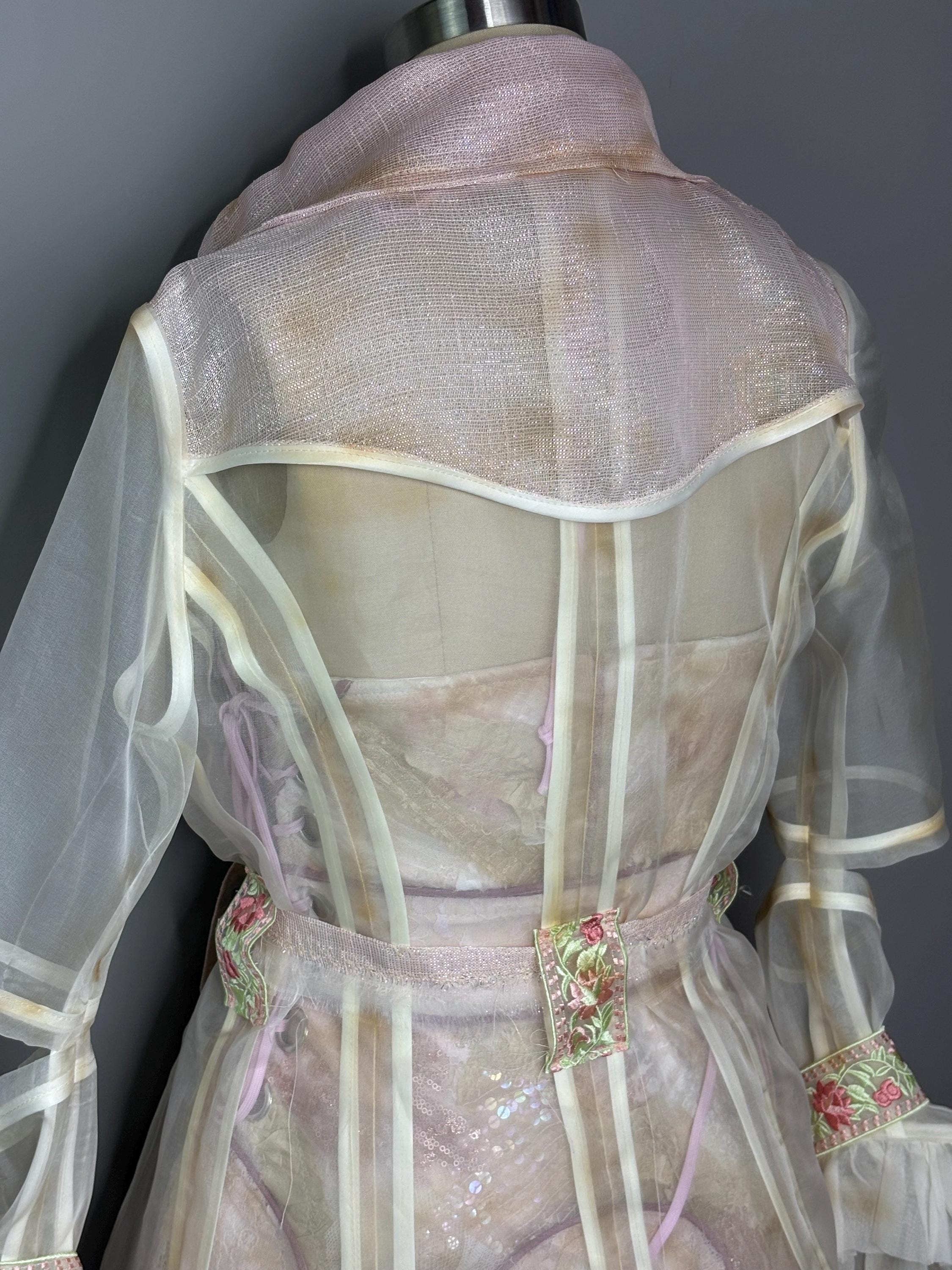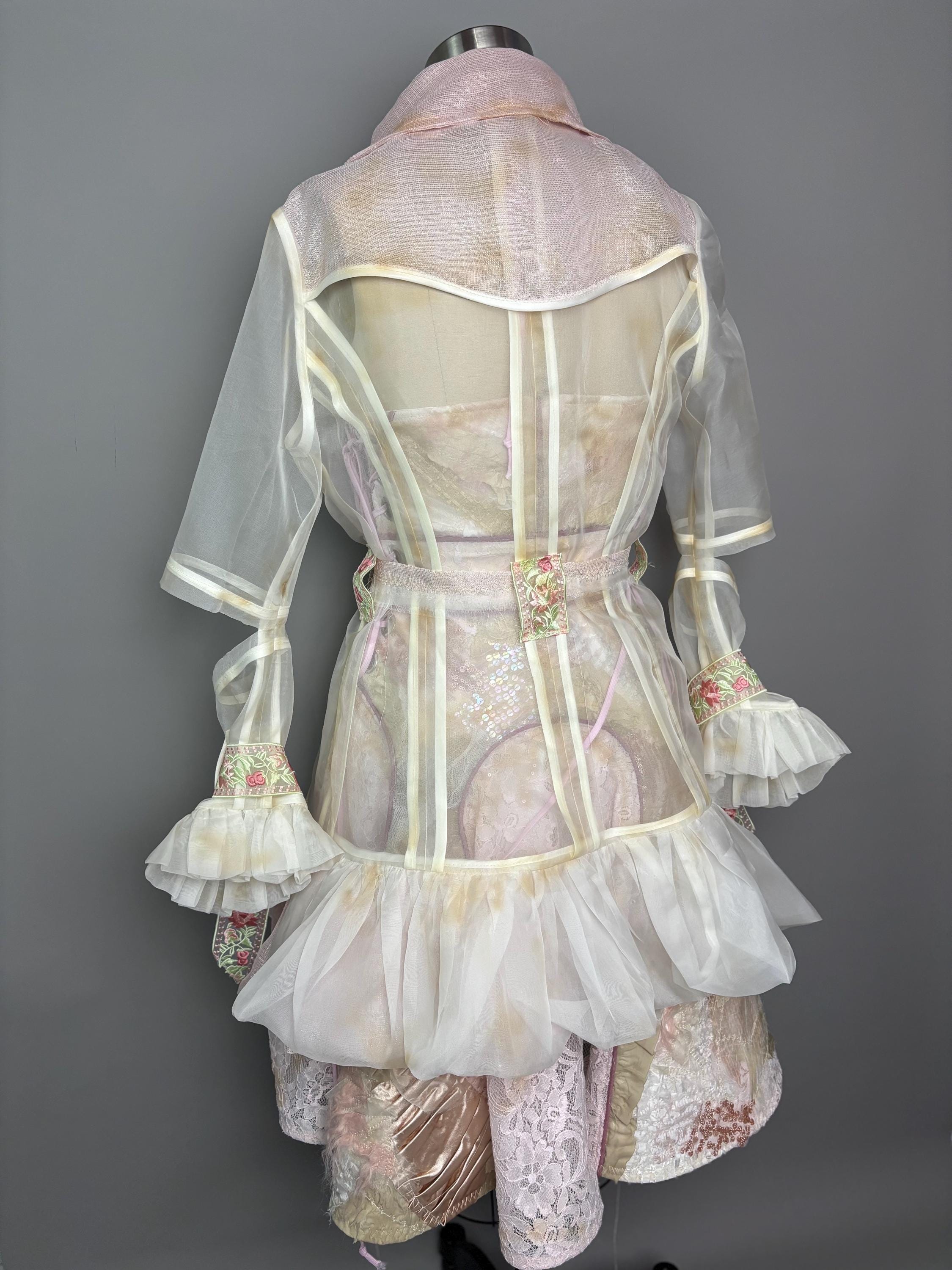 Distressed sheer silk jacket with pastel contrast detailing, “chain metal” trim and cut out sleeves. Jacket has no closure other than a tattered, raw edged D-ring belt.