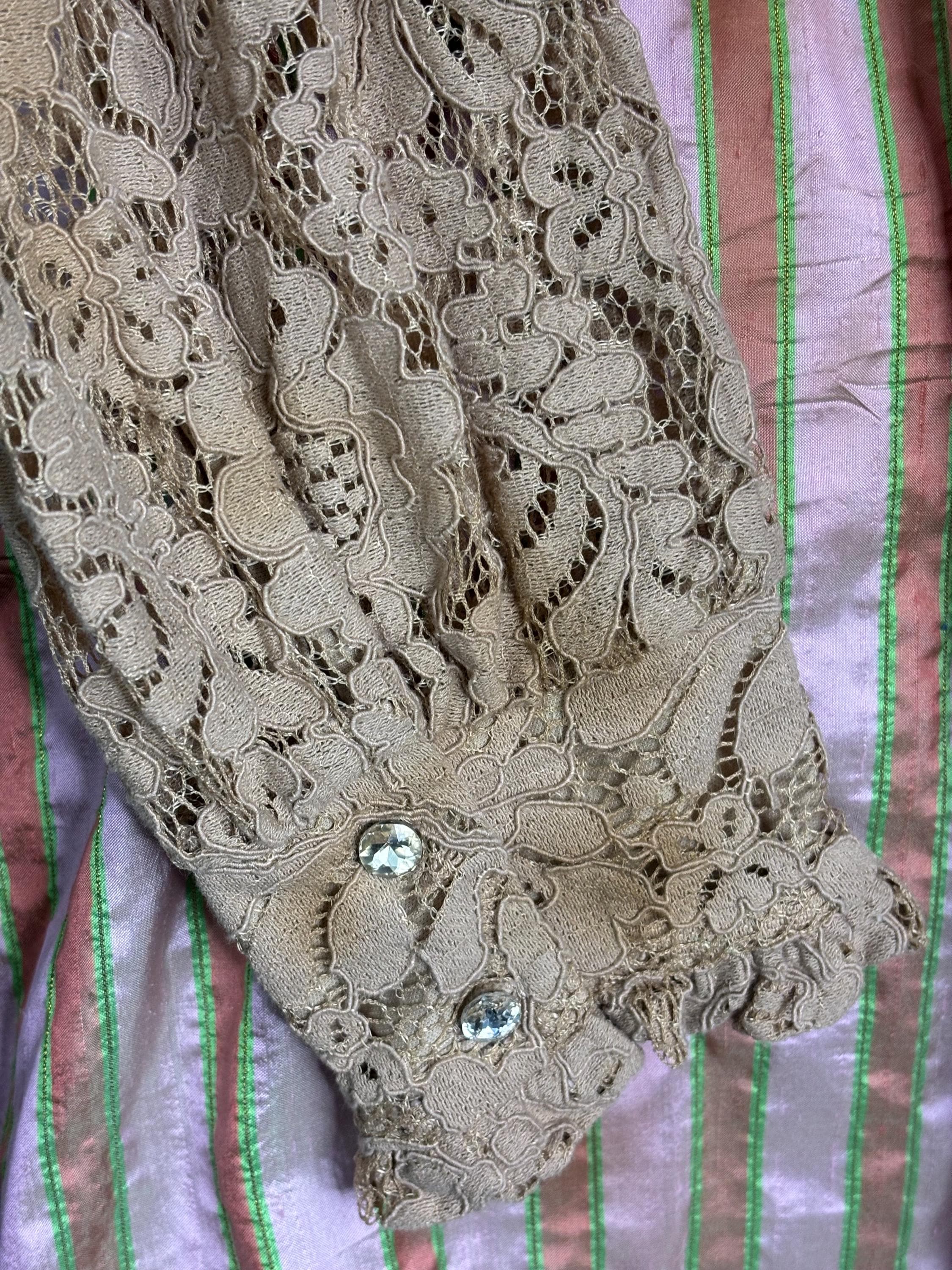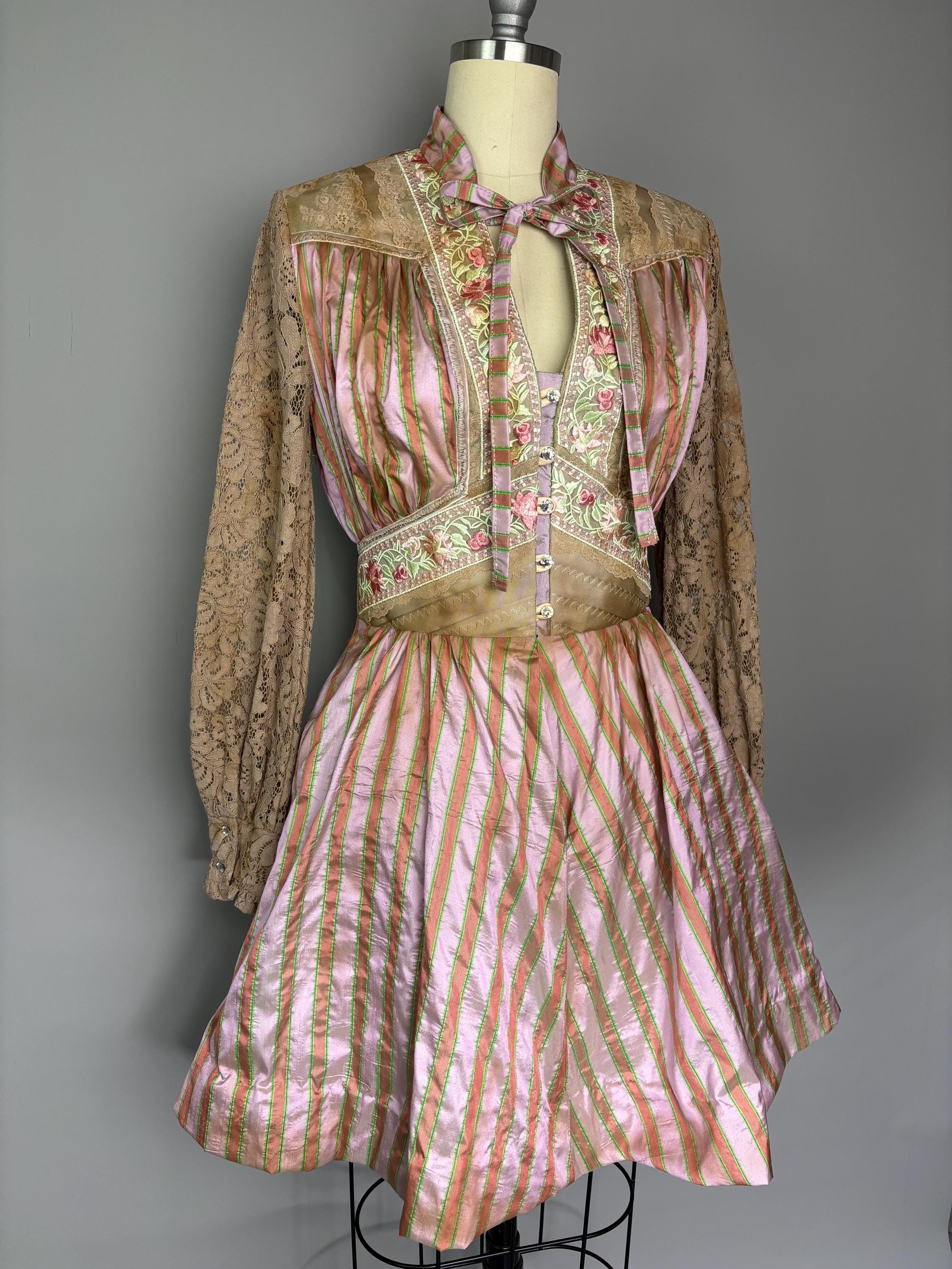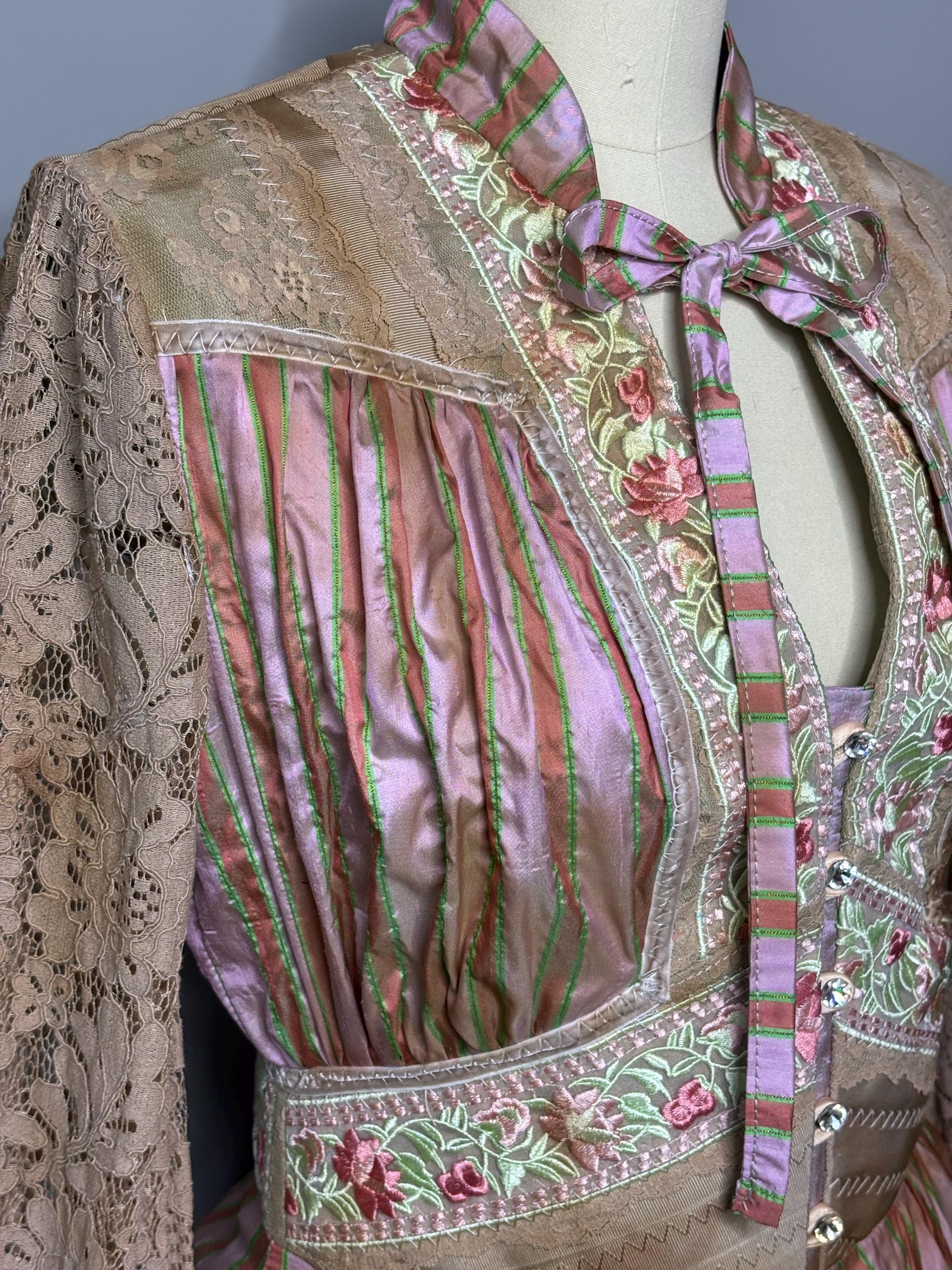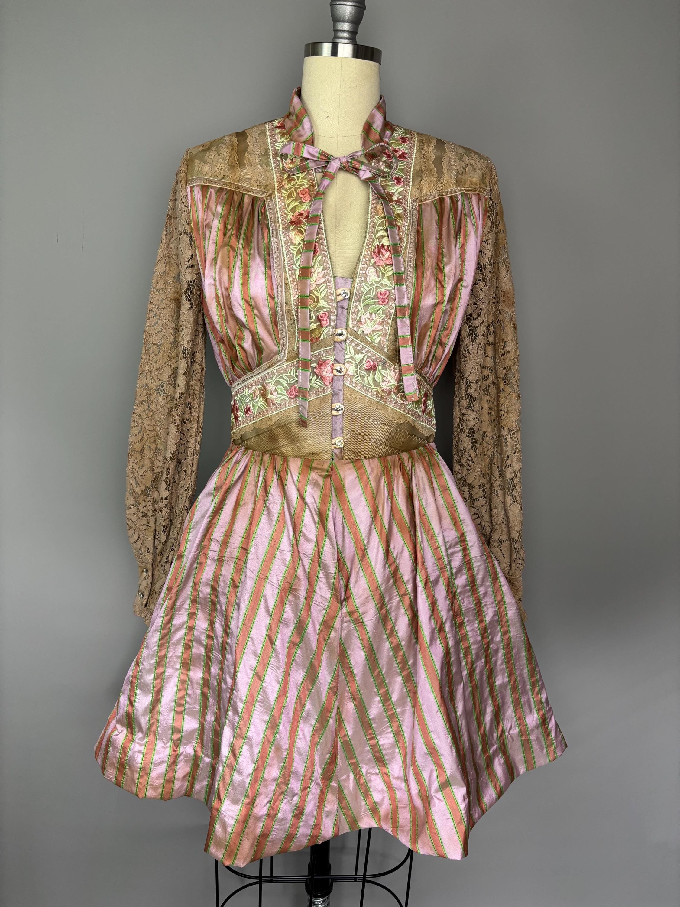 Beautifully distressed silk striped dress with vintage lace accents, rhinestone buttons, tulle underlayer and bow tie front. Dress has no stretch, with a hidden snap front closure.