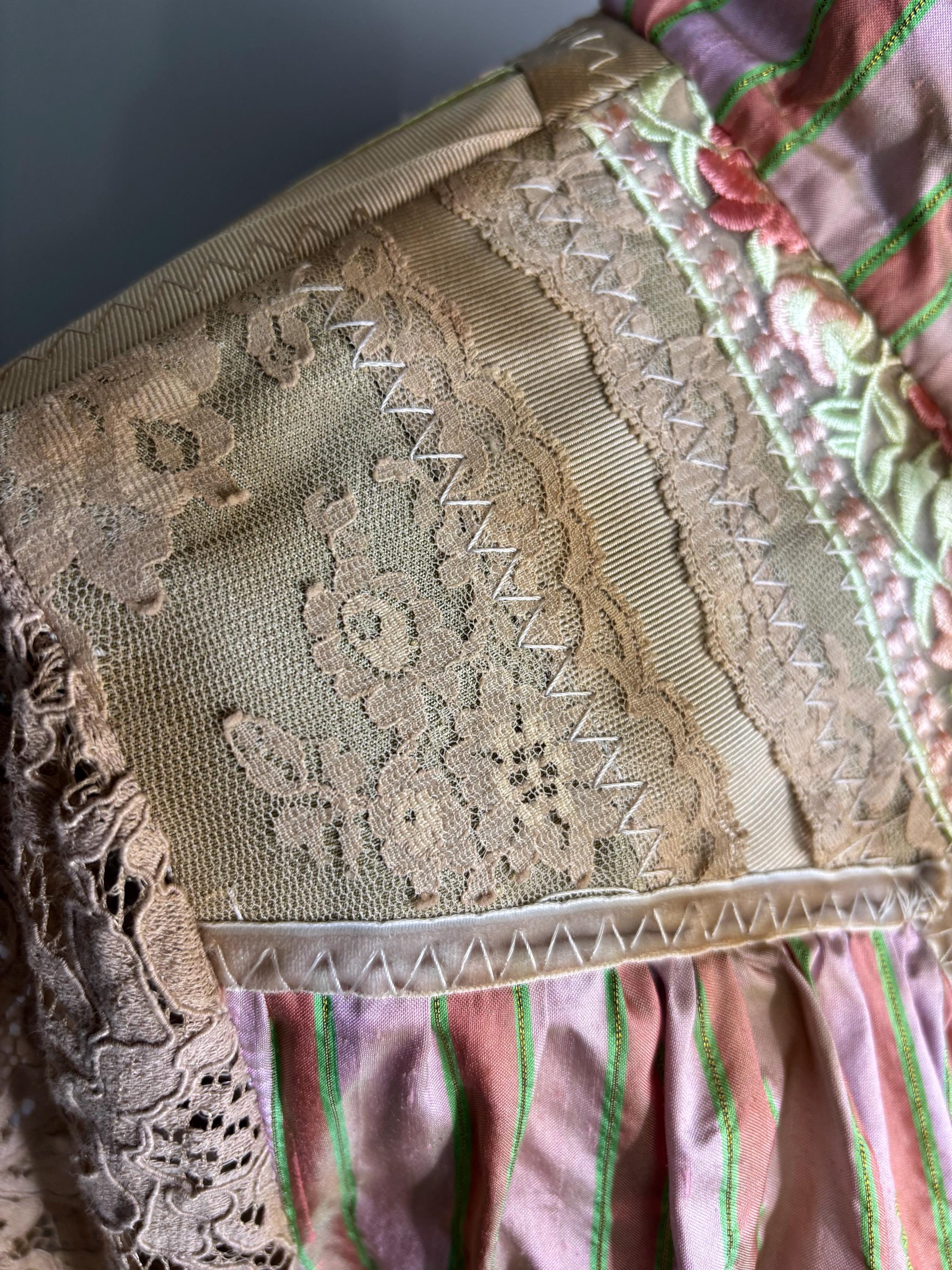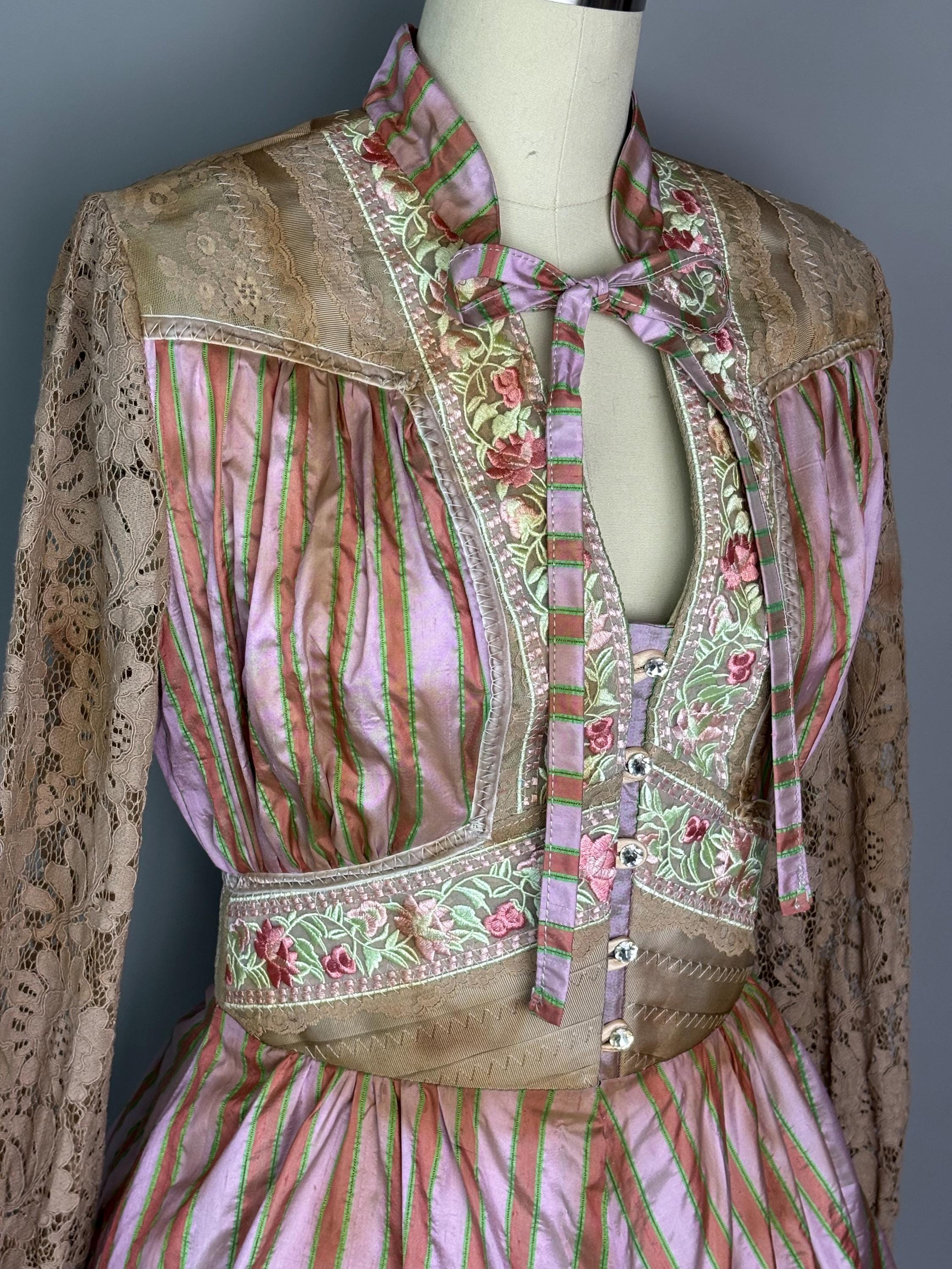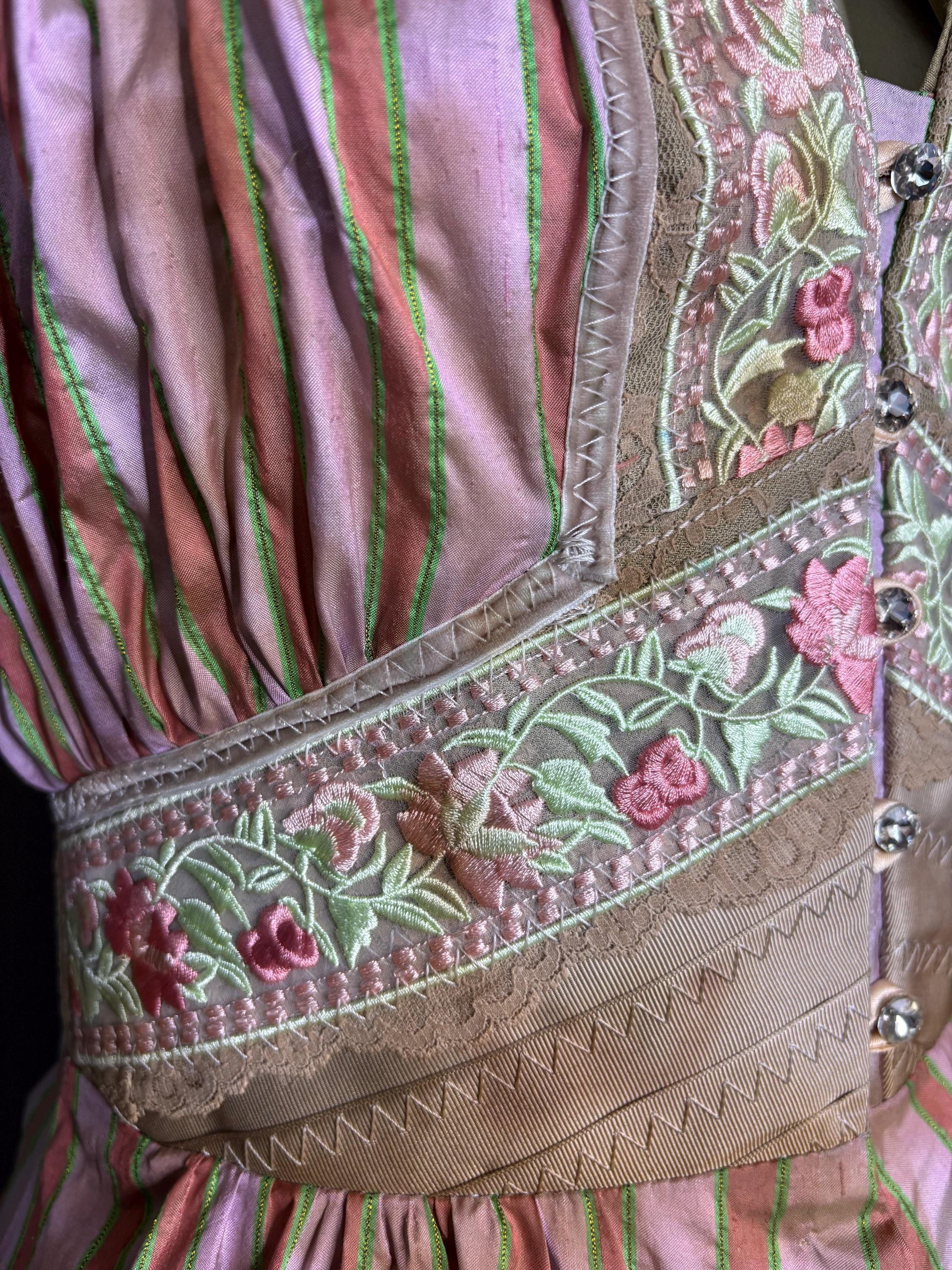 Beautifully distressed silk striped dress with vintage lace accents, rhinestone buttons, tulle underlayer and bow tie front. Dress has no stretch, with a hidden snap front closure.