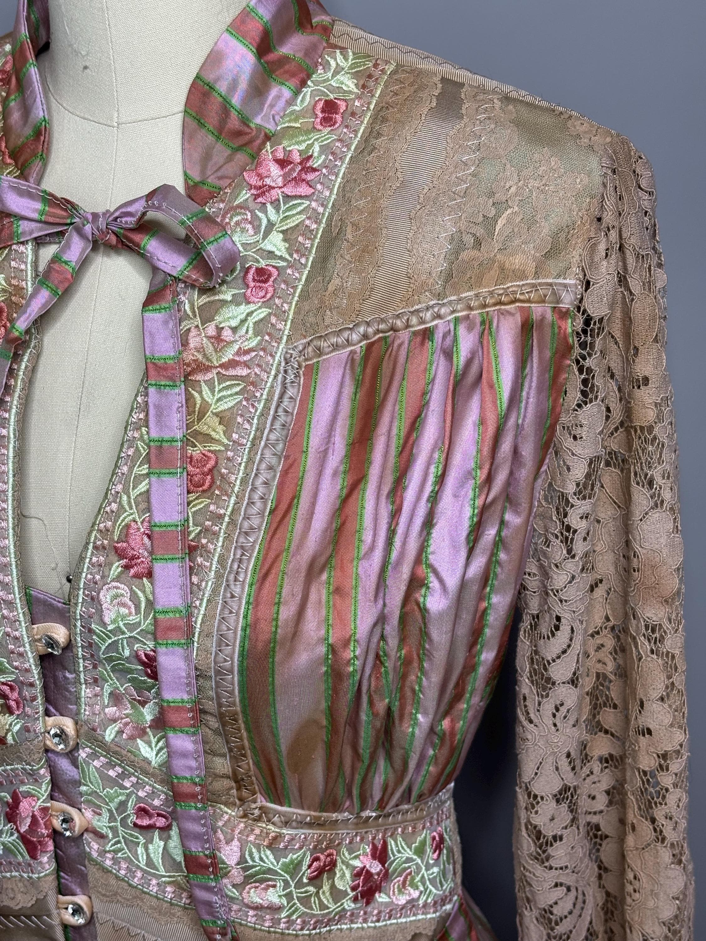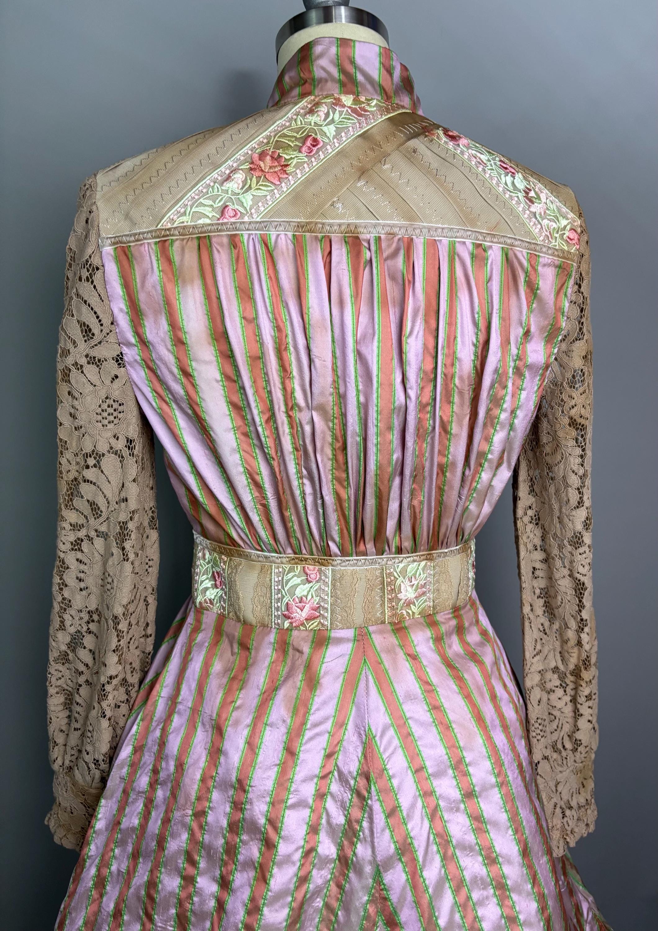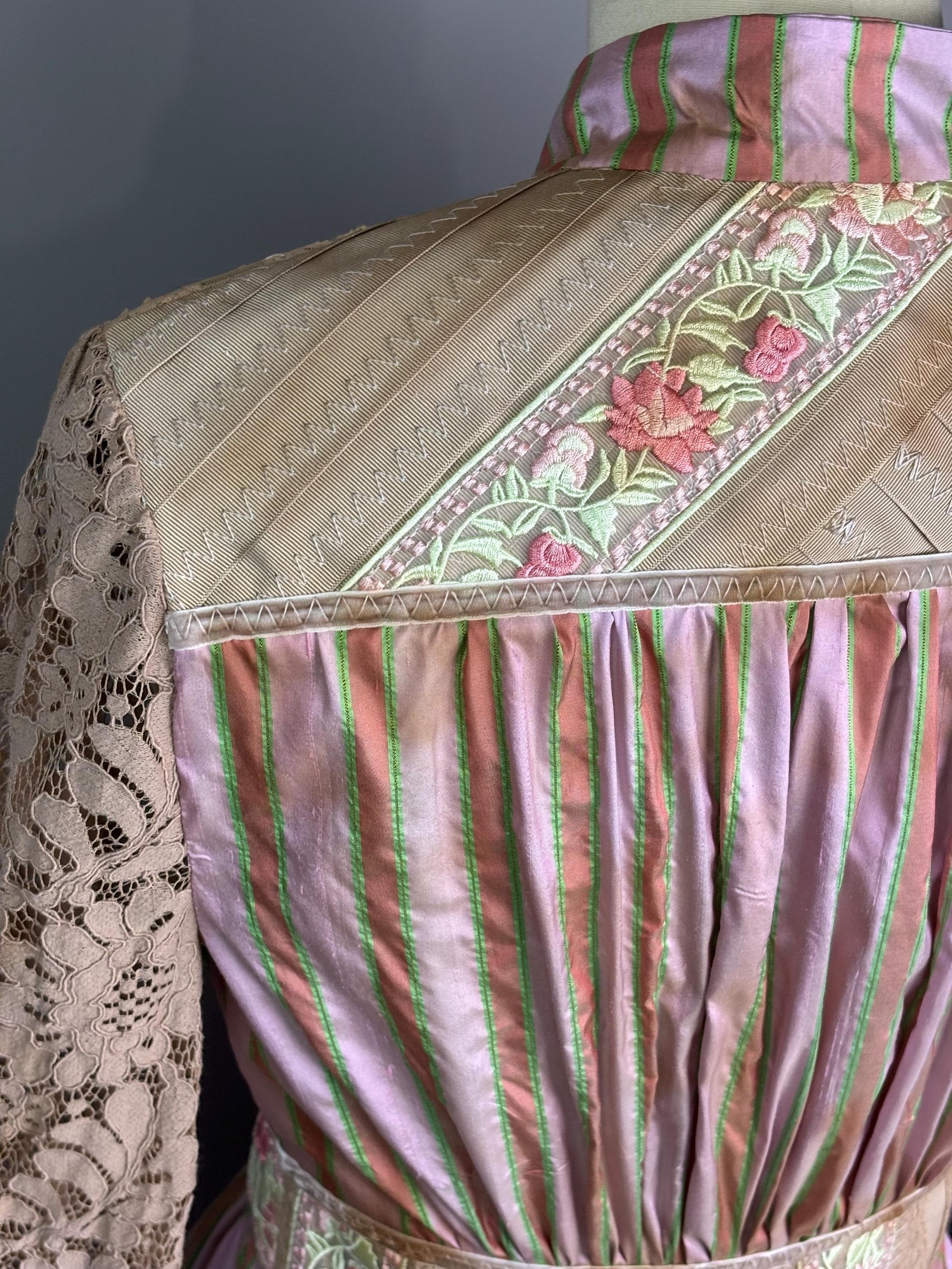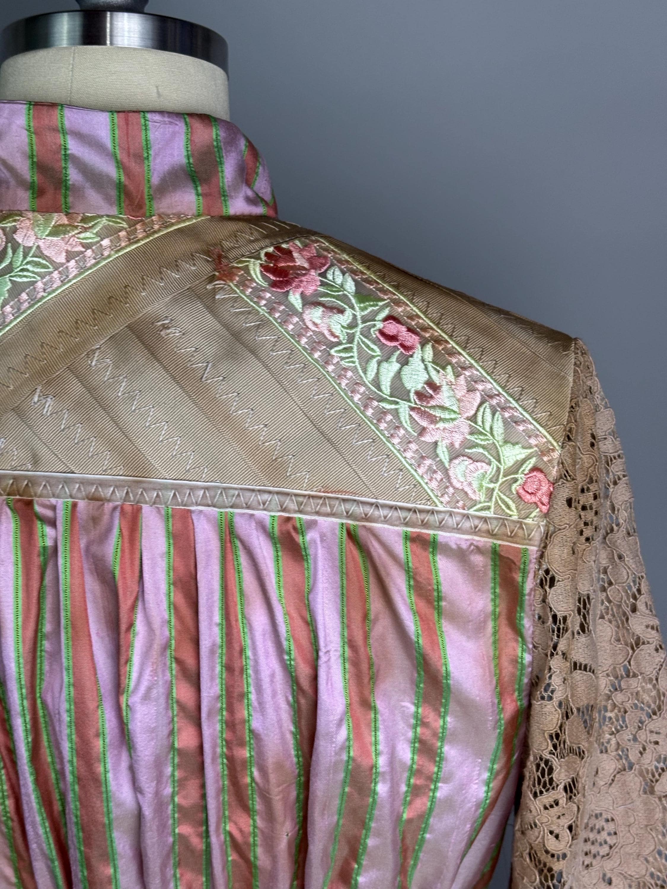 Beautifully distressed silk striped dress with vintage lace accents, rhinestone buttons, tulle underlayer and bow tie front. Dress has no stretch, with a hidden snap front closure.