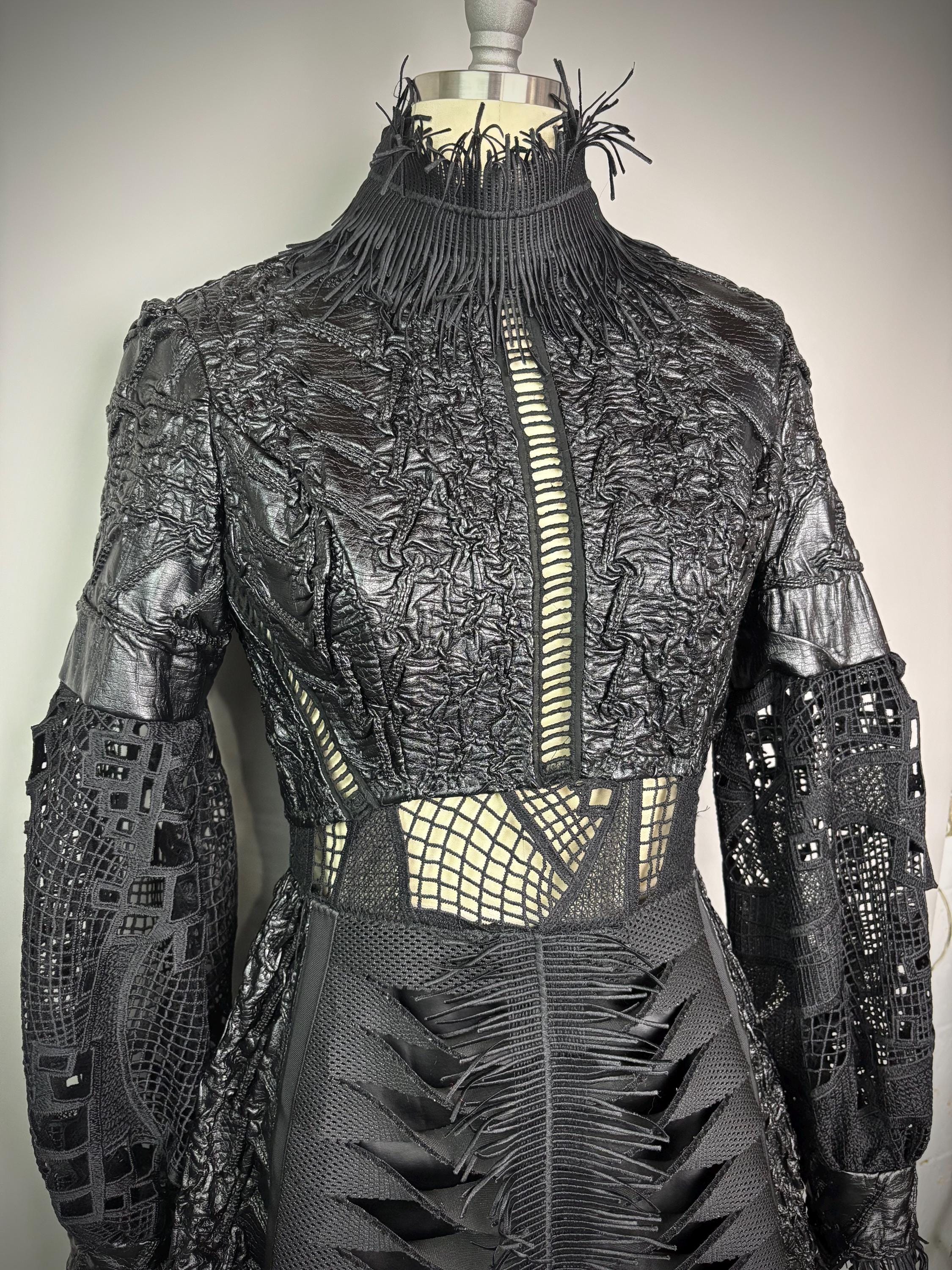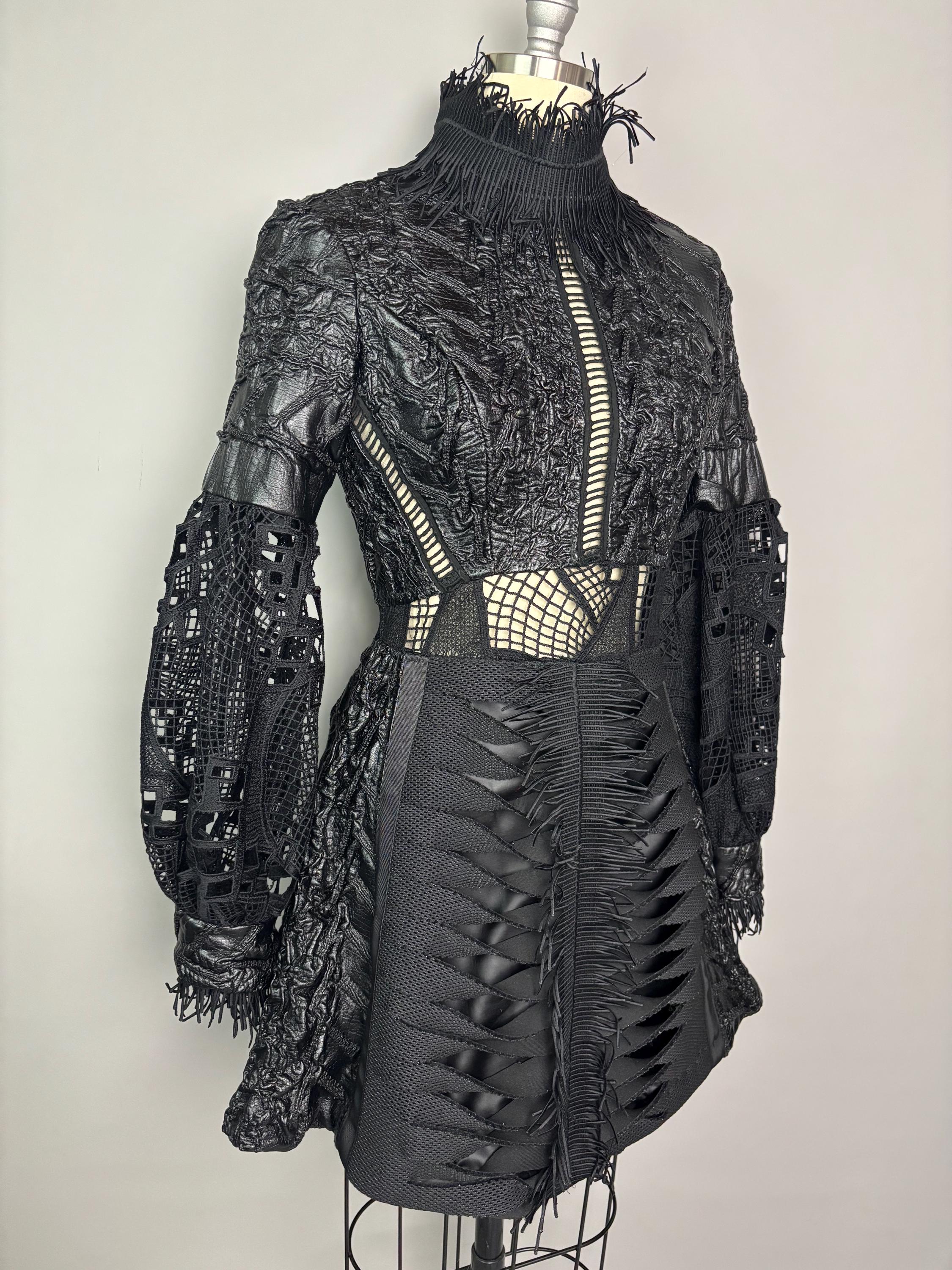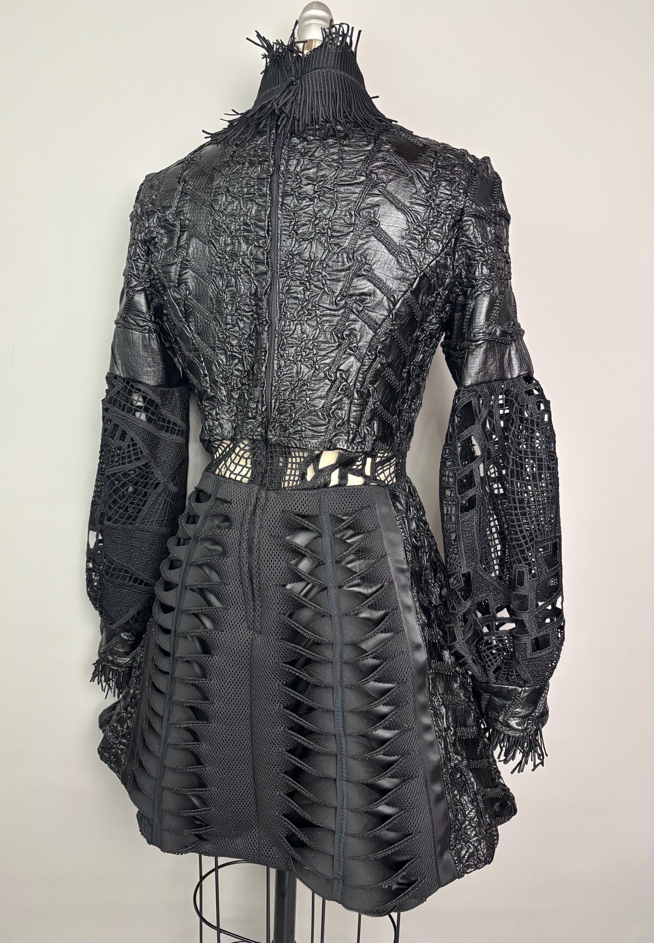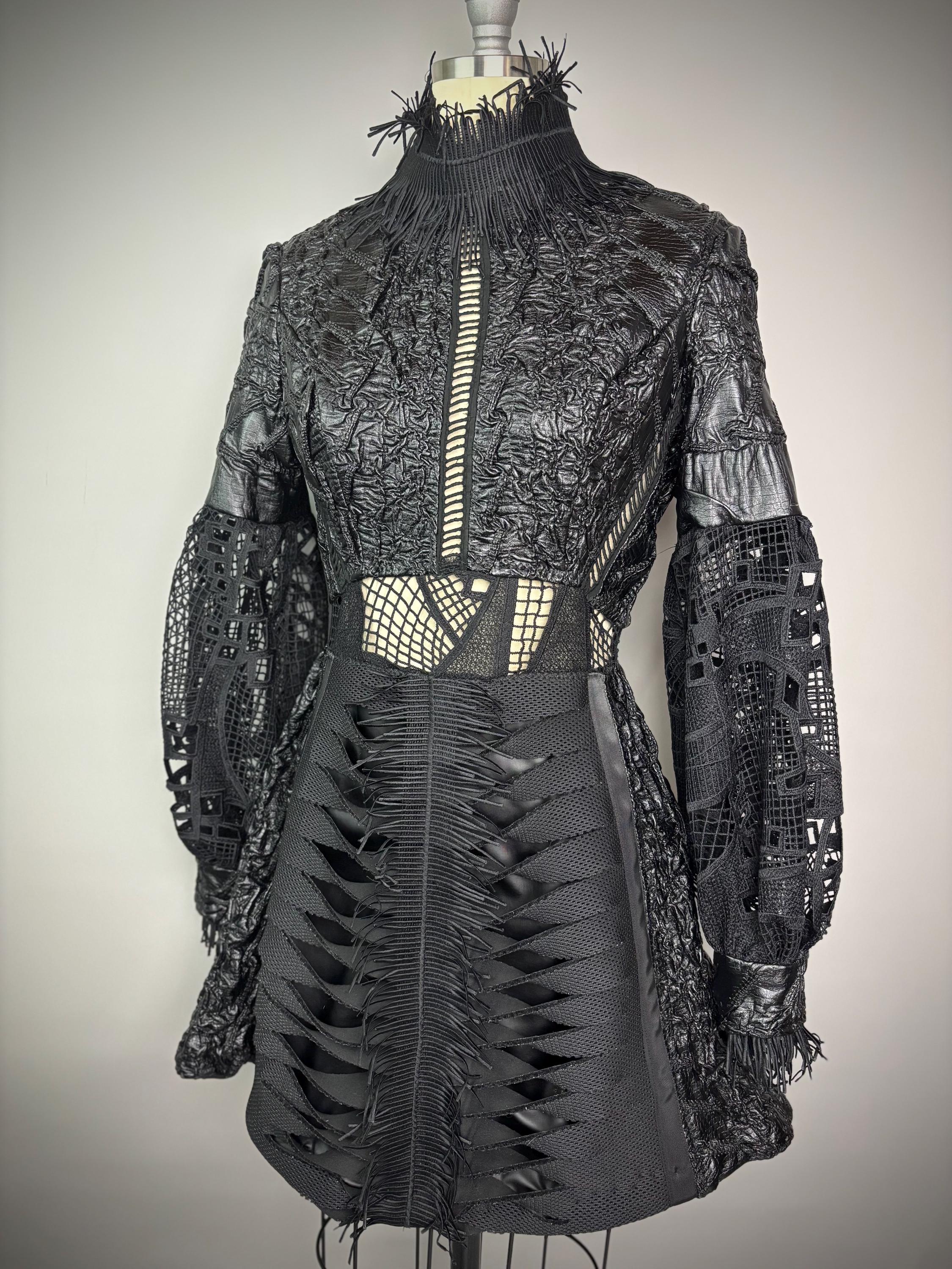 Black textured dress with laser cut statement sleeves, neoprene manipulated skirt and zip back closure. Dress is unlined, with button closure at the wrist.