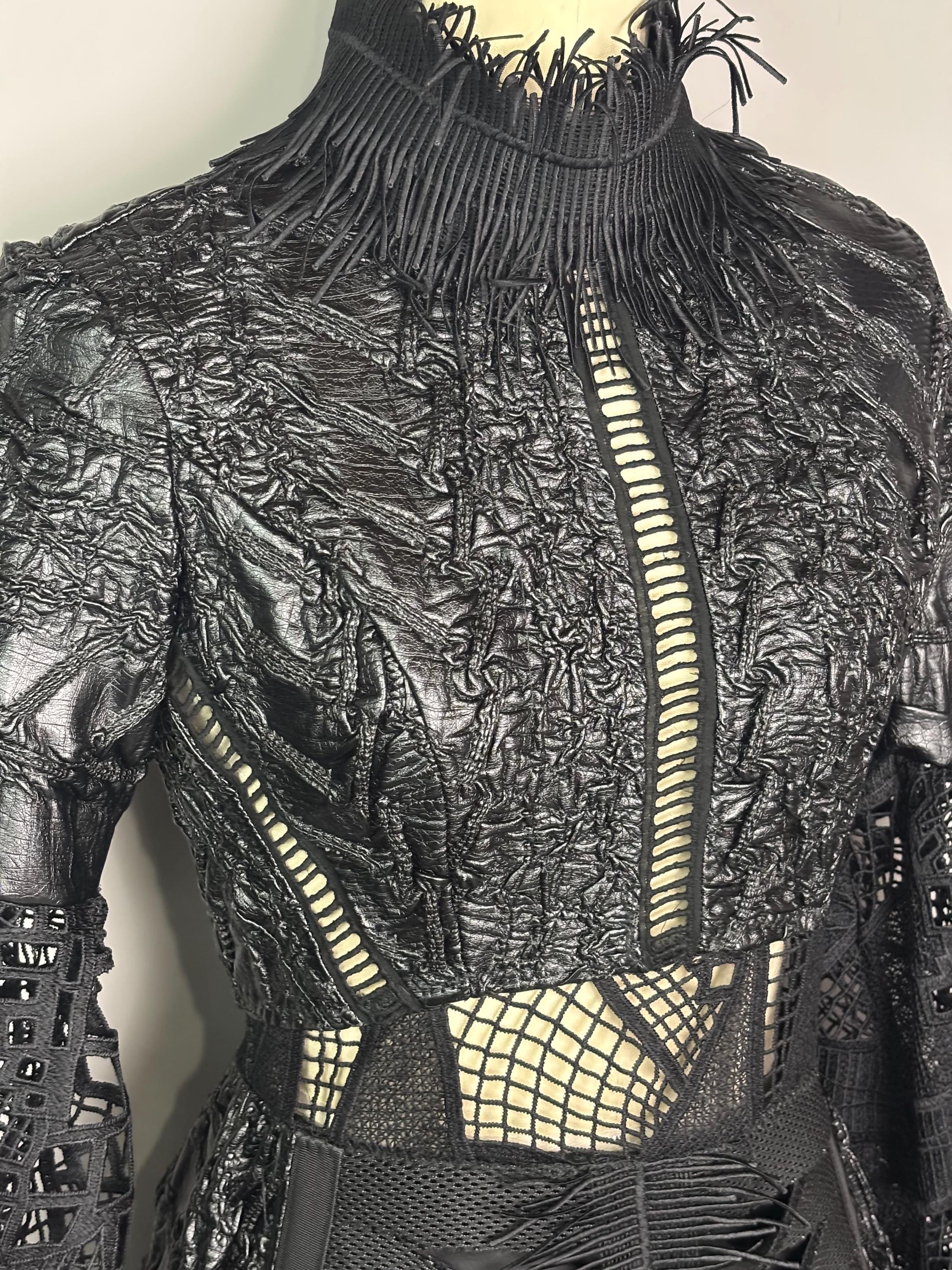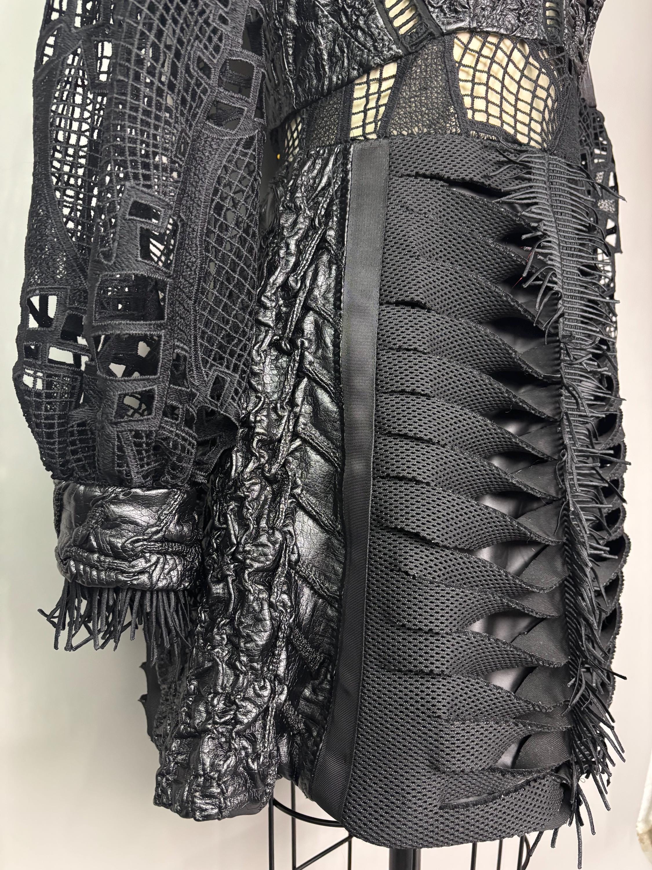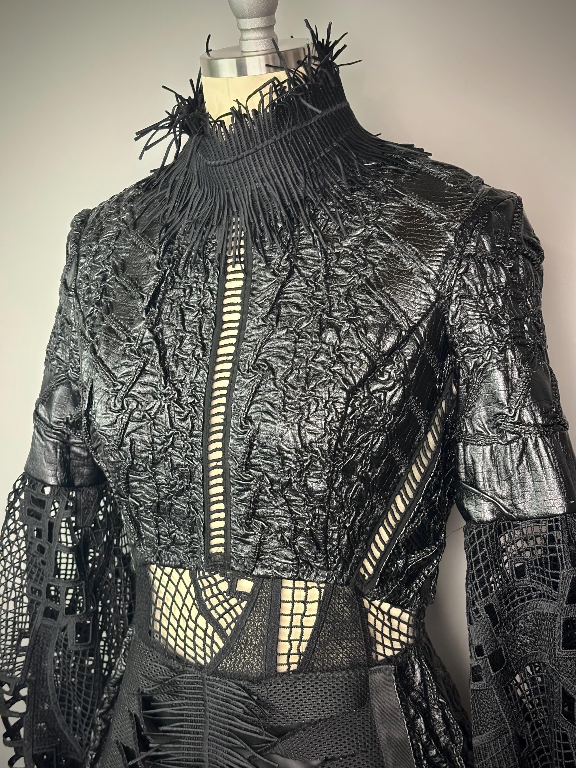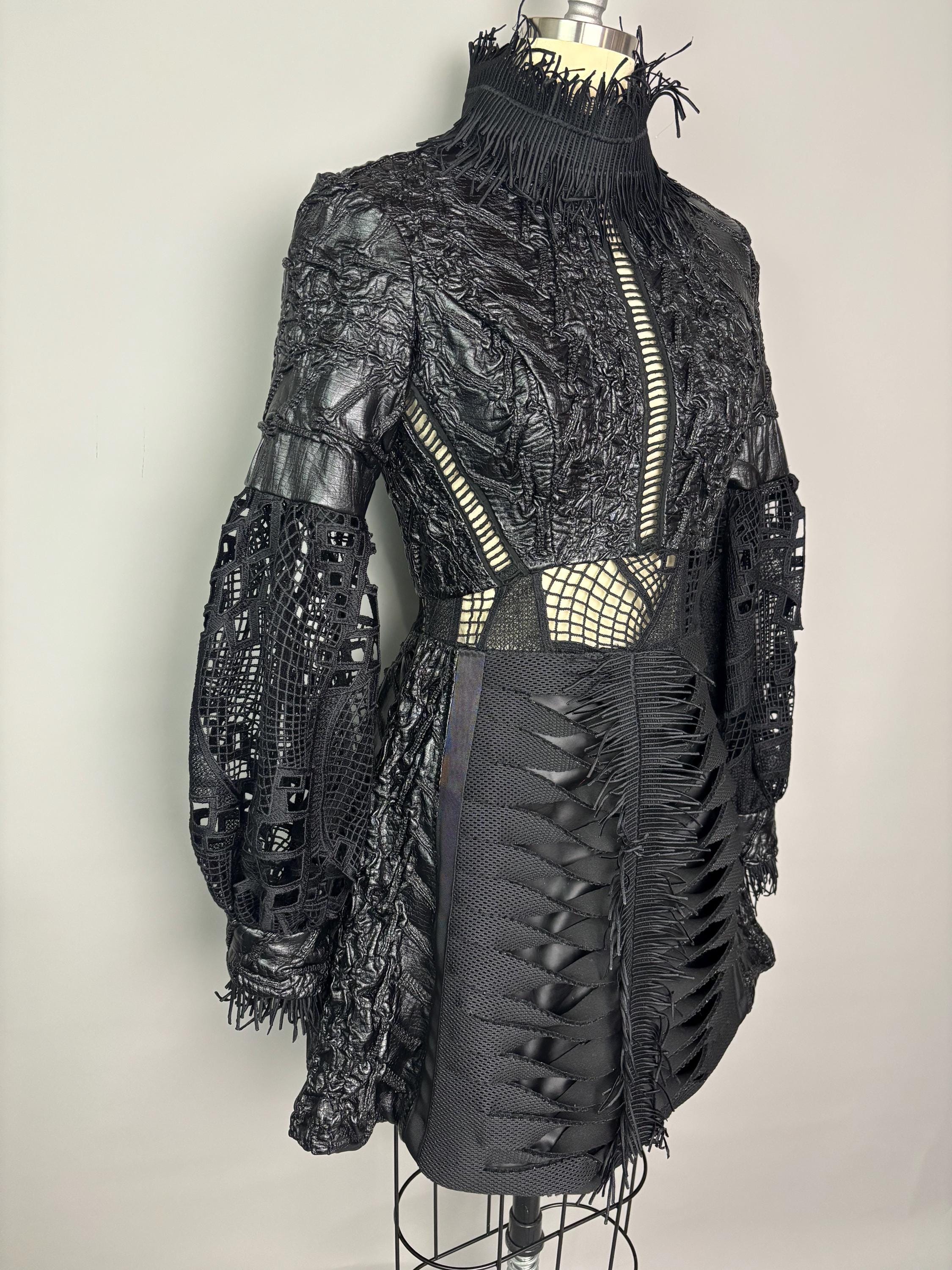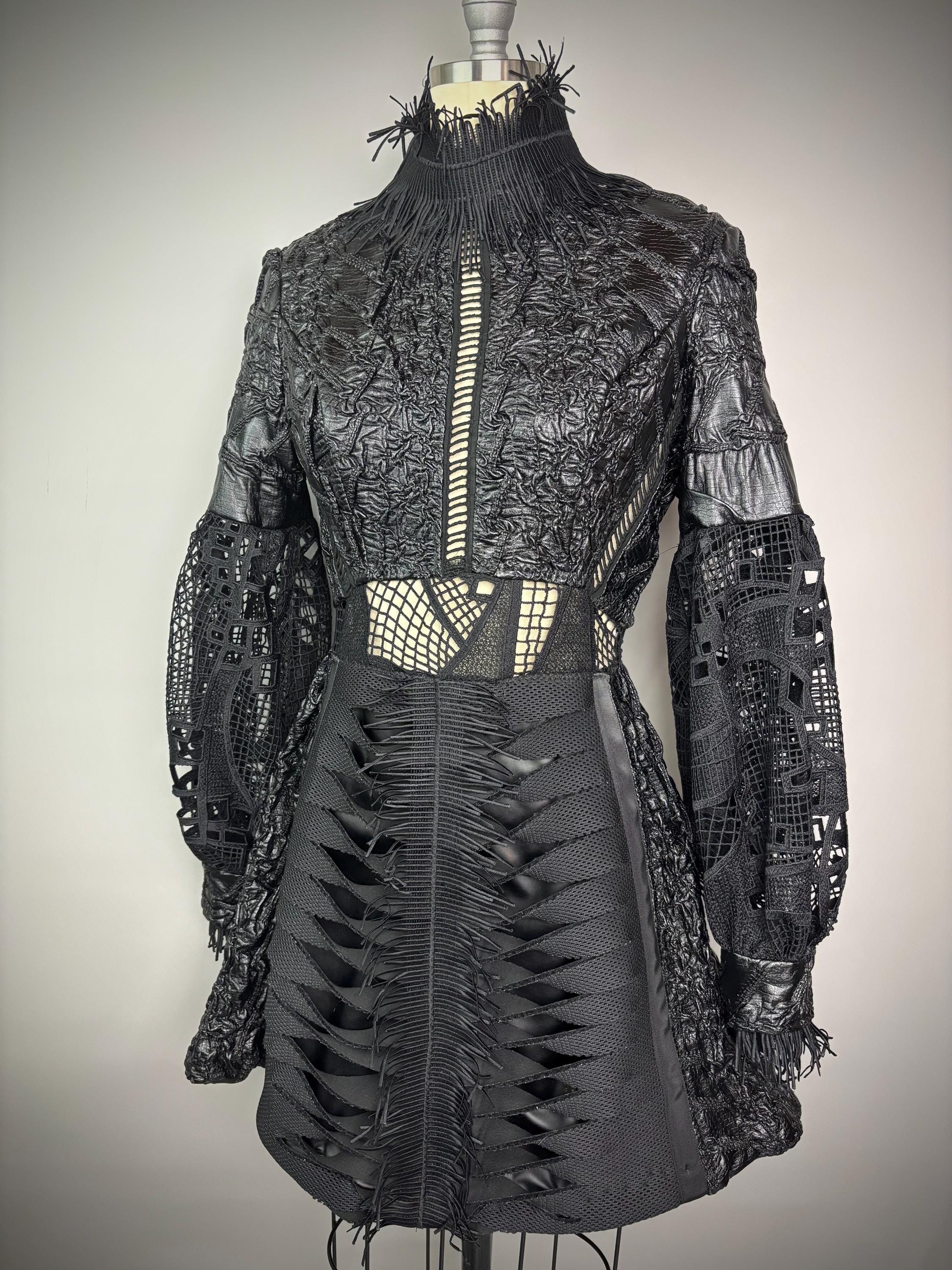 Black textured dress with laser cut statement sleeves, neoprene manipulated skirt and zip back closure. Dress is unlined, with button closure at the wrist.
