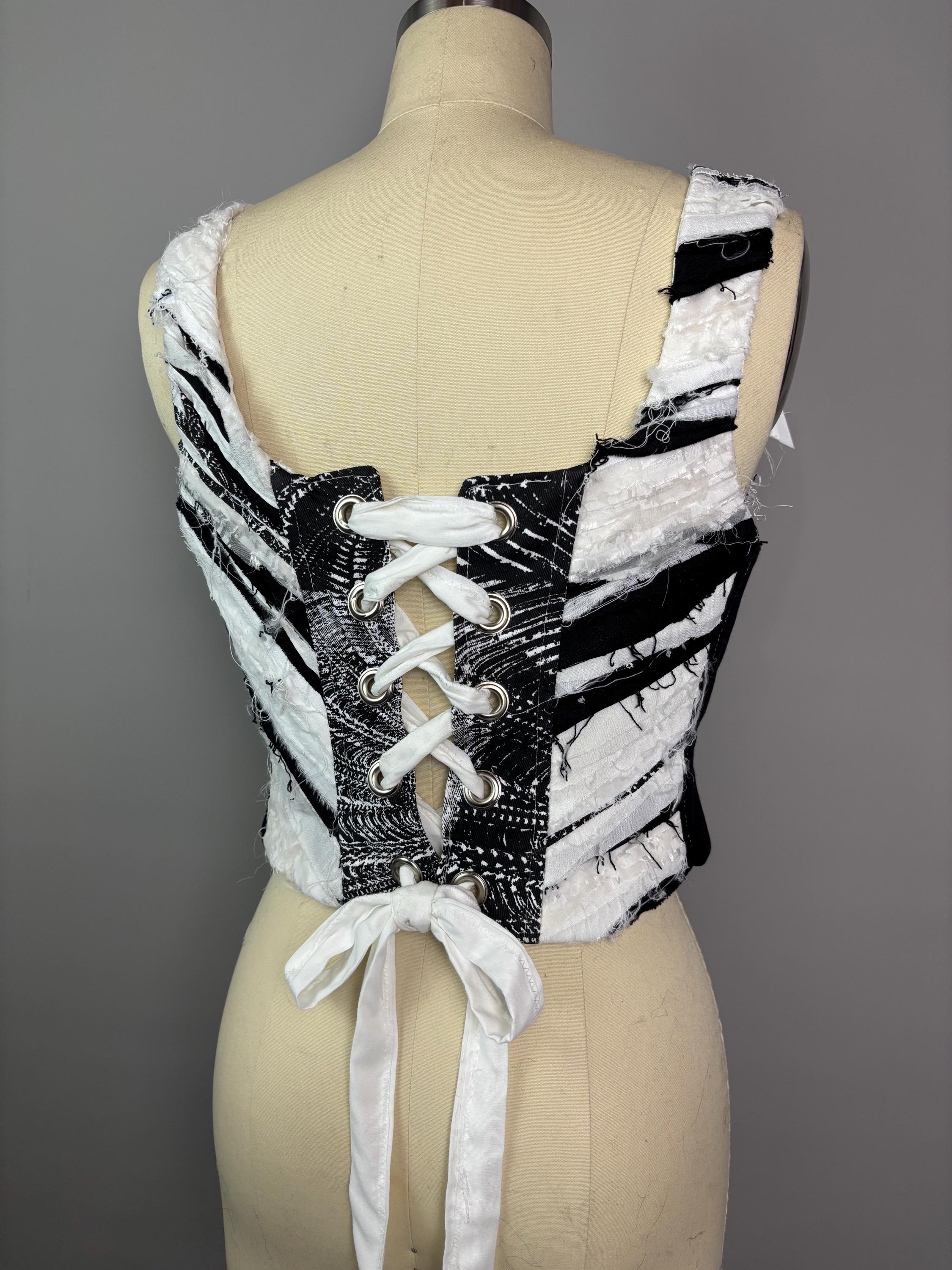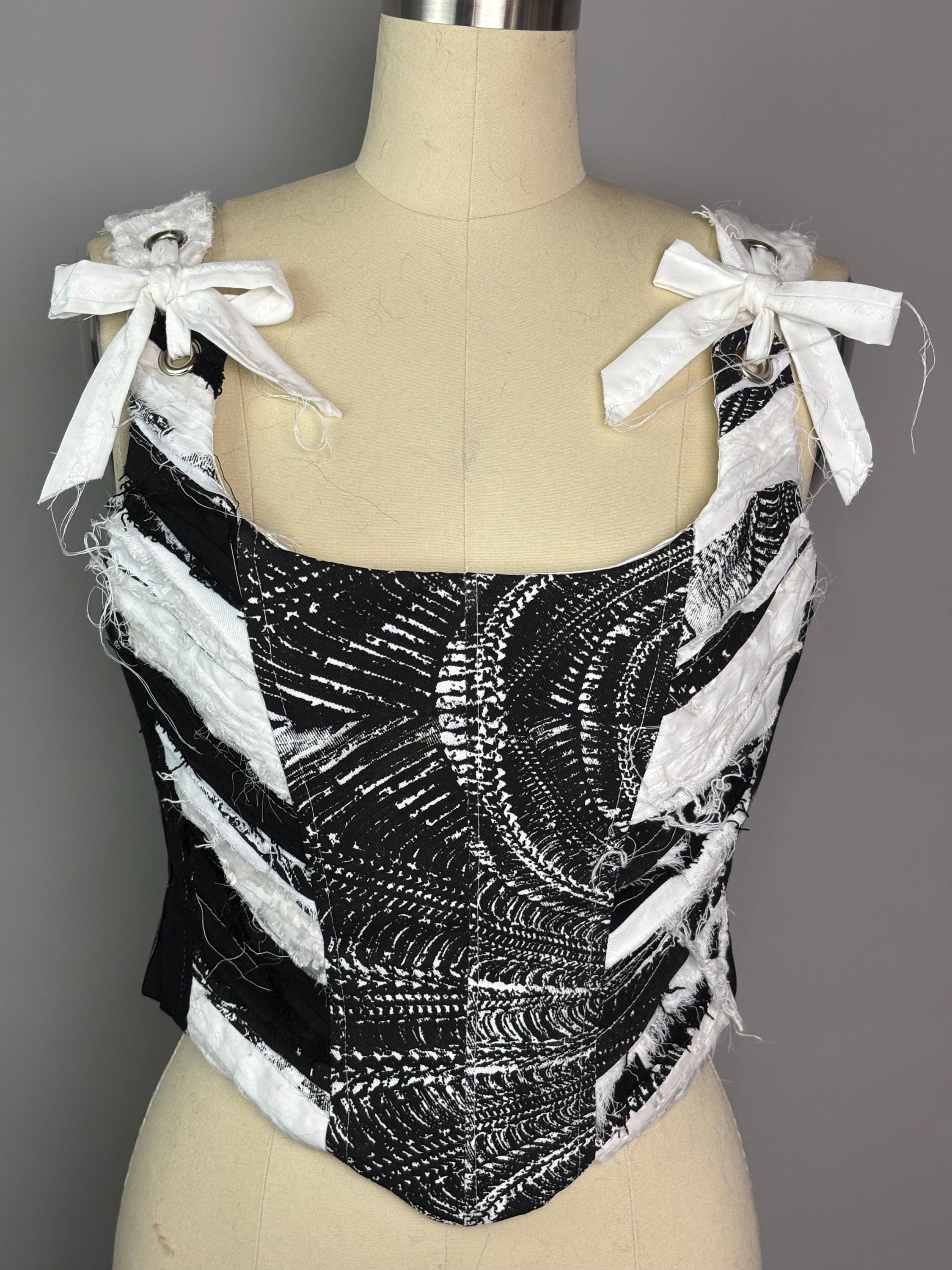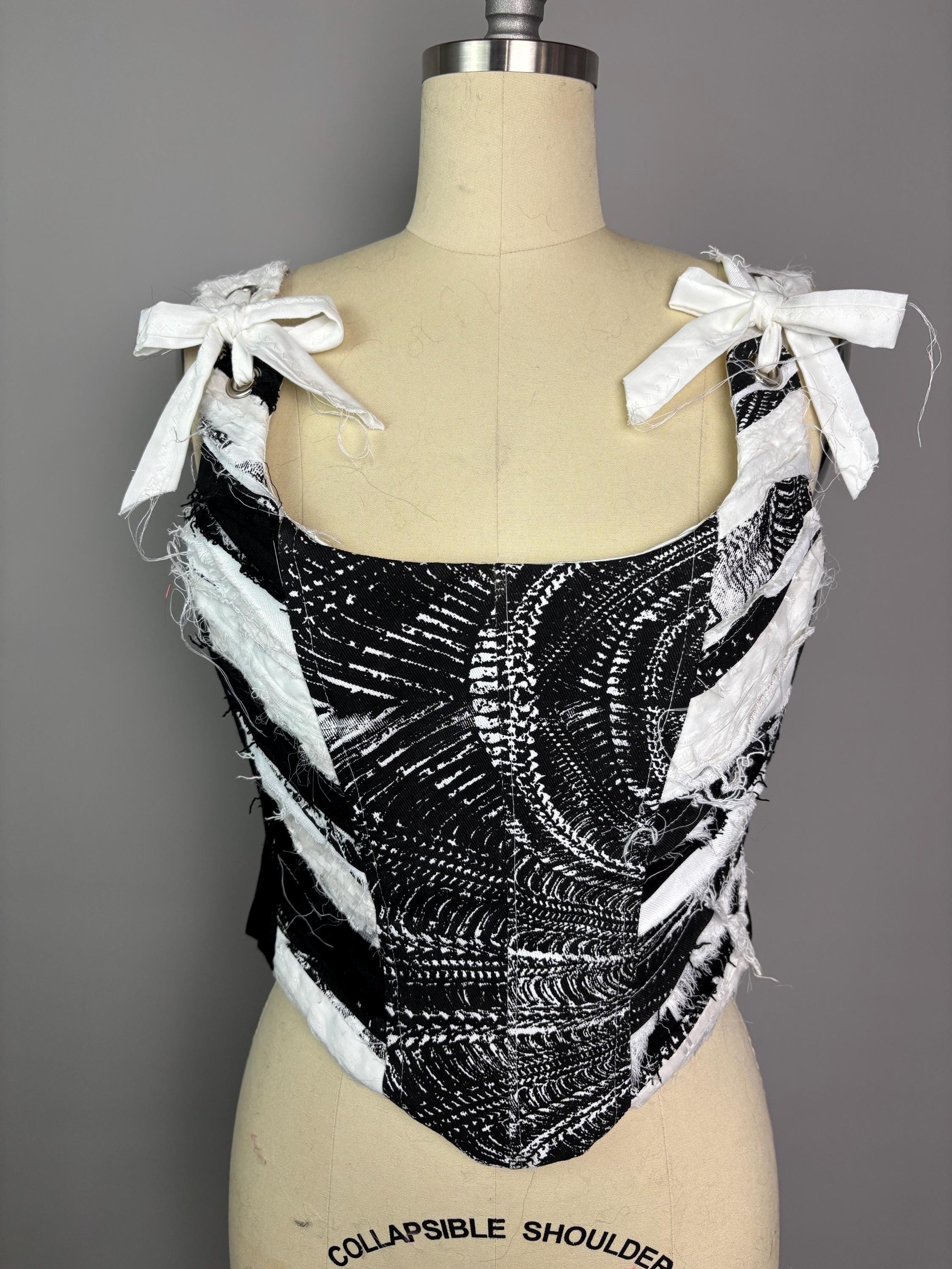 Black and white screenprinted denim corset with distressed raw edge layers, adjustable bow straps and lace up closure. Corset is lined in white satin.