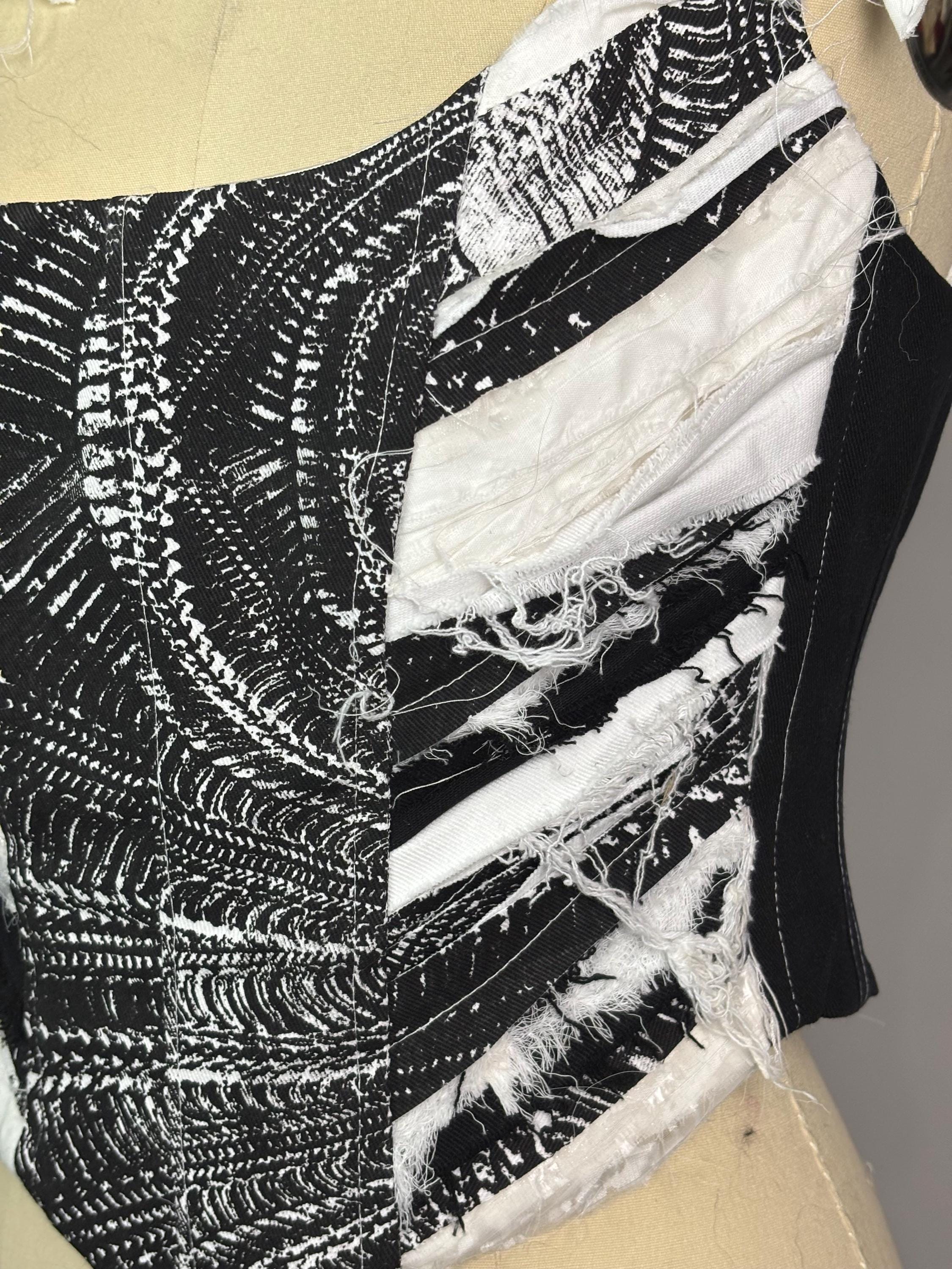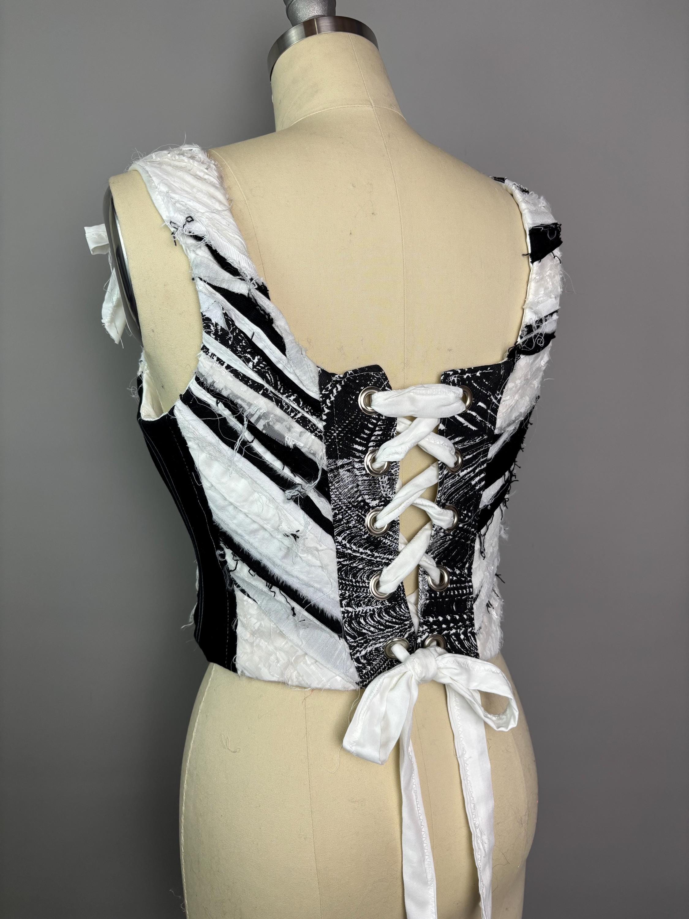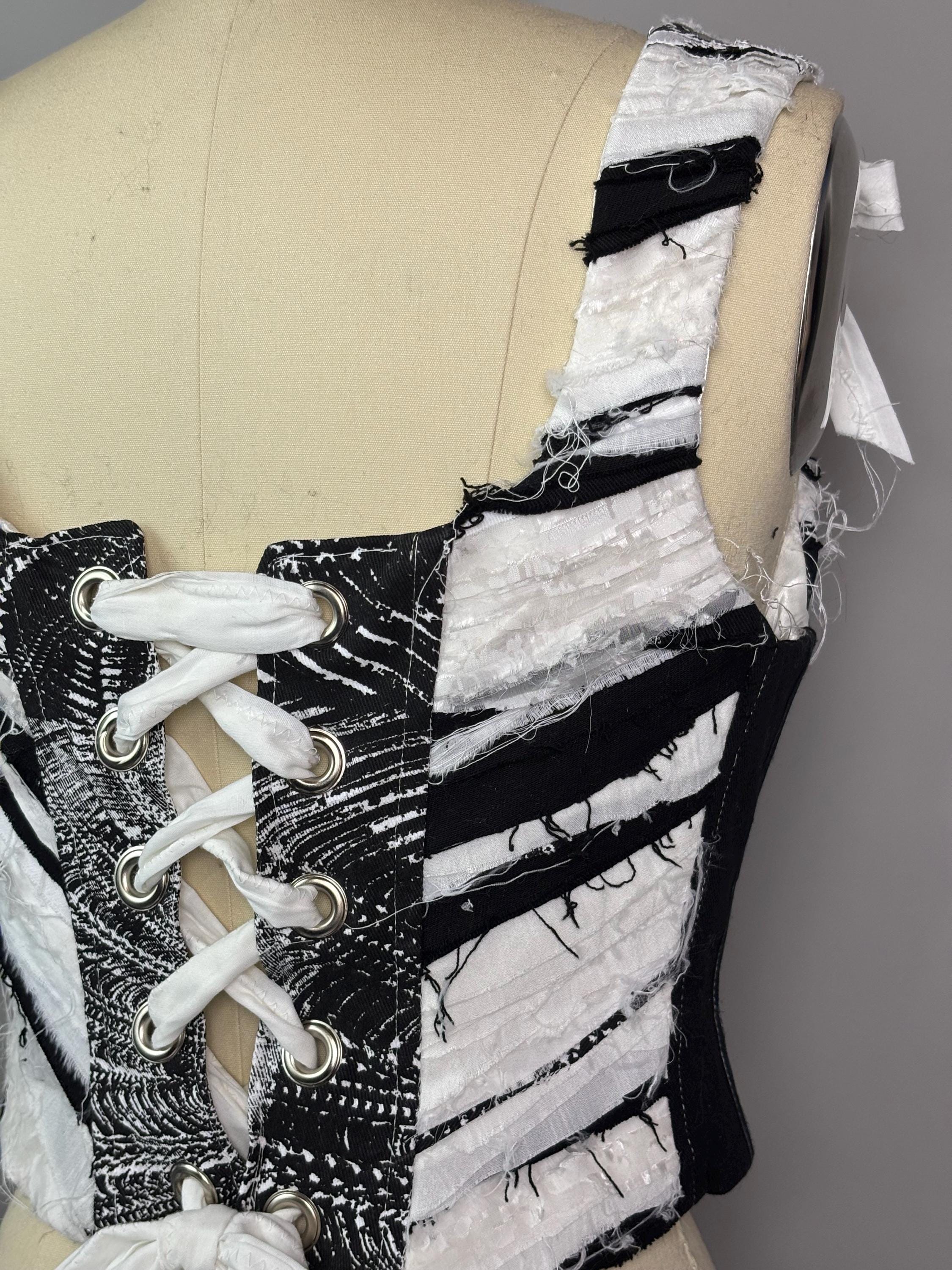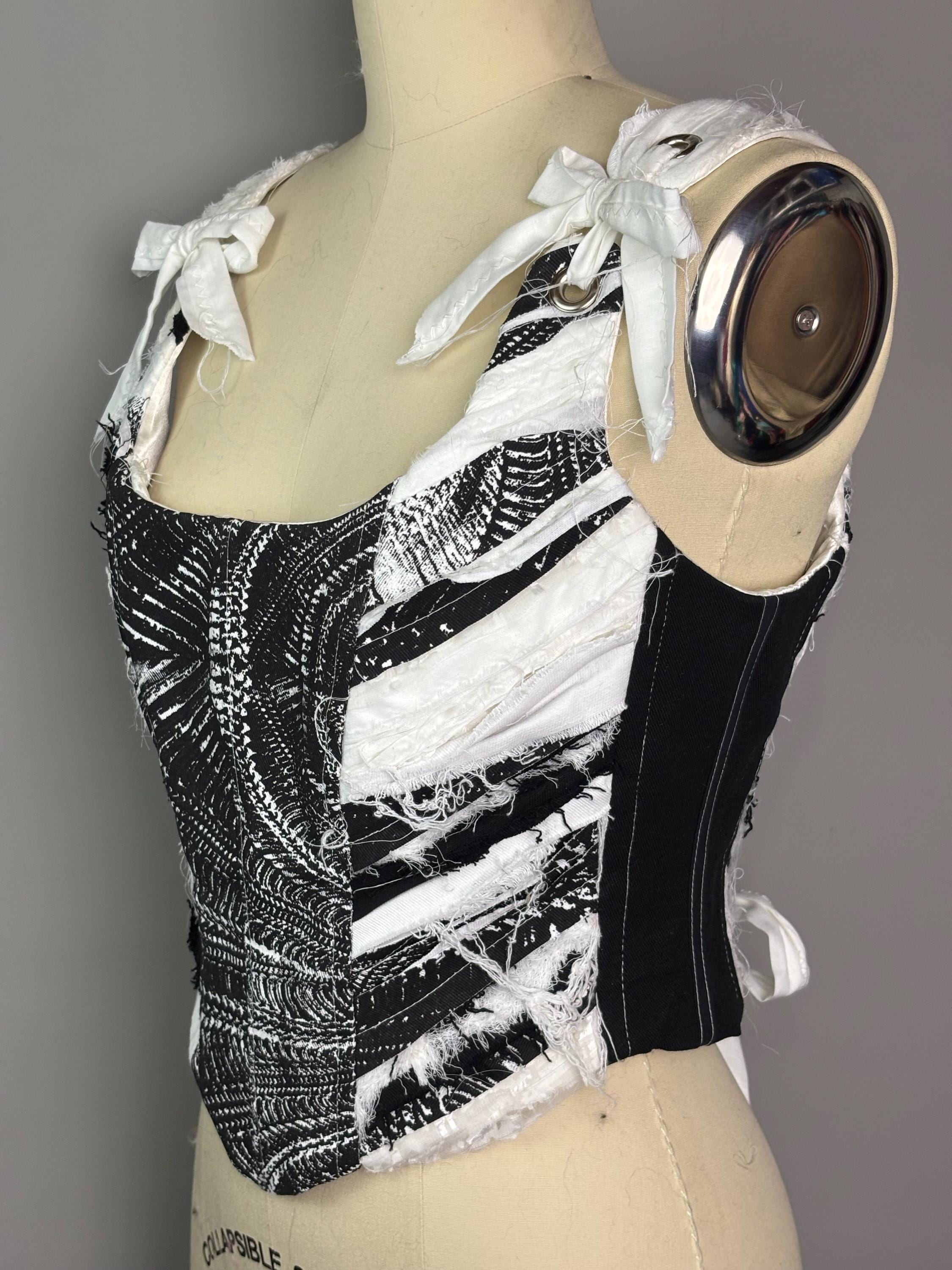 Black and white screenprinted denim corset with distressed raw edge layers, adjustable bow straps and lace up closure. Corset is lined in white satin.