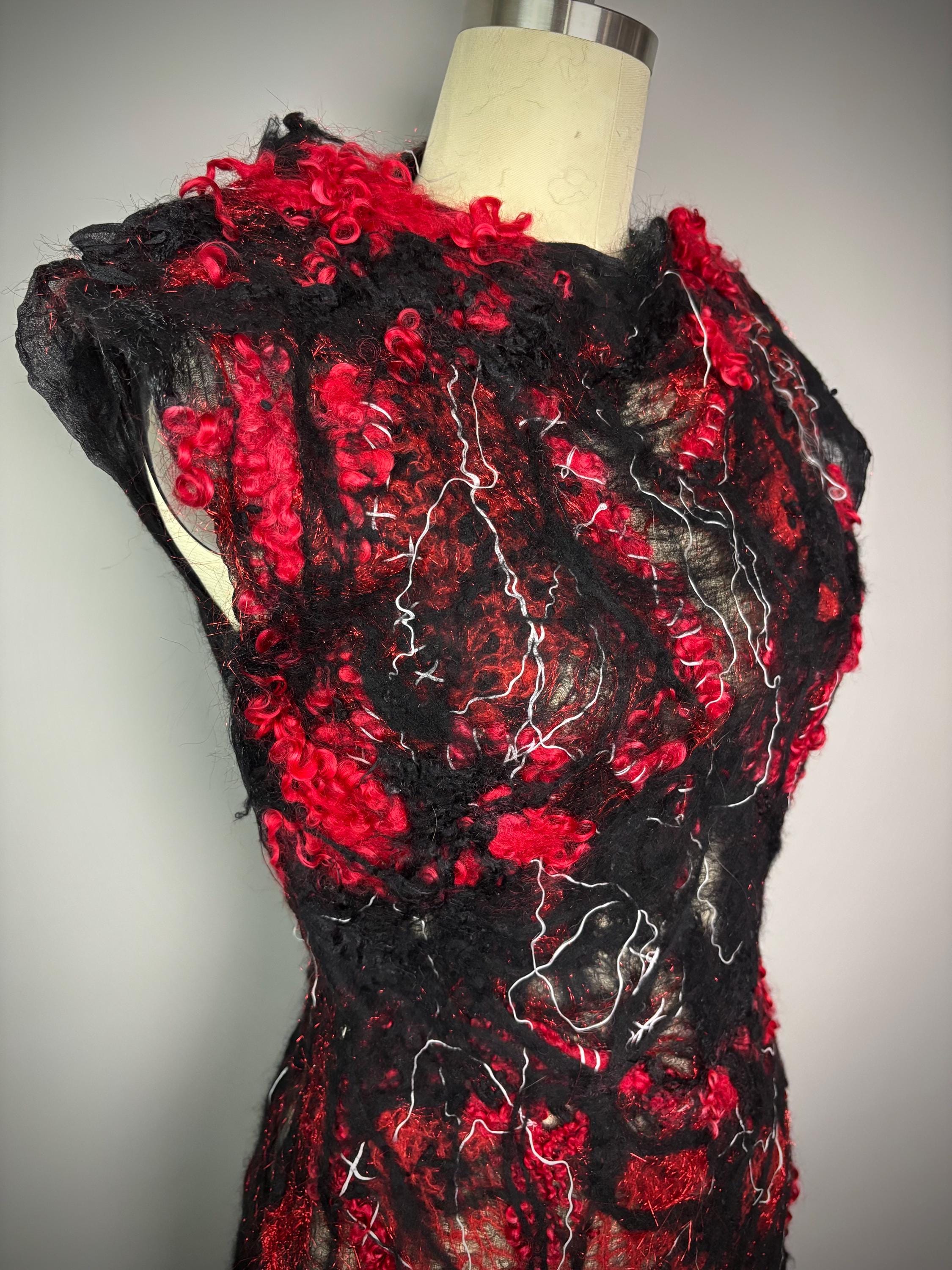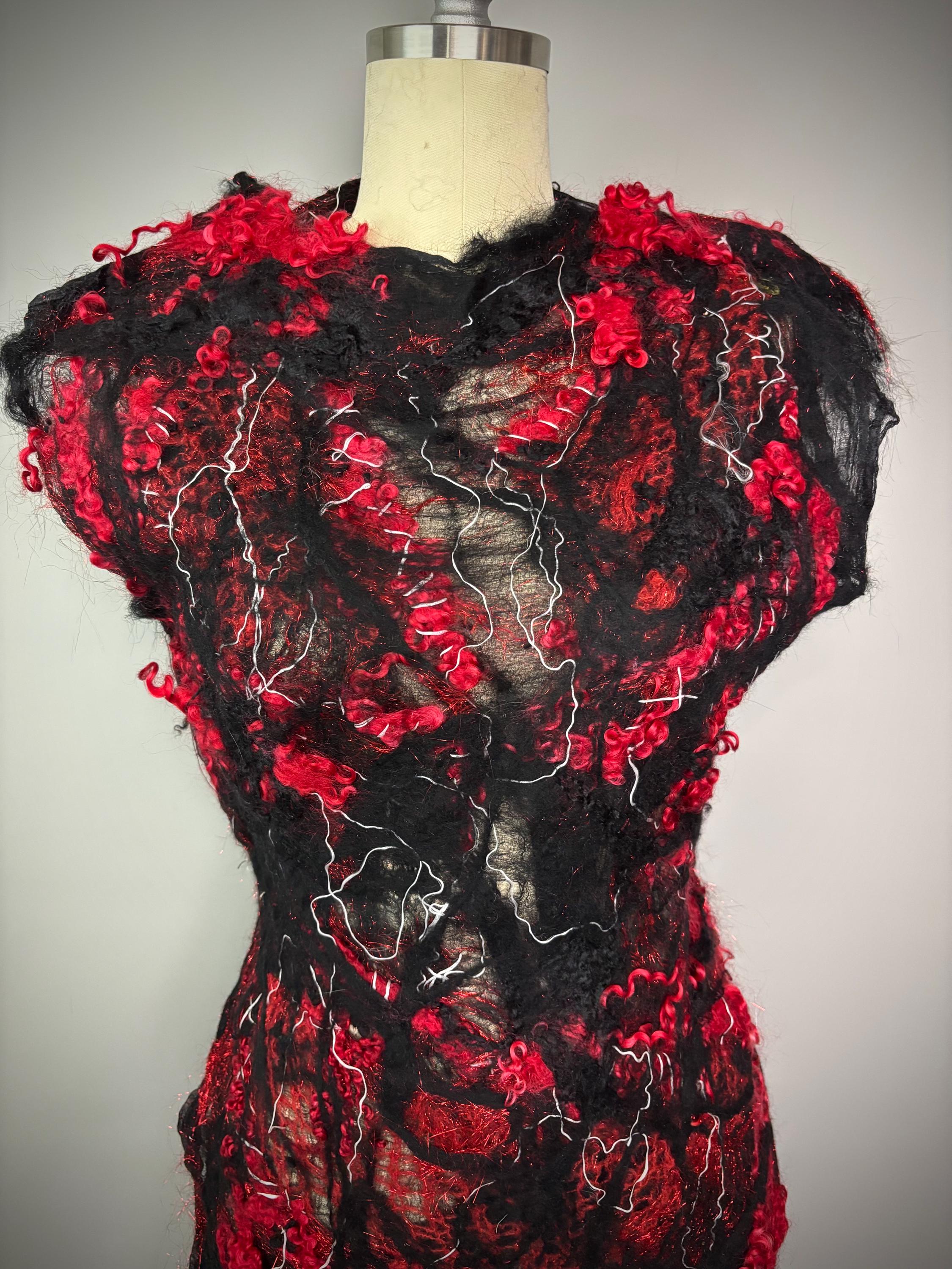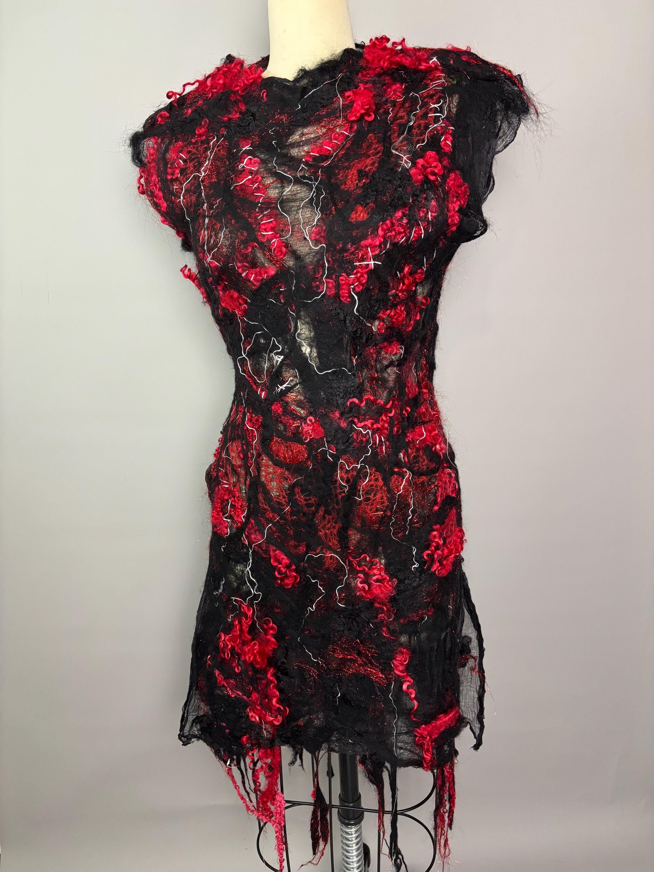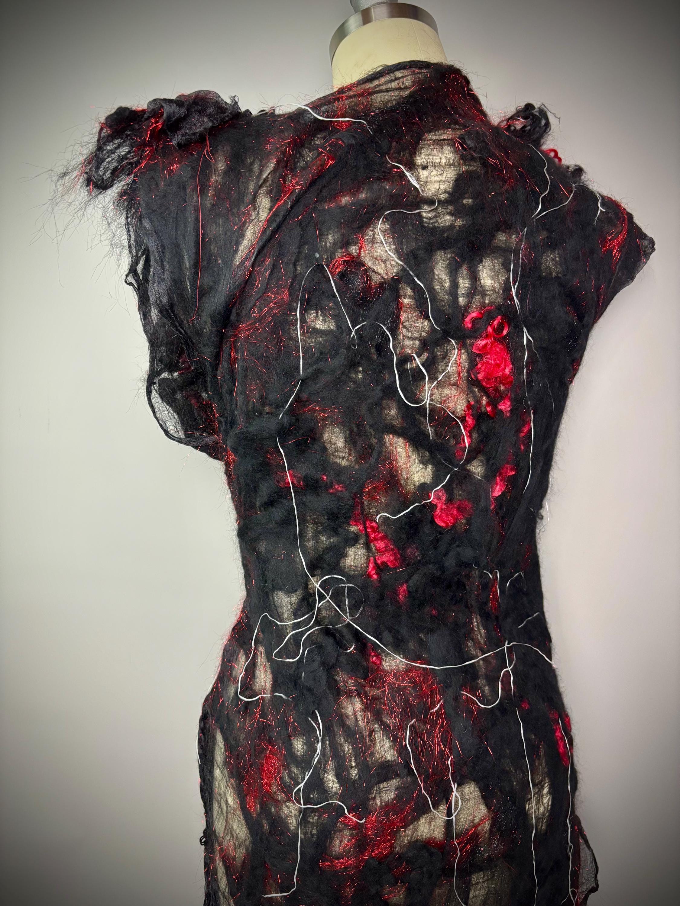100% black silk gauze with red and black wool roving felted into the fabric. Dress has asymmetrical hem with red metallic filament, crimped Alpaca curls and white dental floss stitching. Hidden side seam snap closure, finishing approximately at crotch level.