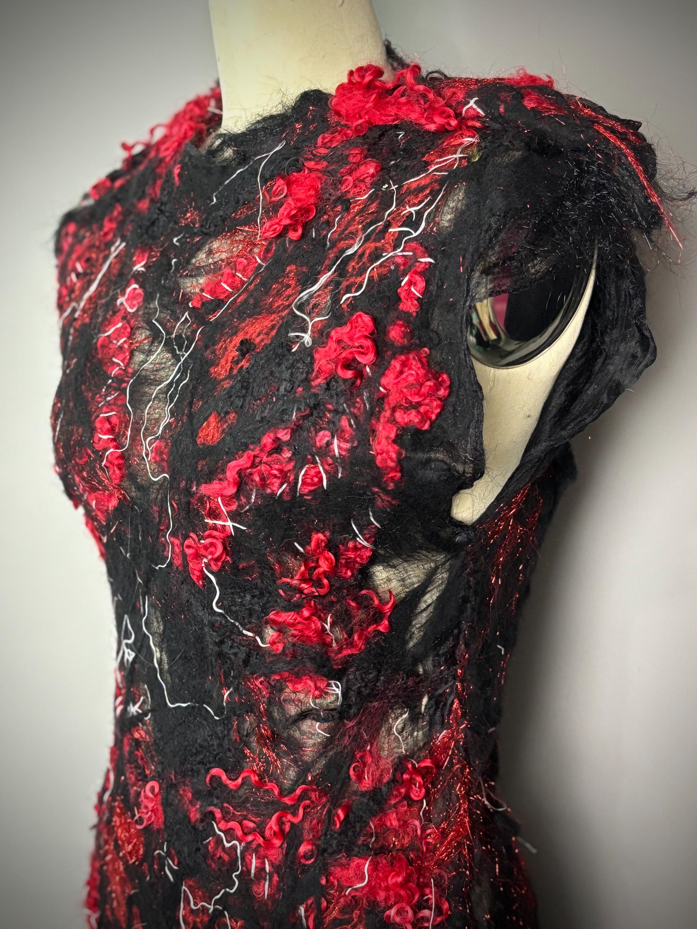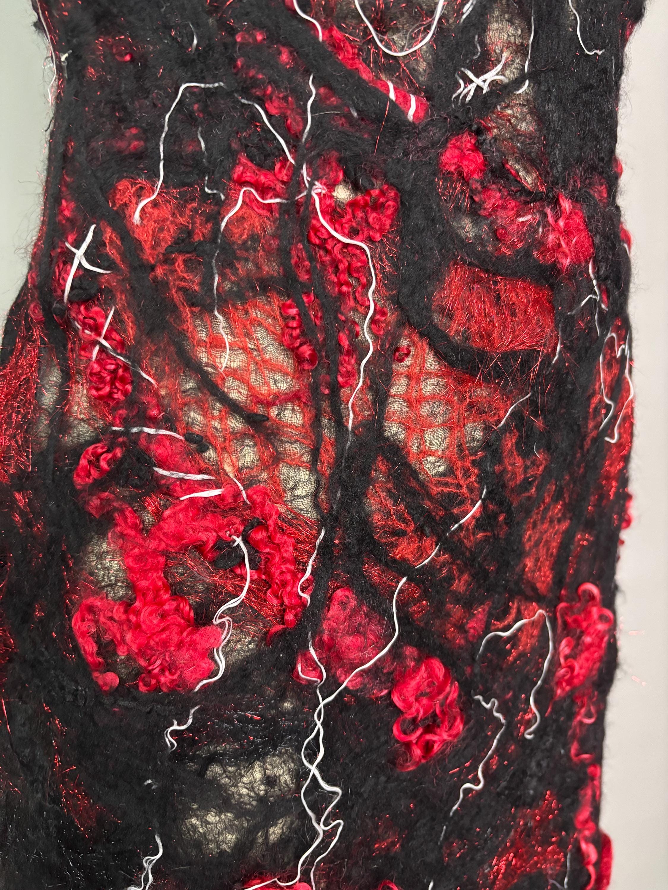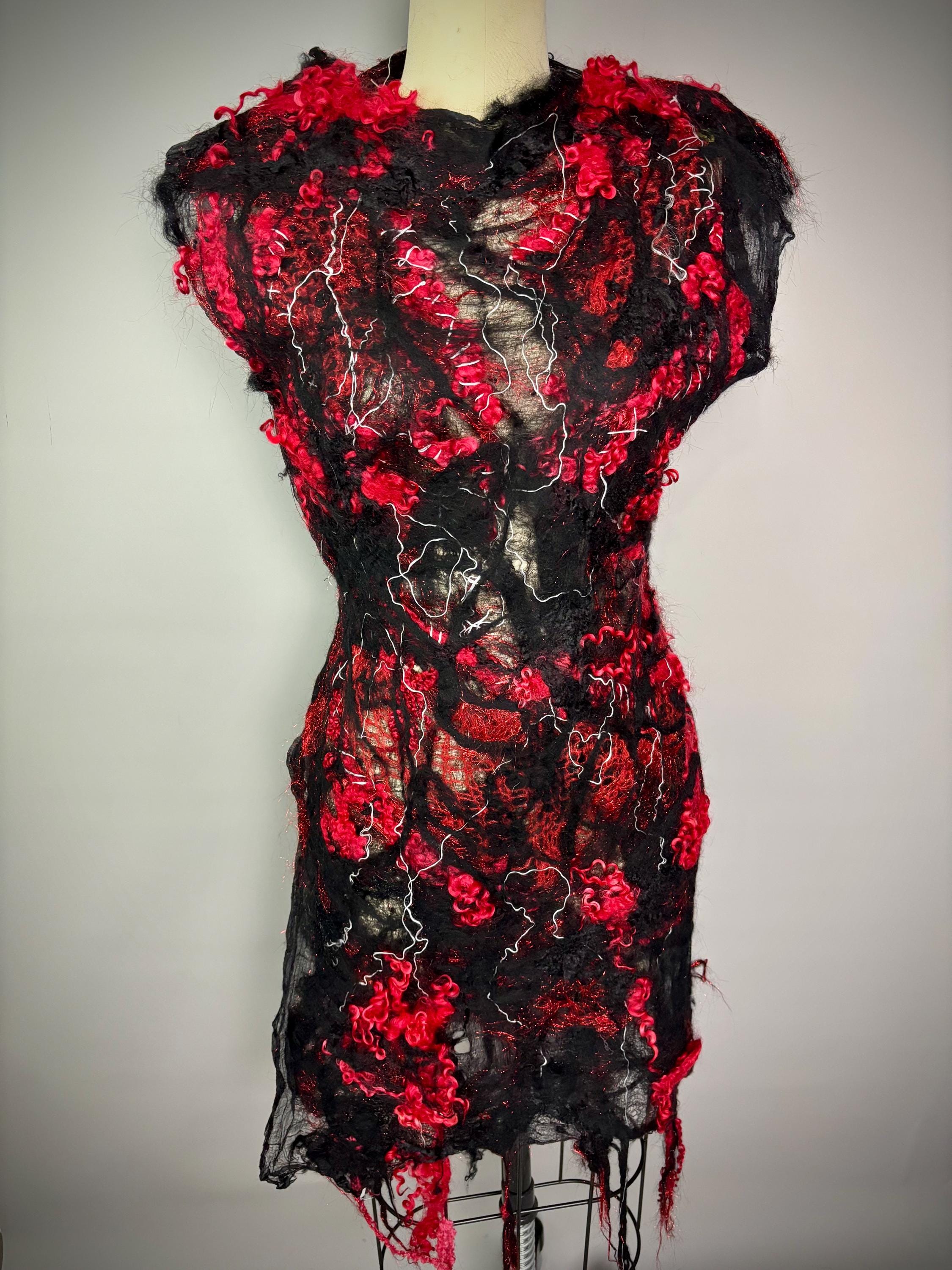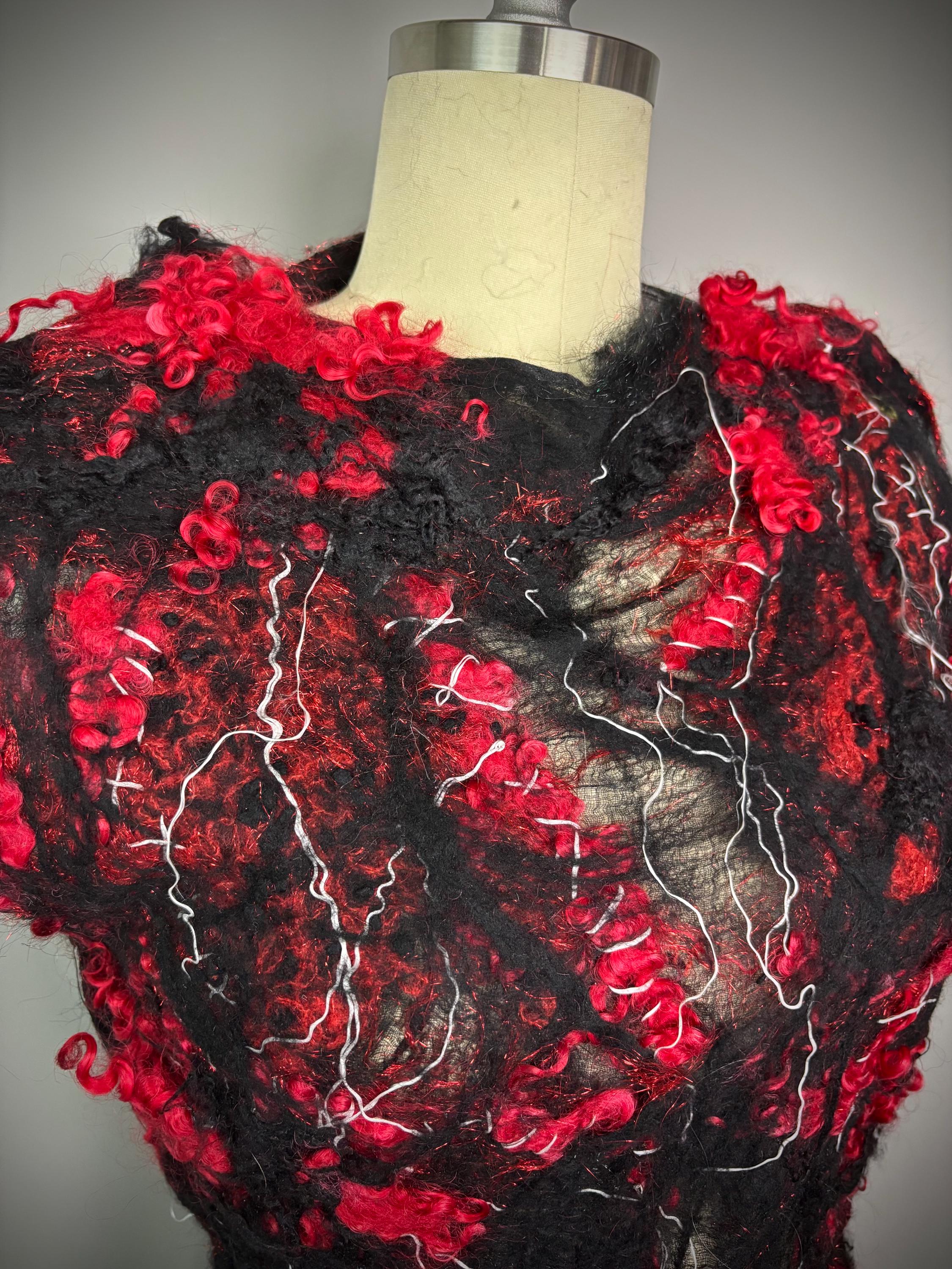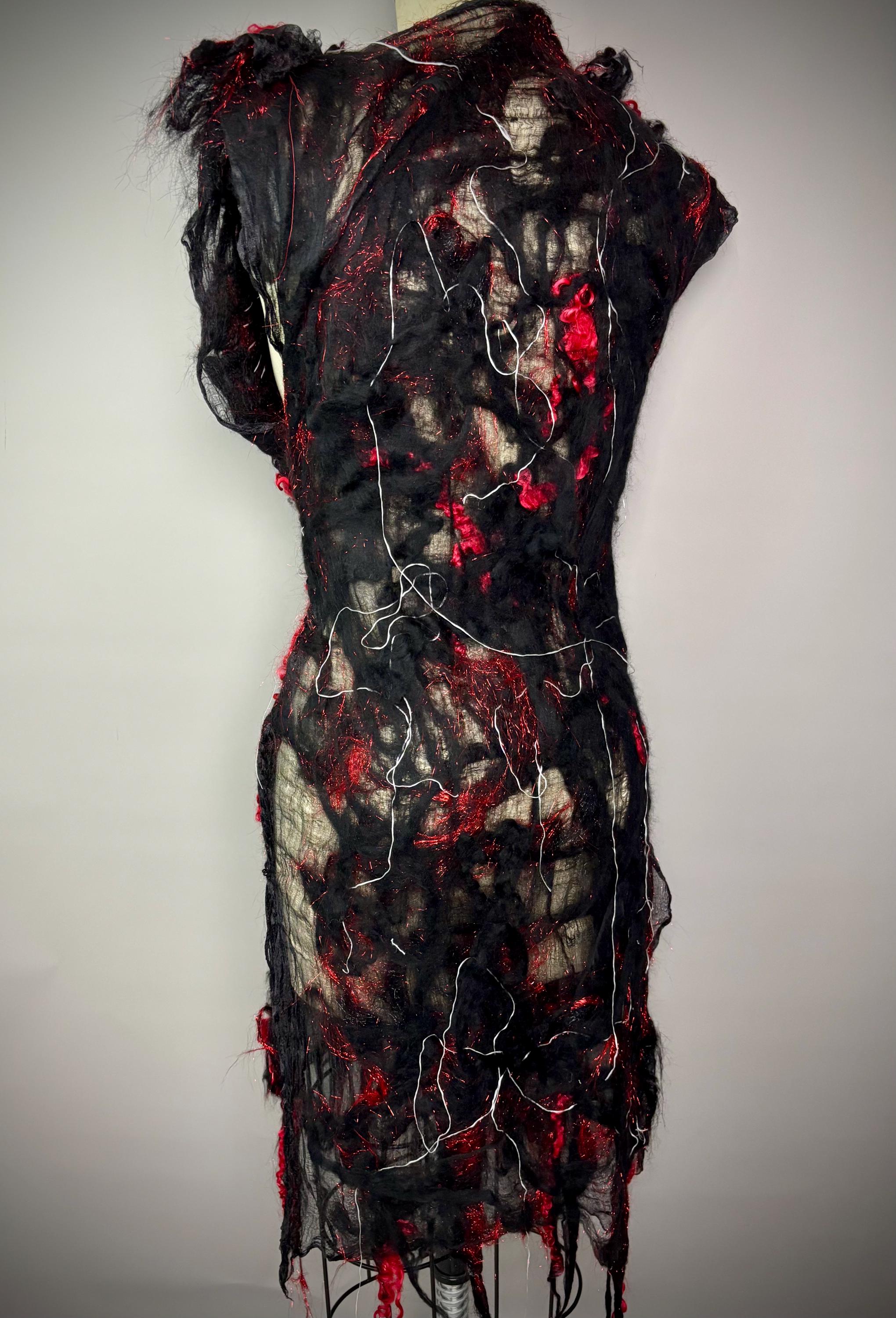 100% black silk gauze with red and black wool roving felted into the fabric. Dress has asymmetrical hem with red metallic filament, crimped Alpaca curls and white dental floss stitching. Hidden side seam snap closure, finishing approximately at crotch level.