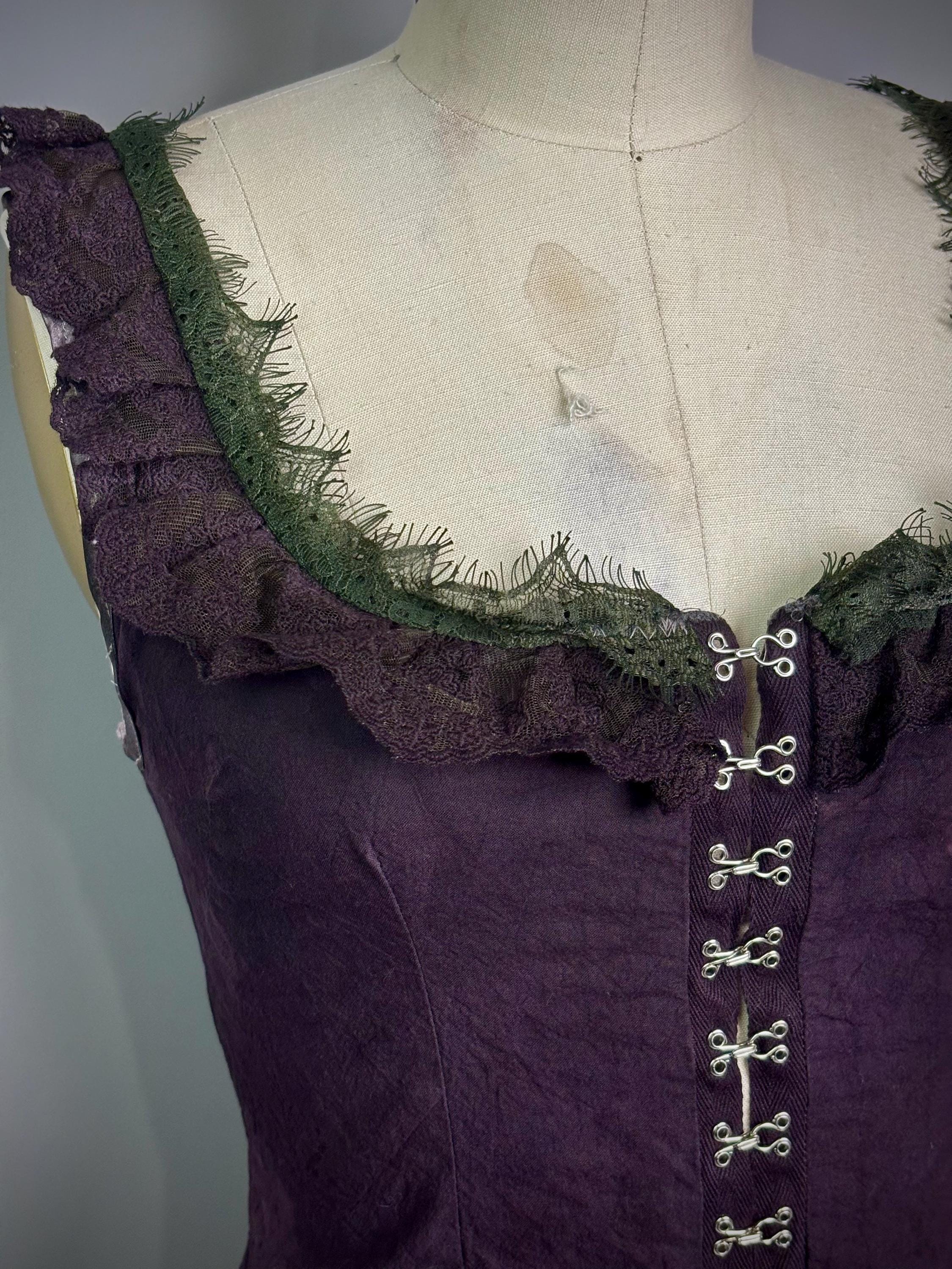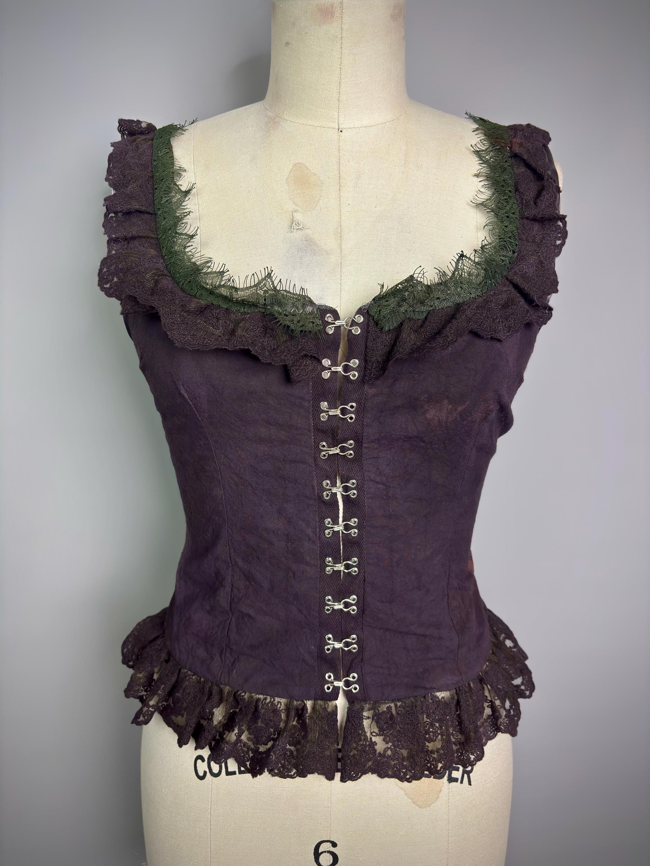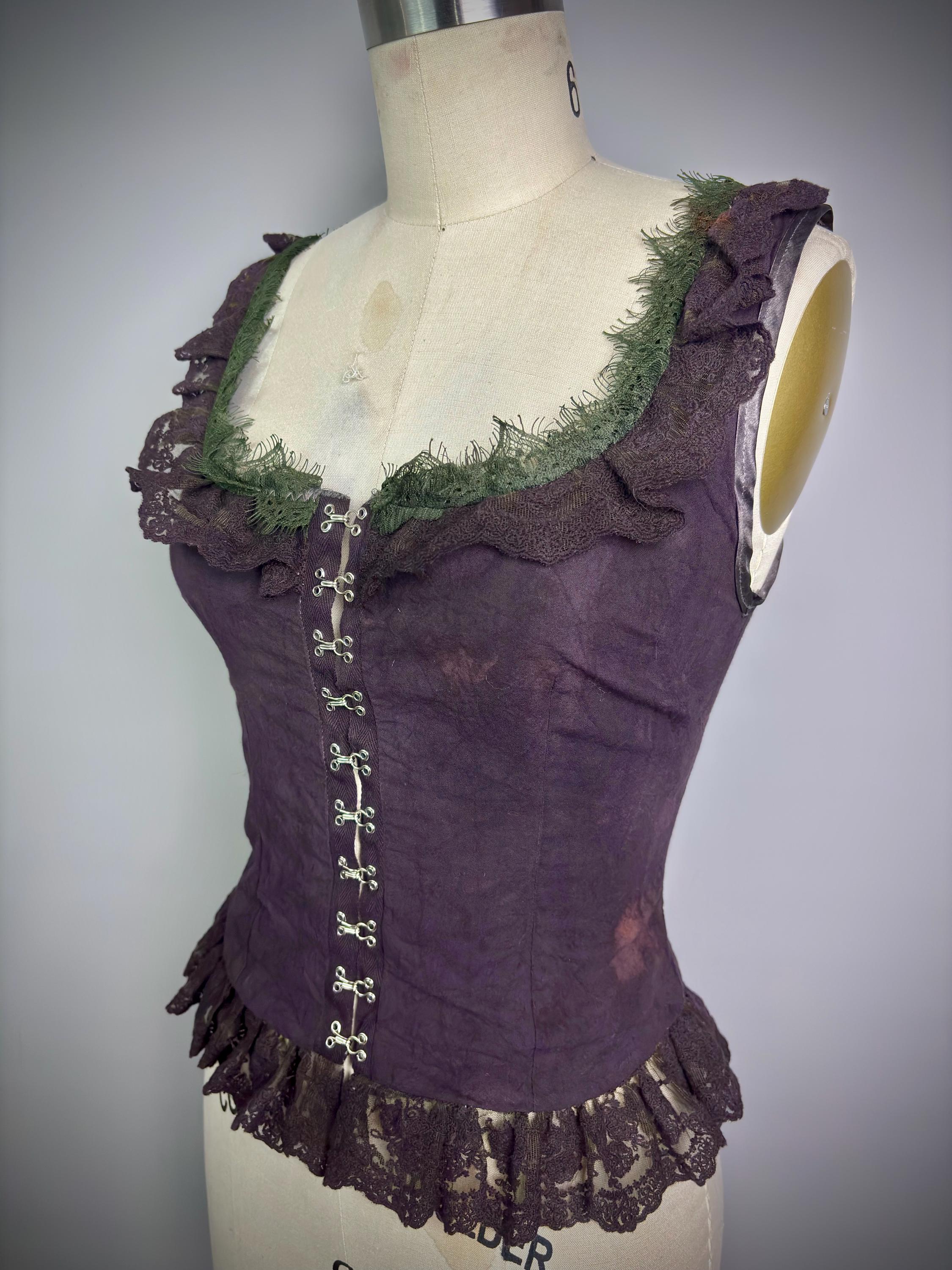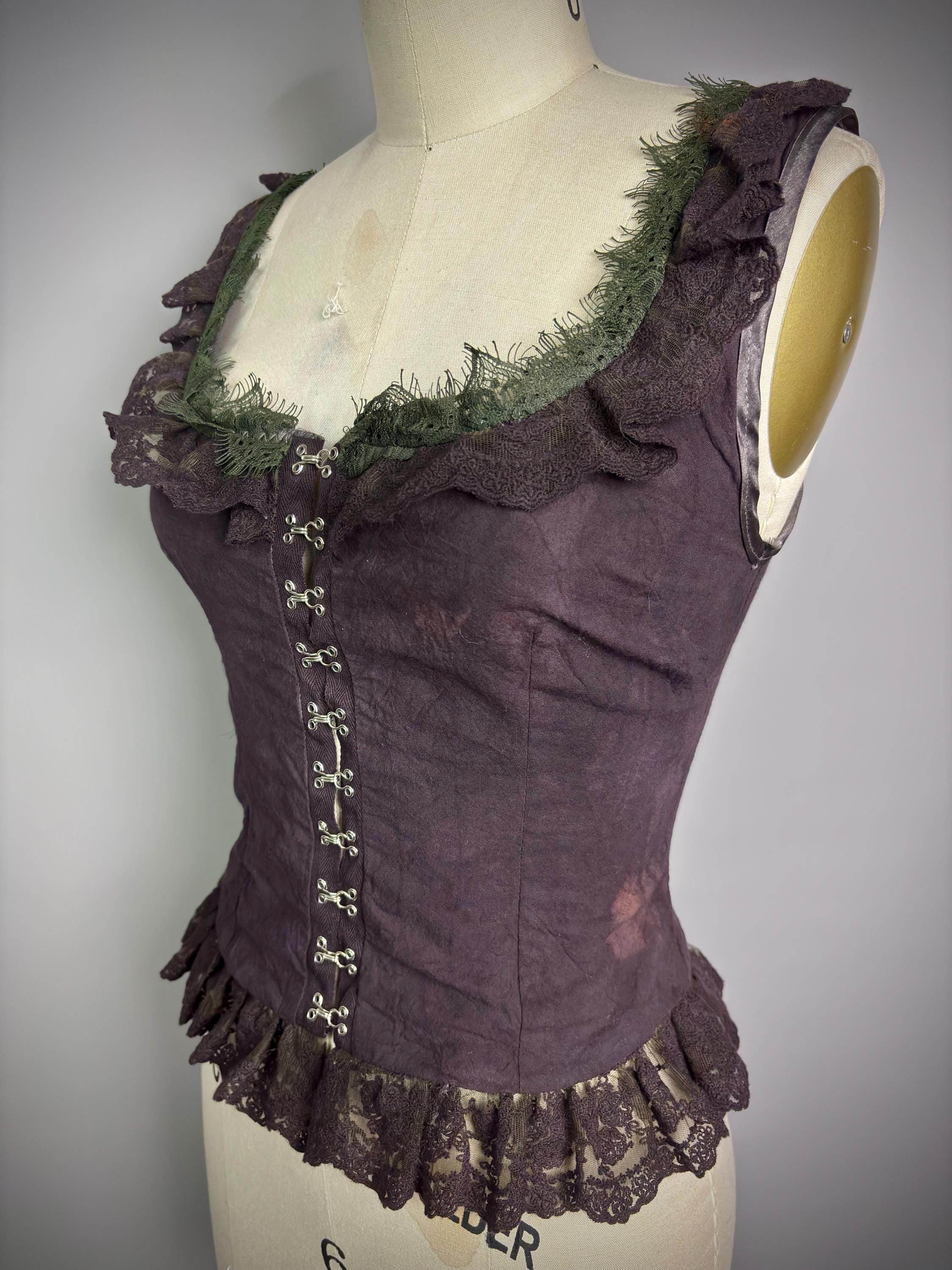 Hand dyed purple milkmaid top with dingy green eyelash lace trim and jumbo hook & eye closure.