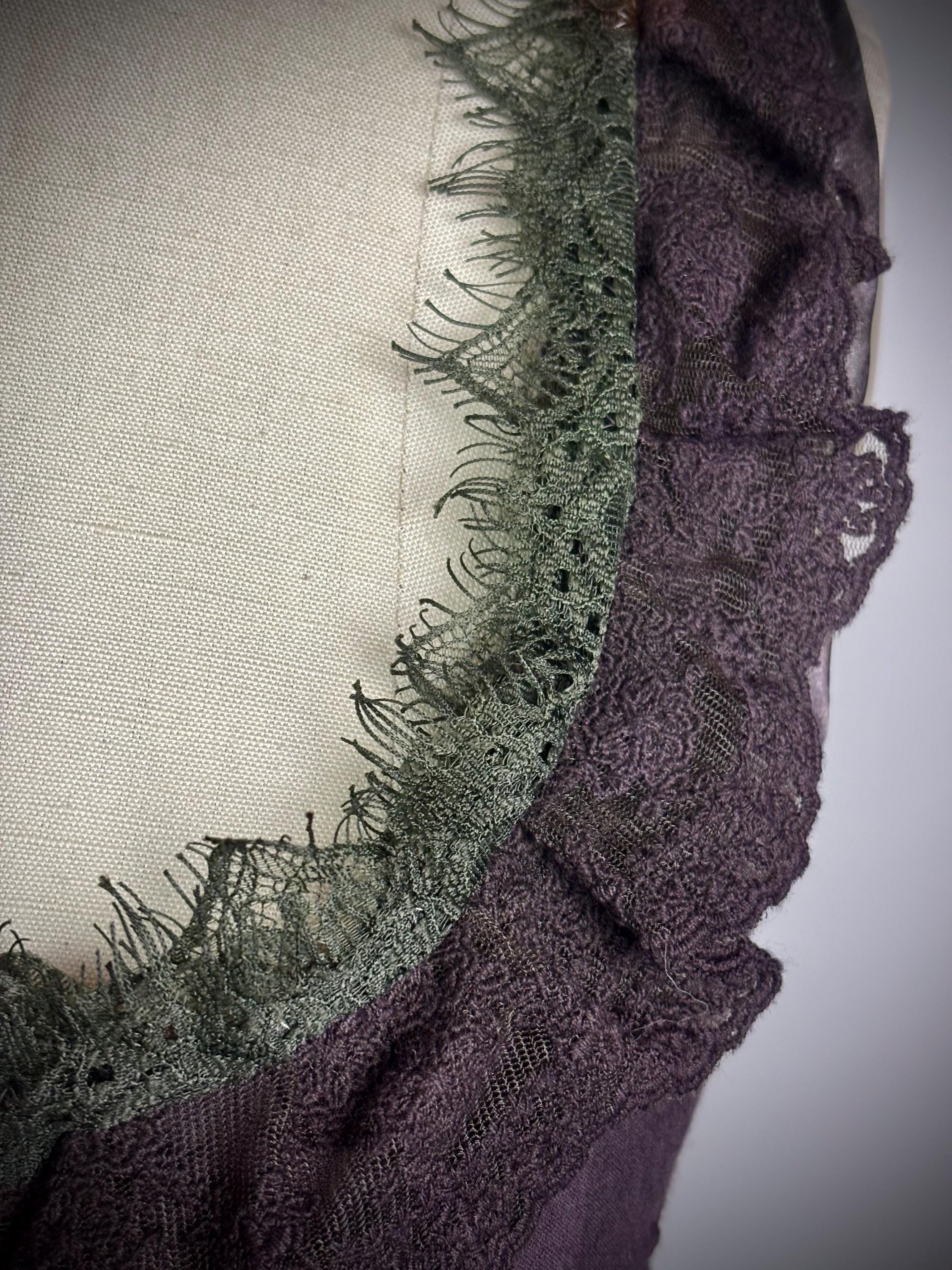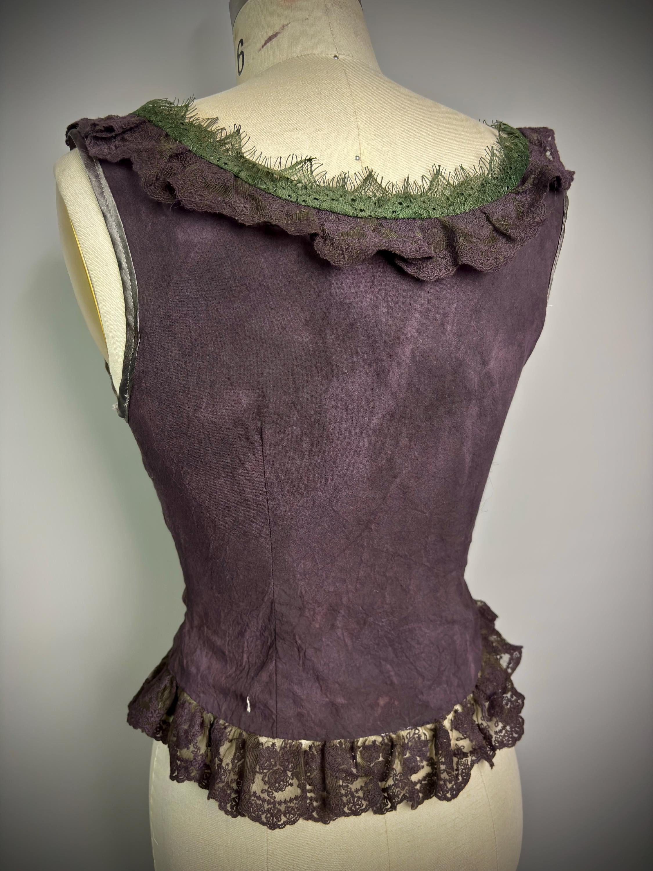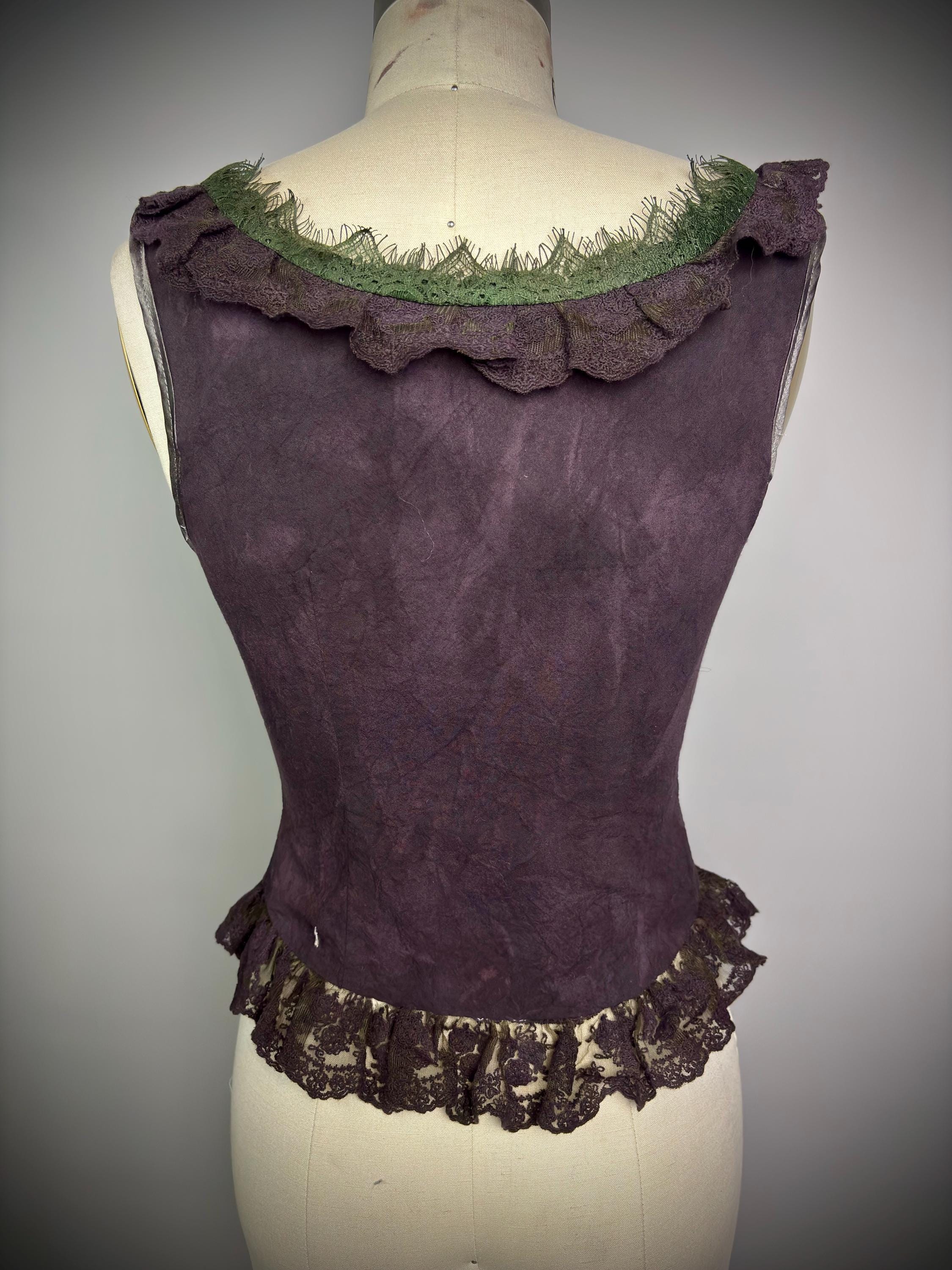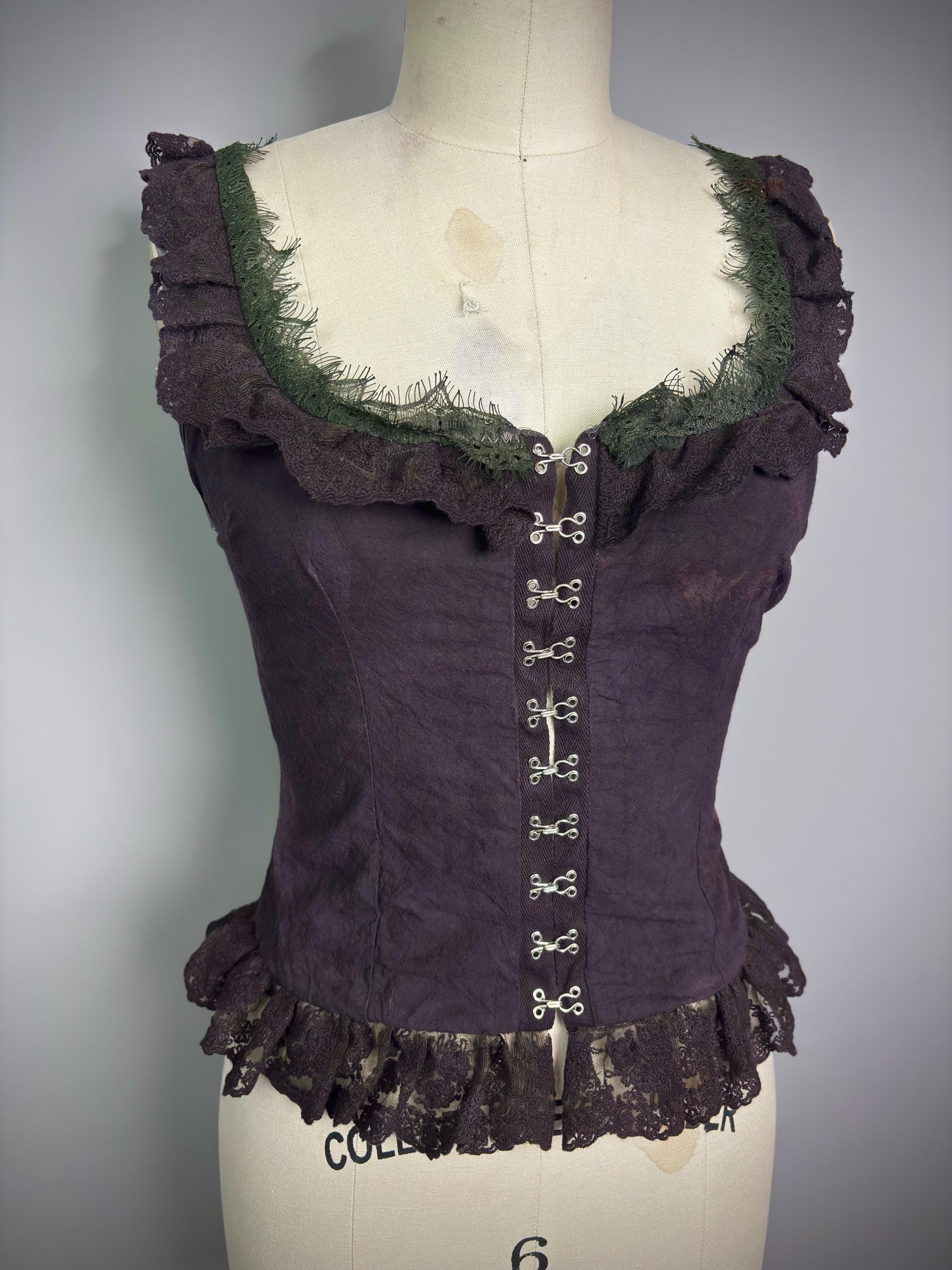 Hand dyed purple milkmaid top with dingy green eyelash lace trim and jumbo hook & eye closure.