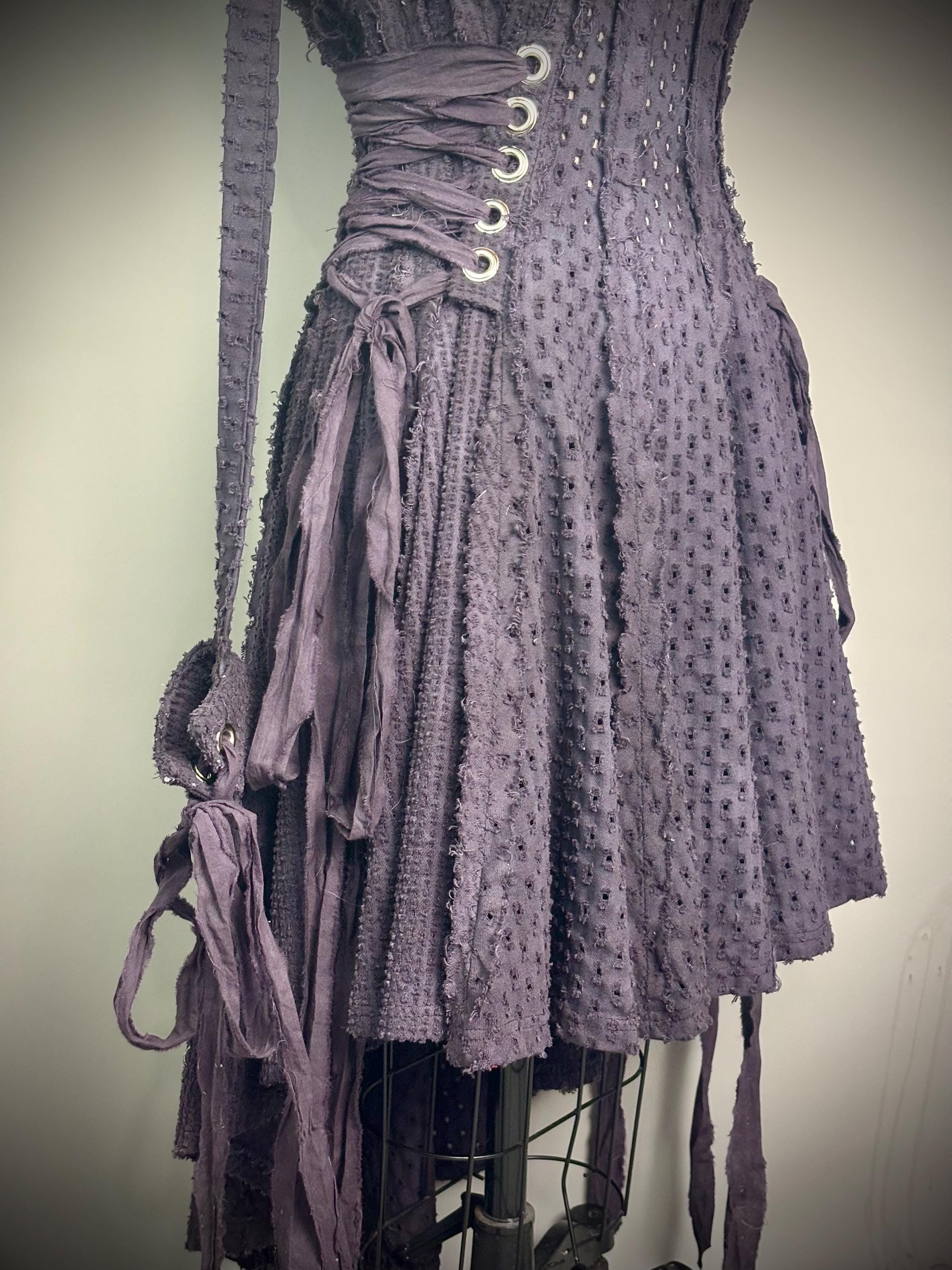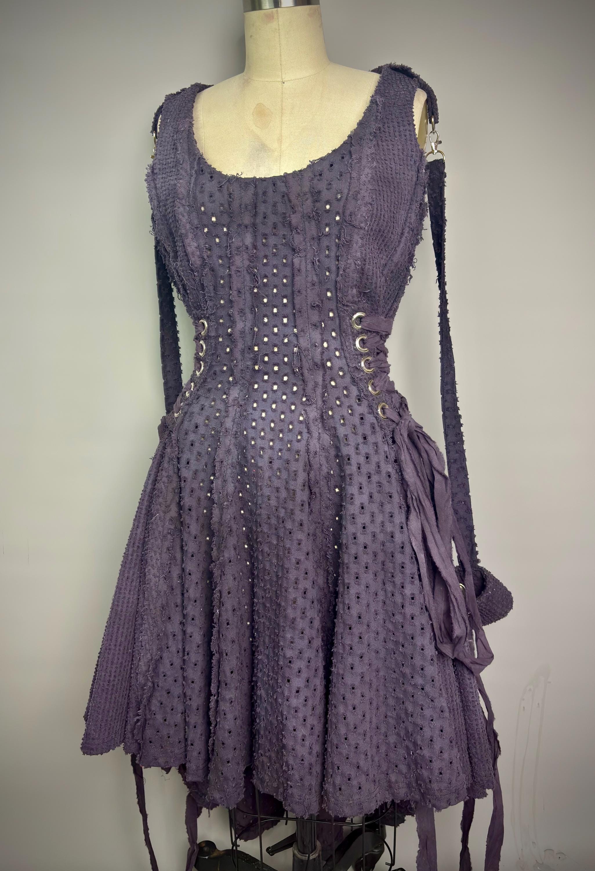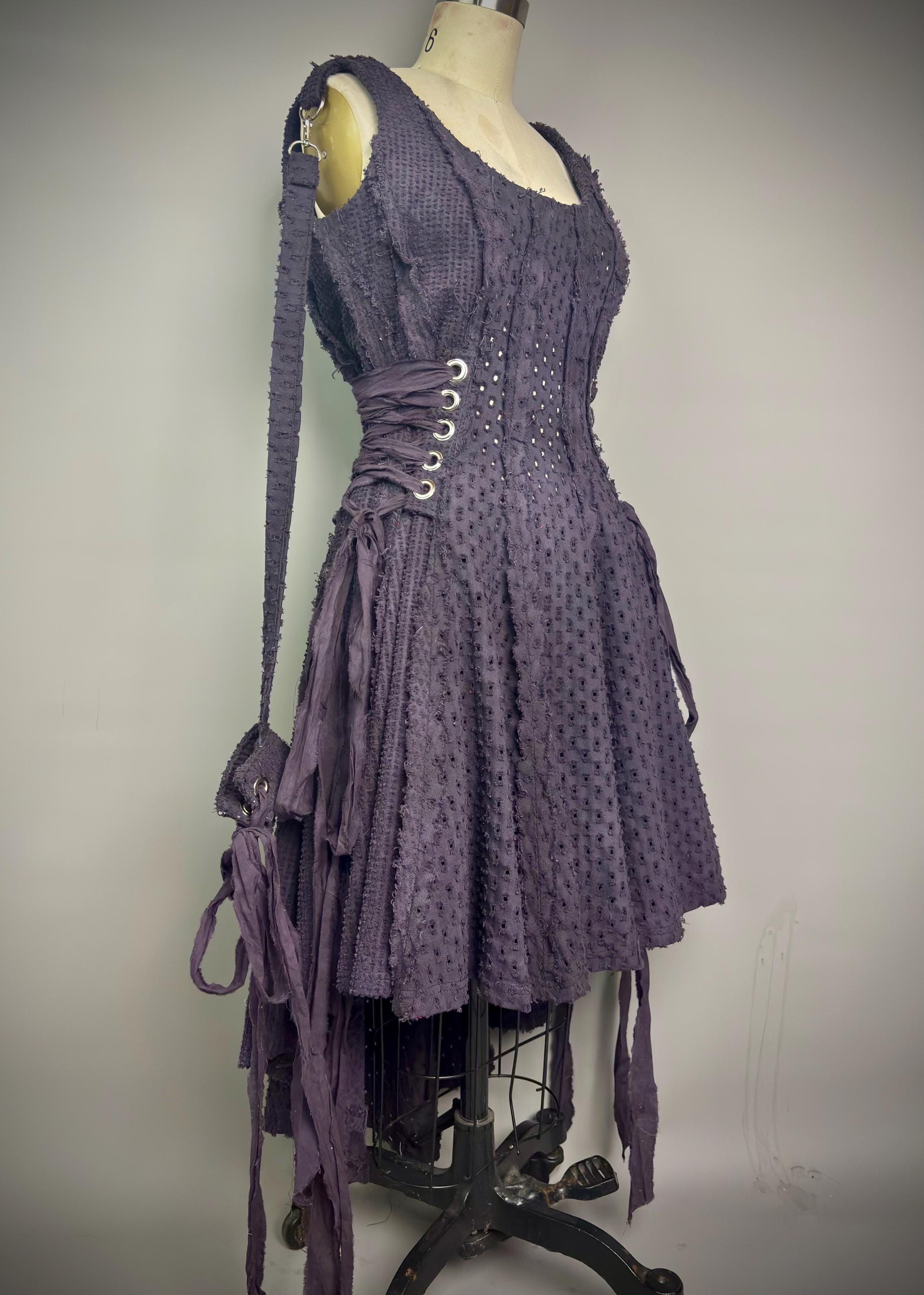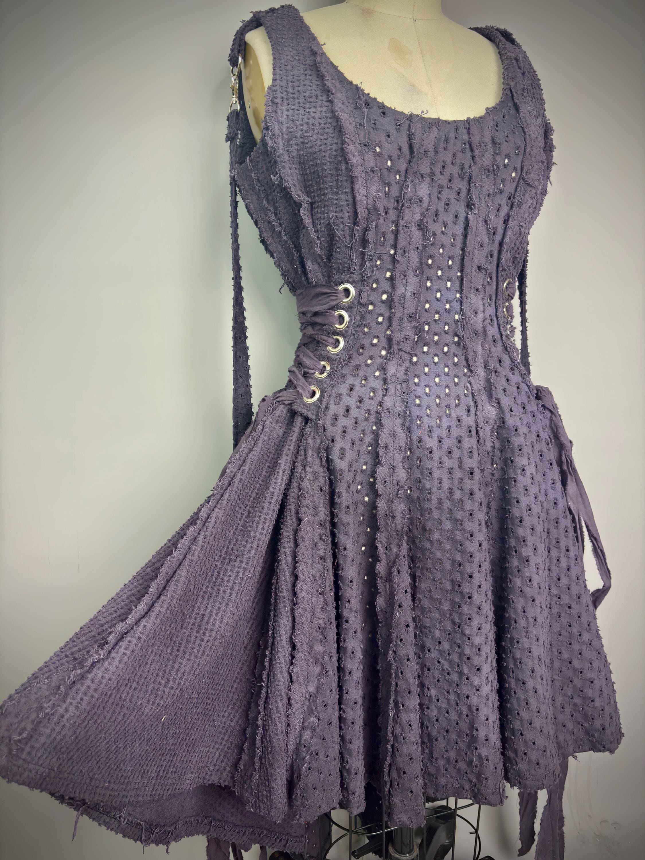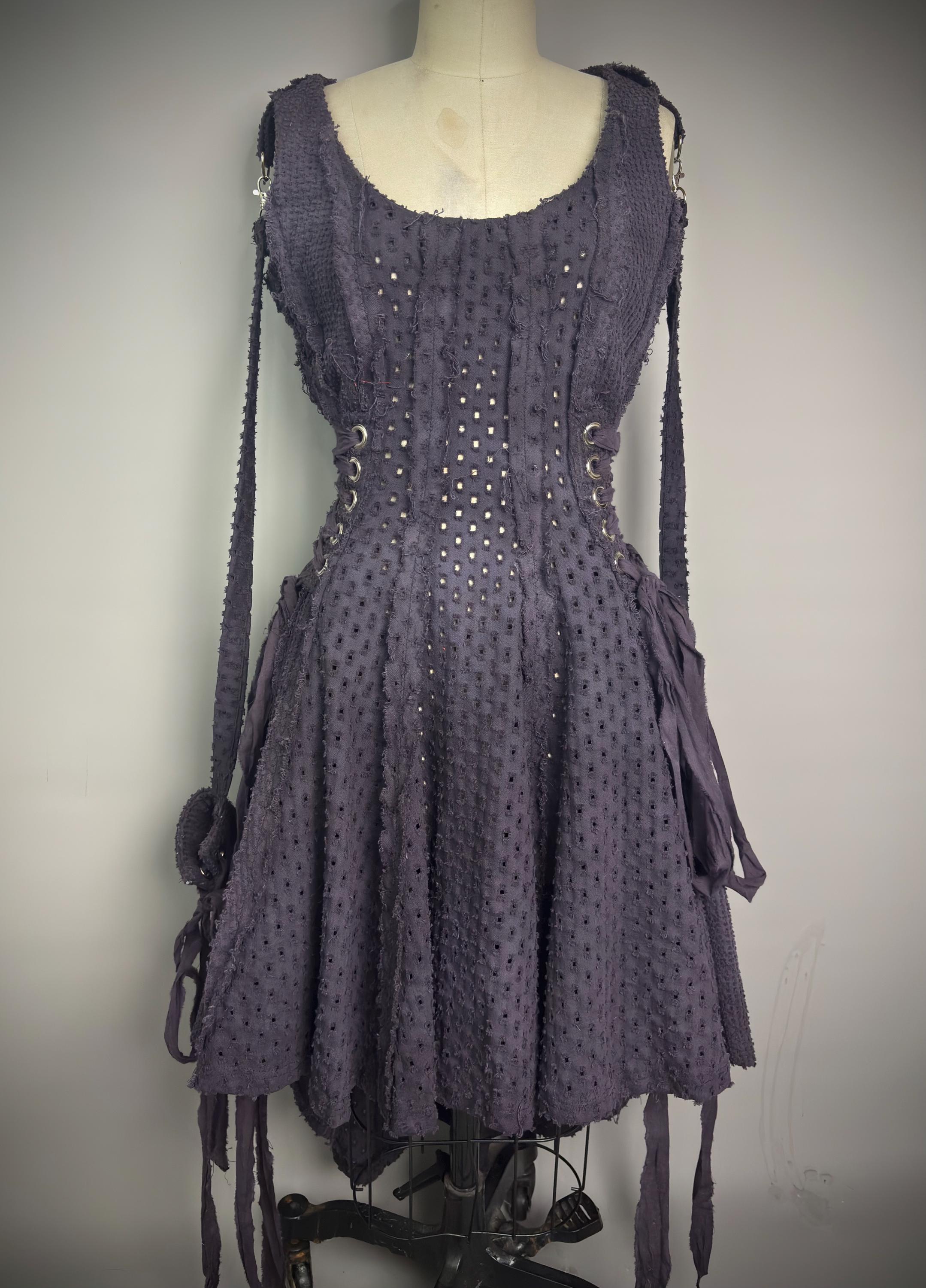 Hand dyed faded purple-ish denim dress with distressed holes, reversed seams, and detachable shoulder straps/cuffs. Dras features a hi-low hem with adjustable side lacing through jumbo grommets.