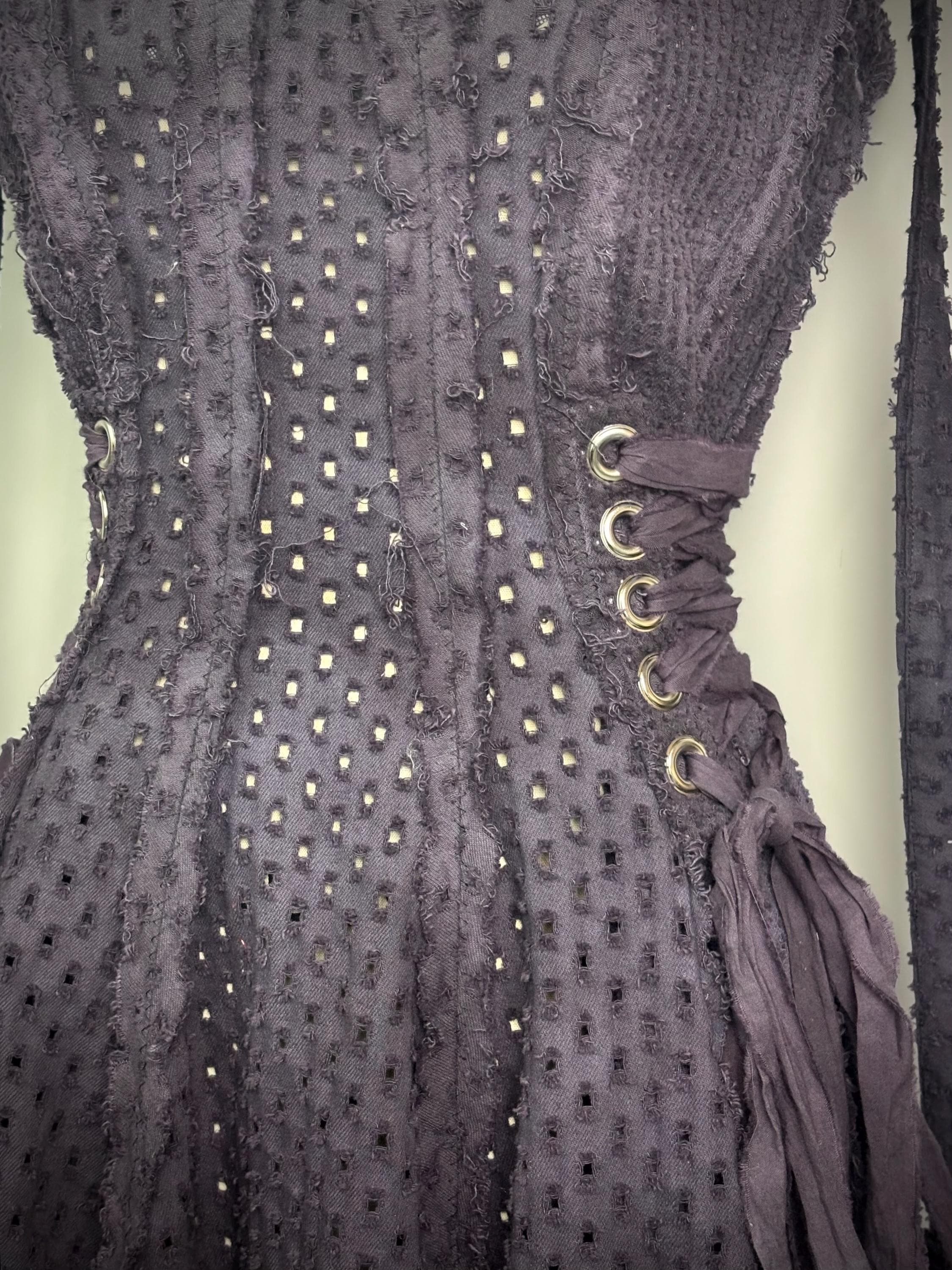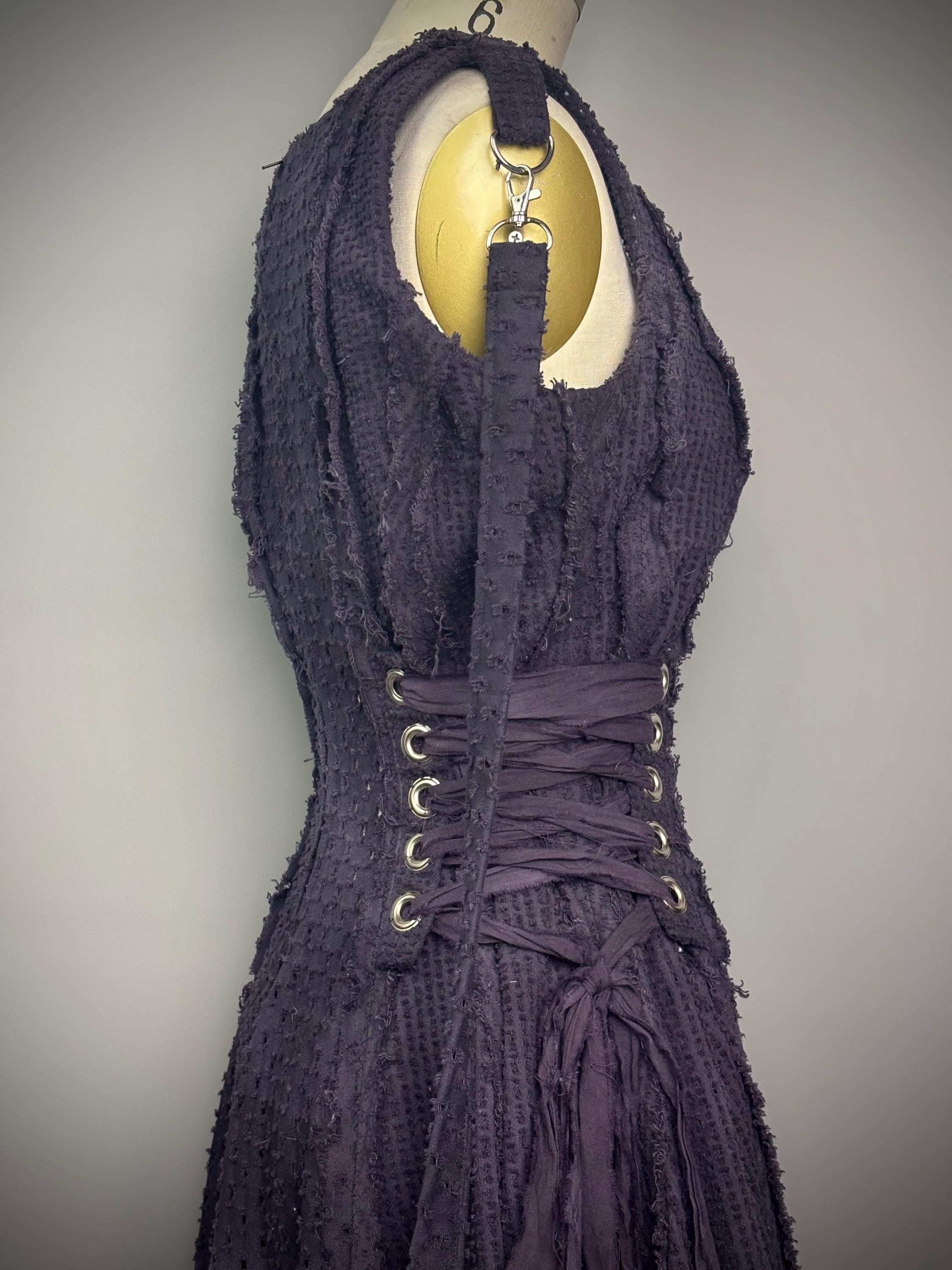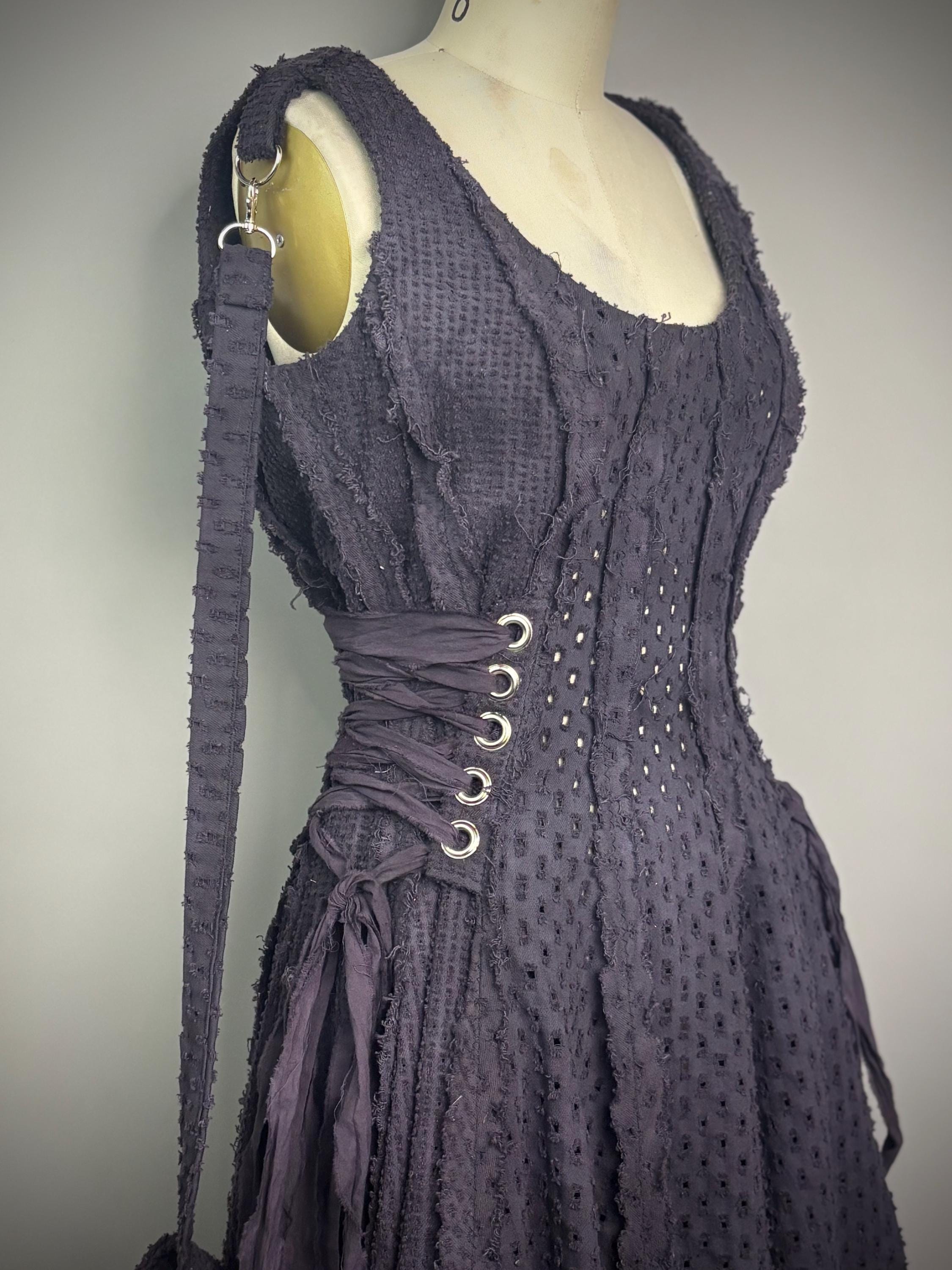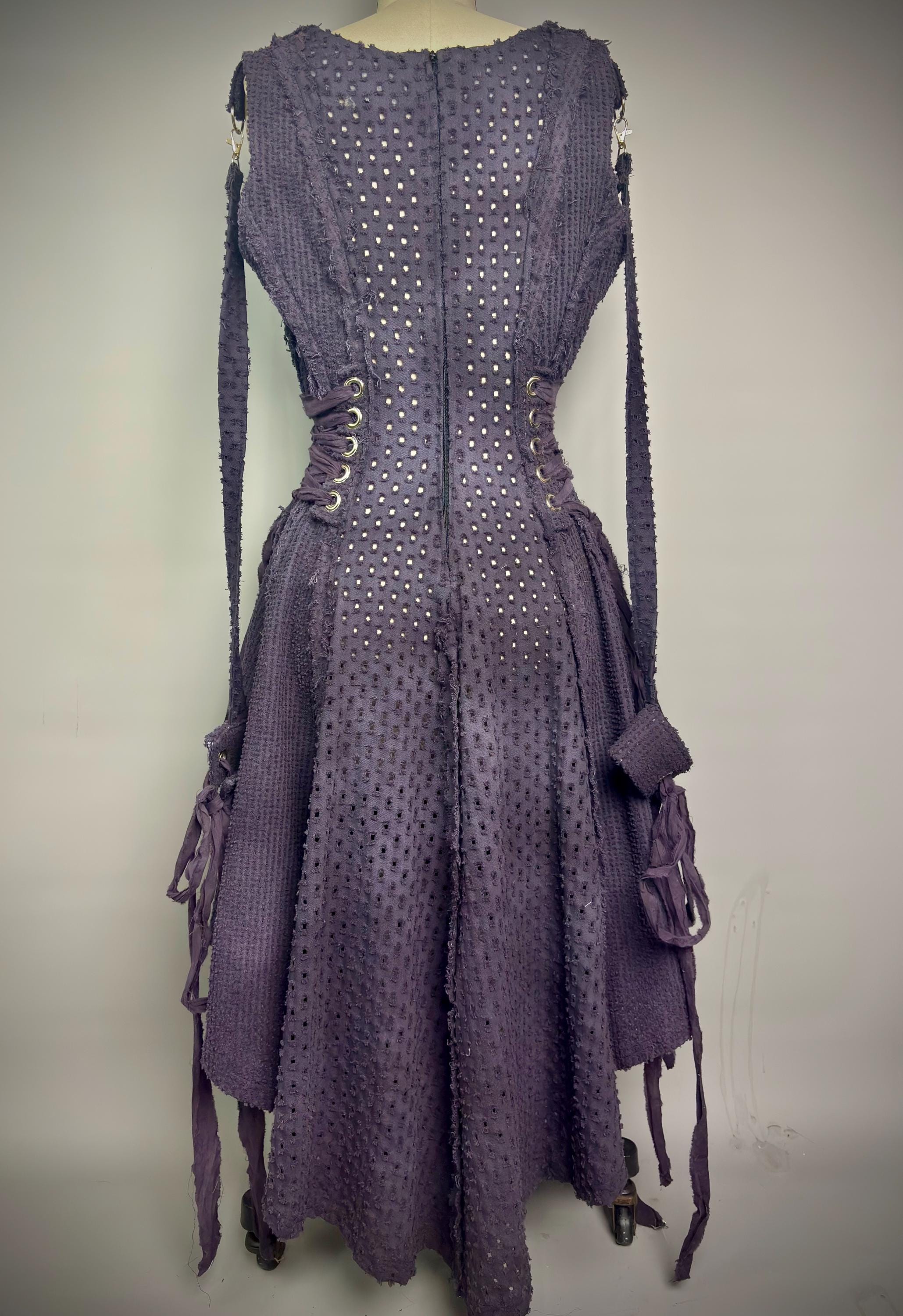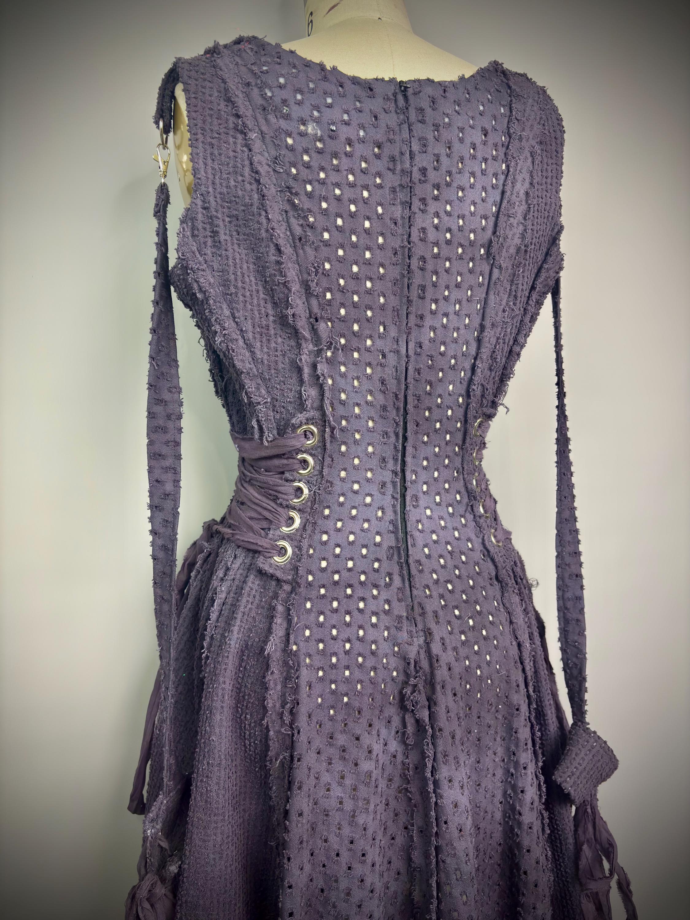 Hand dyed faded purple-ish denim dress with distressed holes, reversed seams, and detachable shoulder straps/cuffs. Dras features a hi-low hem with adjustable side lacing through jumbo grommets.