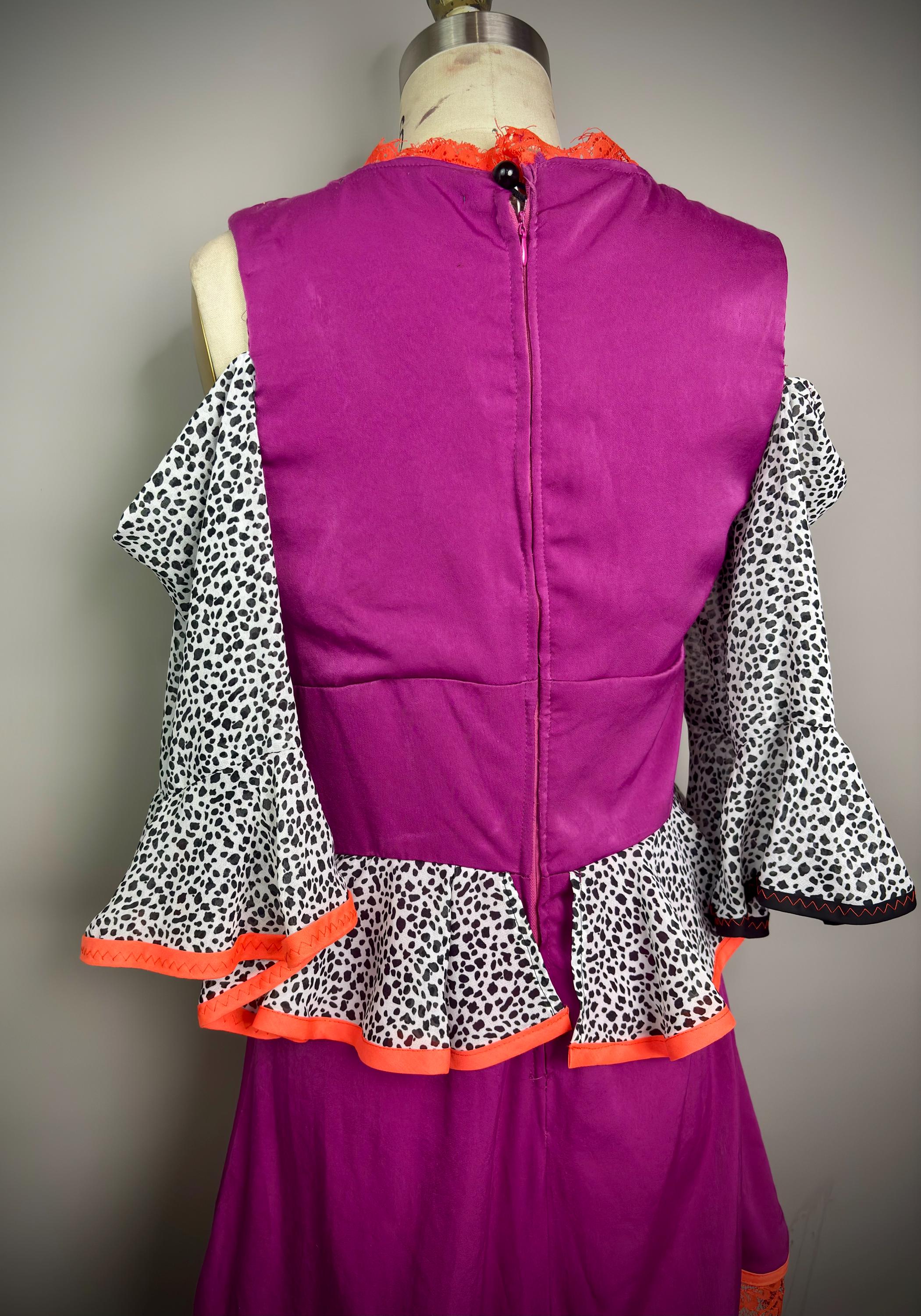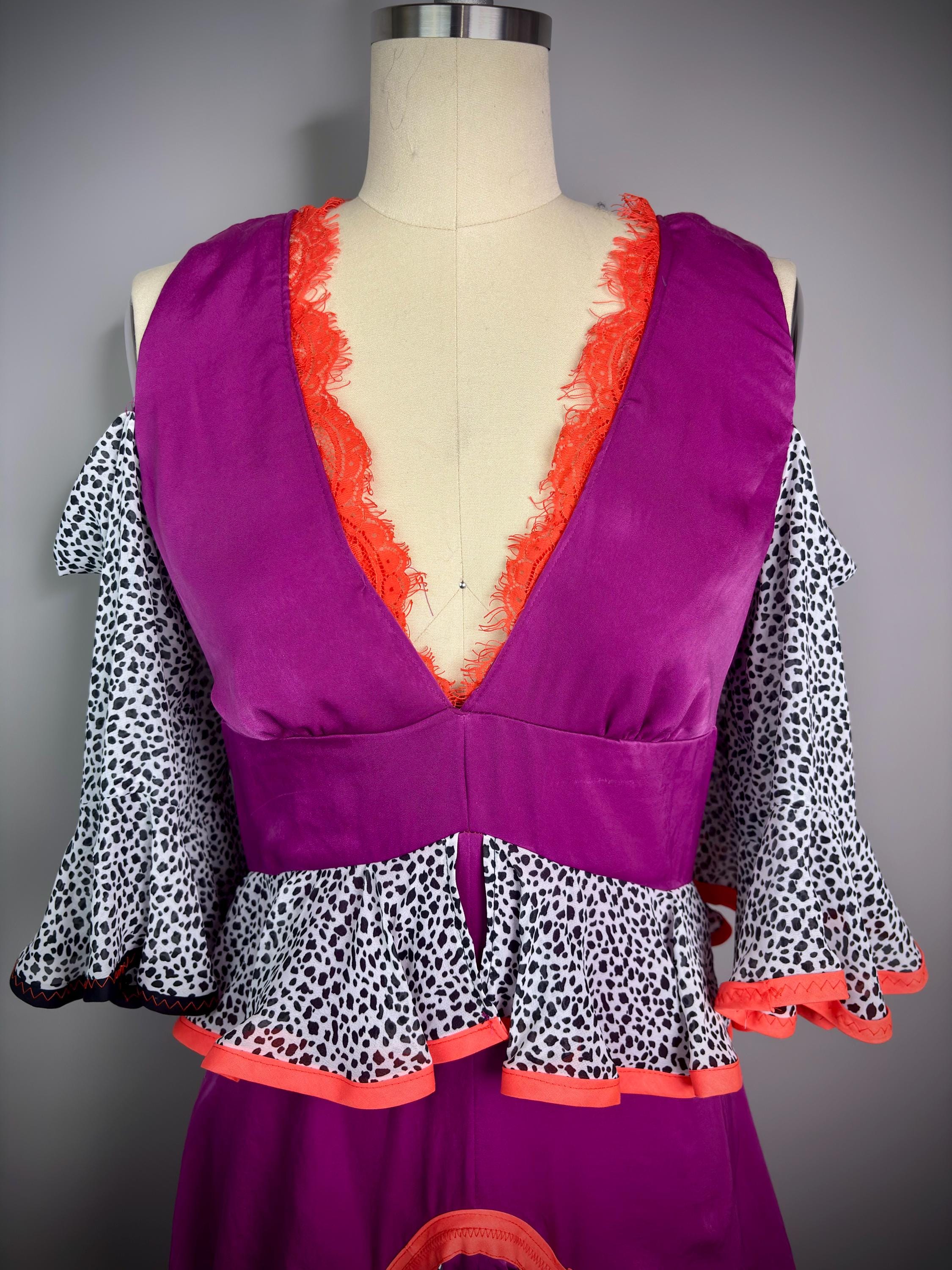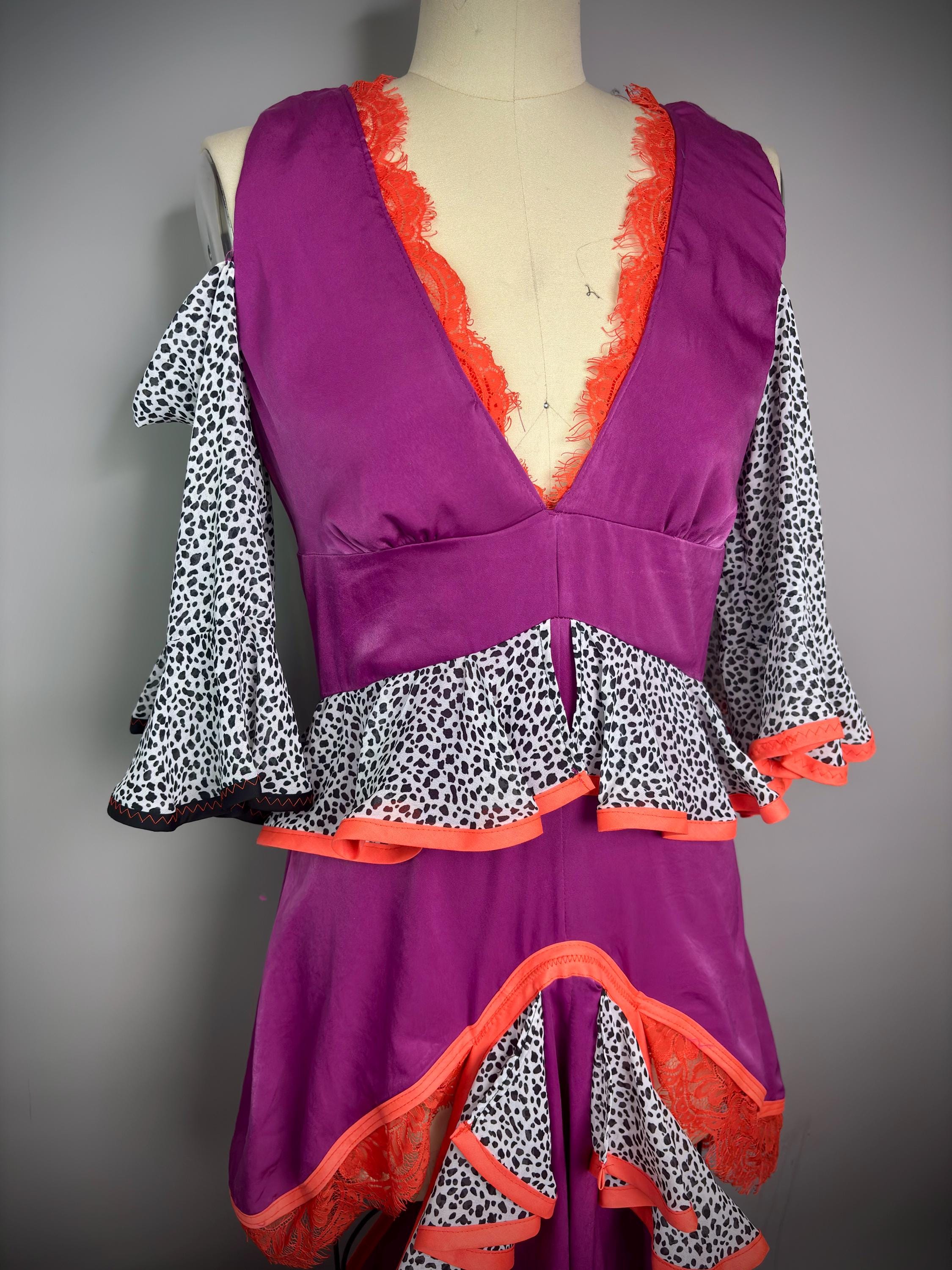 Introducing the ultimate statement piece for those who dare to be different - the one-of-a-kind Alternative Dress by AntiLabel. This extraordinary dress combines edgy style with feminine charm. With its daring cutout shoulders and hem, it exudes confidence and individuality. The silky pink body sets the stage for the striking black and white animal print ruffles, which are expertly trimmed with neon orange bias tape for an electrifying touch. Sample from a previous collection. Bodice is lined and there is a hidden zip back closure. Dress covers crotch, but reveals most of leg.