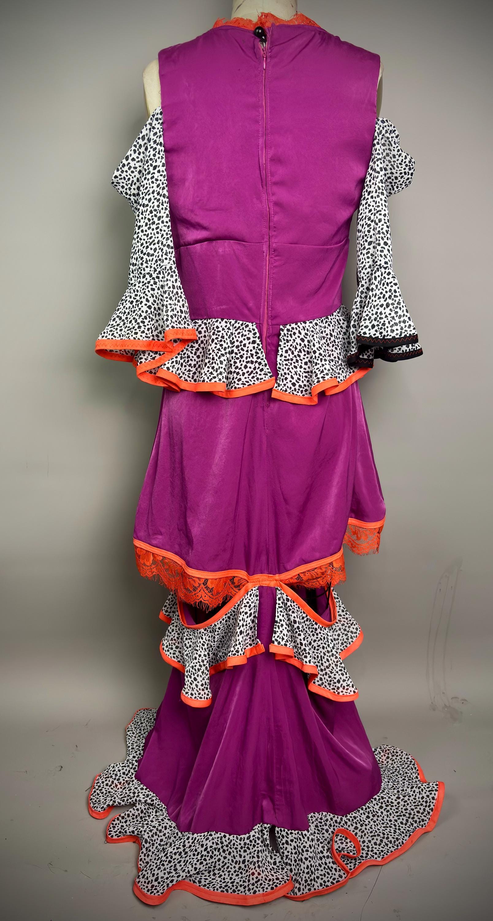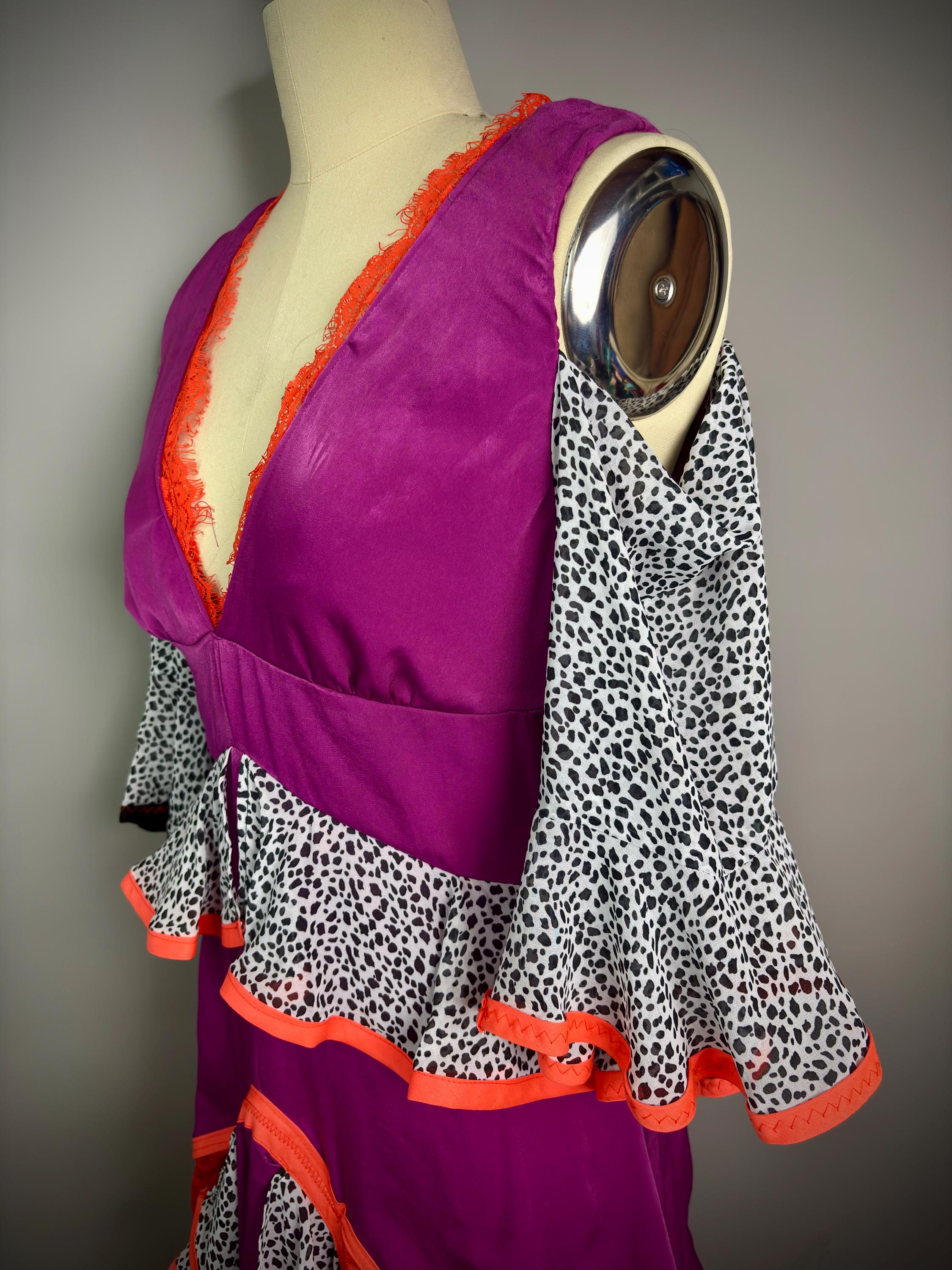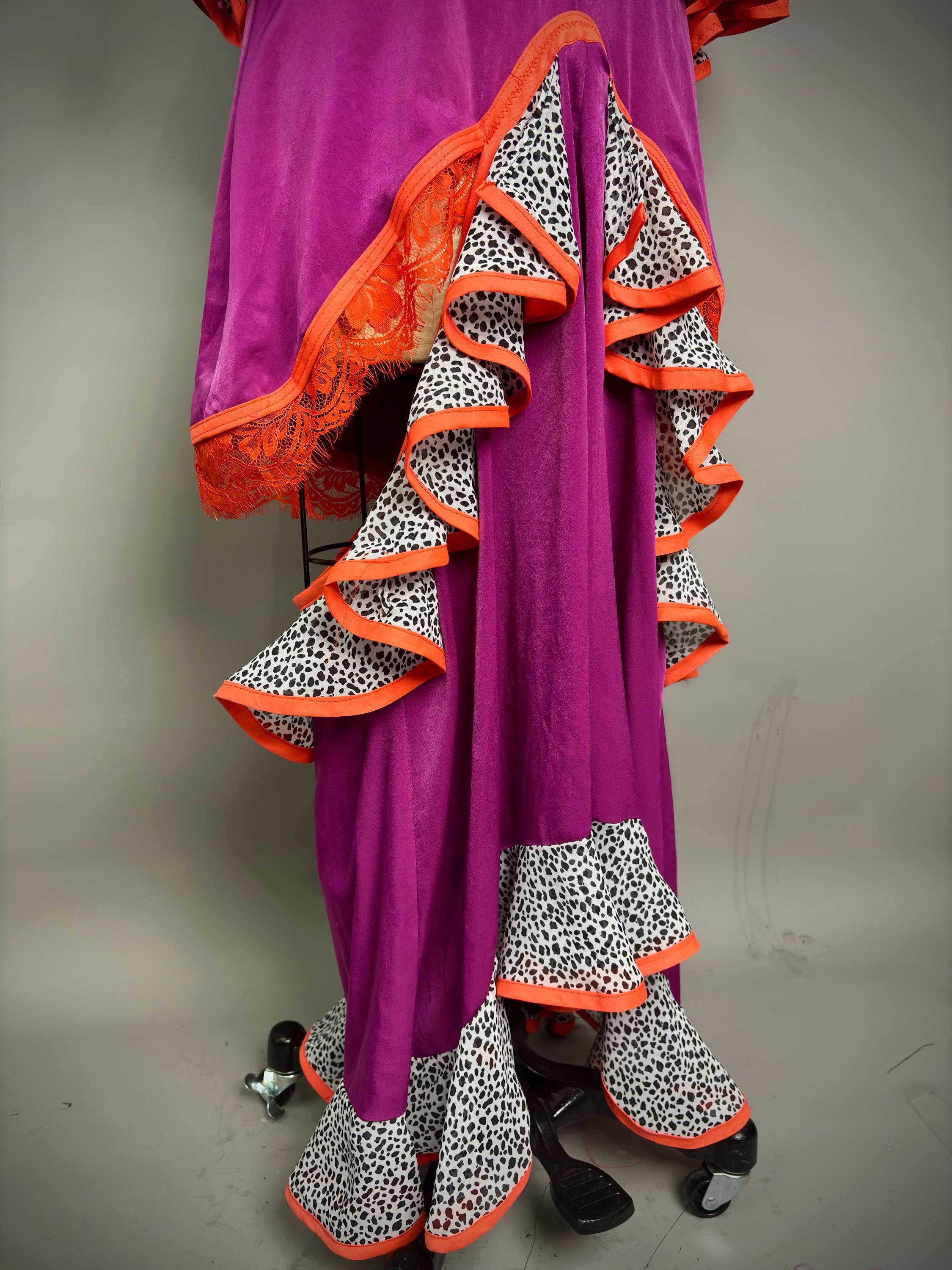 Introducing the ultimate statement piece for those who dare to be different - the one-of-a-kind Alternative Dress by AntiLabel. This extraordinary dress combines edgy style with feminine charm. With its daring cutout shoulders and hem, it exudes confidence and individuality. The silky pink body sets the stage for the striking black and white animal print ruffles, which are expertly trimmed with neon orange bias tape for an electrifying touch. Sample from a previous collection. Bodice is lined and there is a hidden zip back closure. Dress covers crotch, but reveals most of leg.