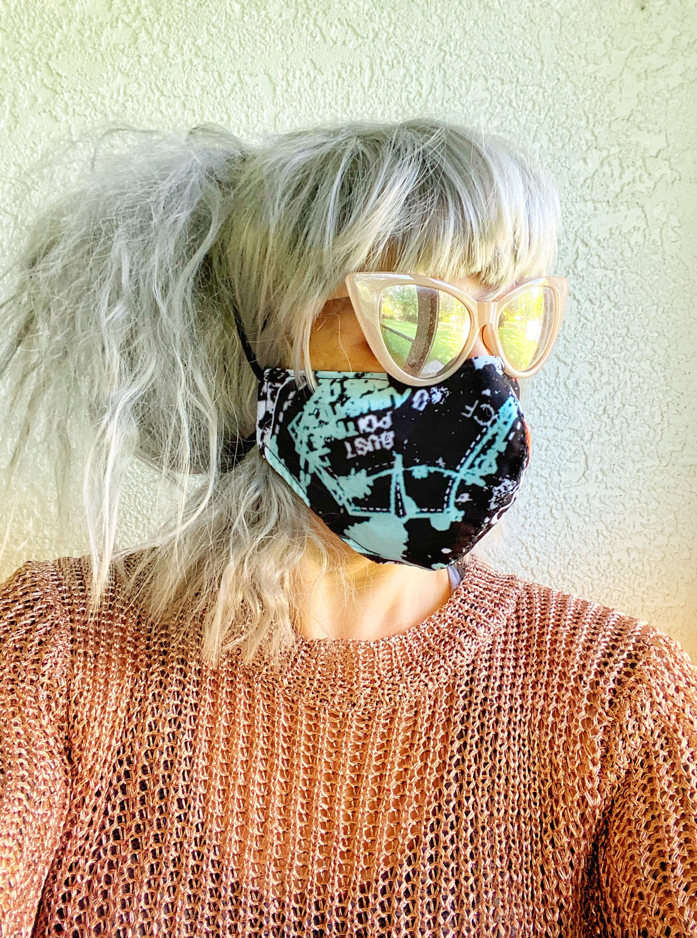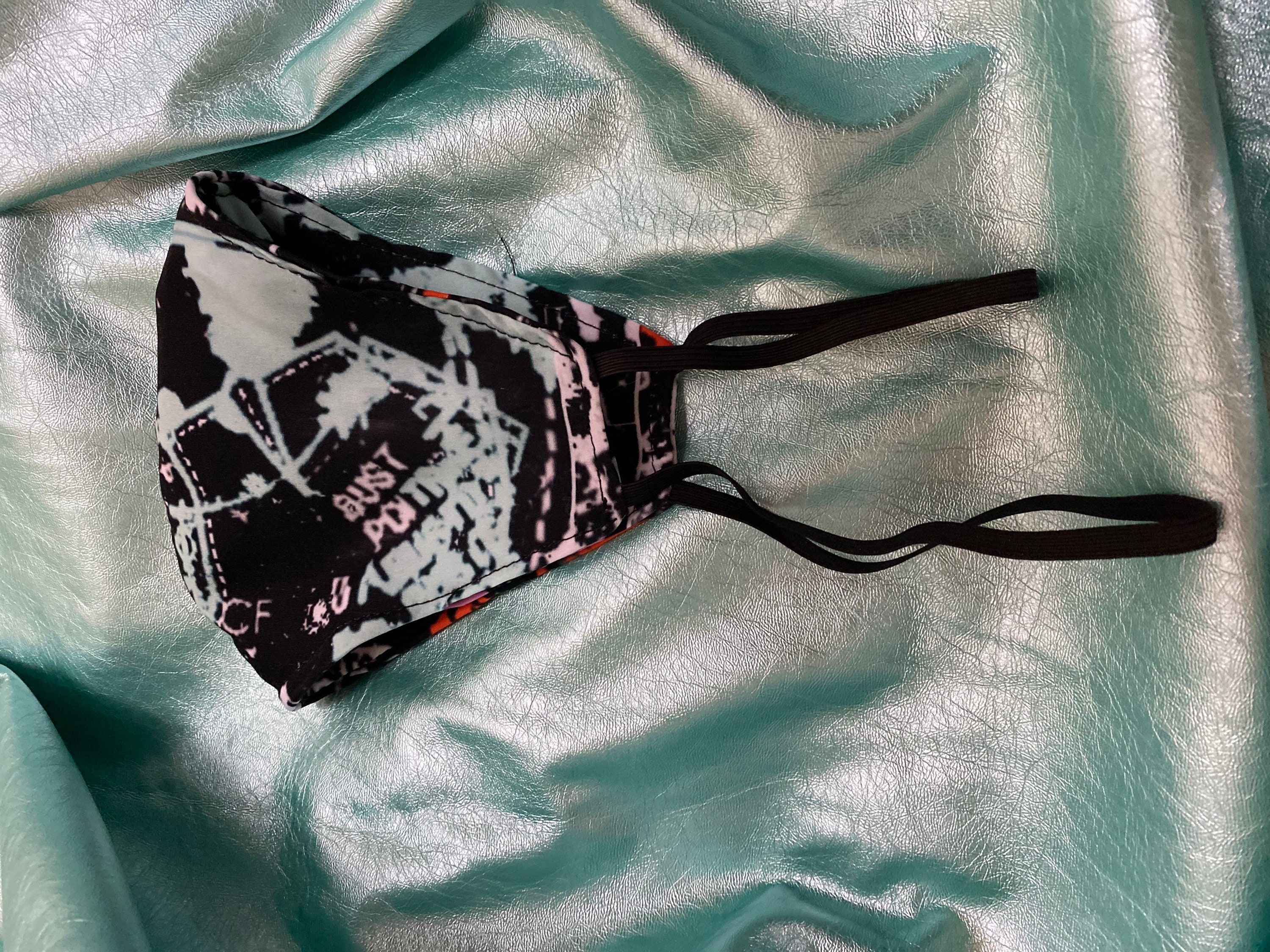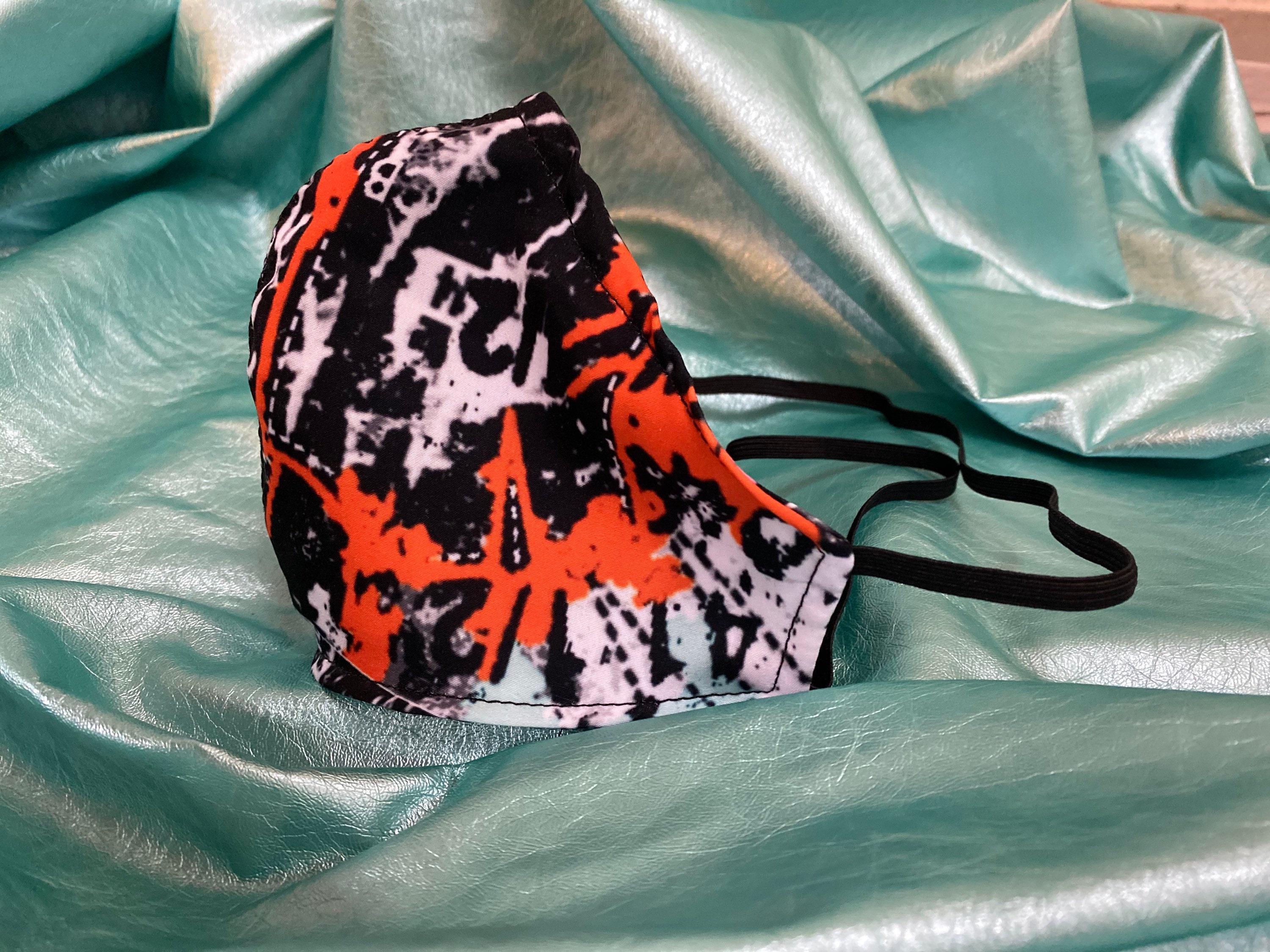 Thin, double lined abstract print mask with nose wiring, leopard lining and around the head/behind neck black elastic straps.