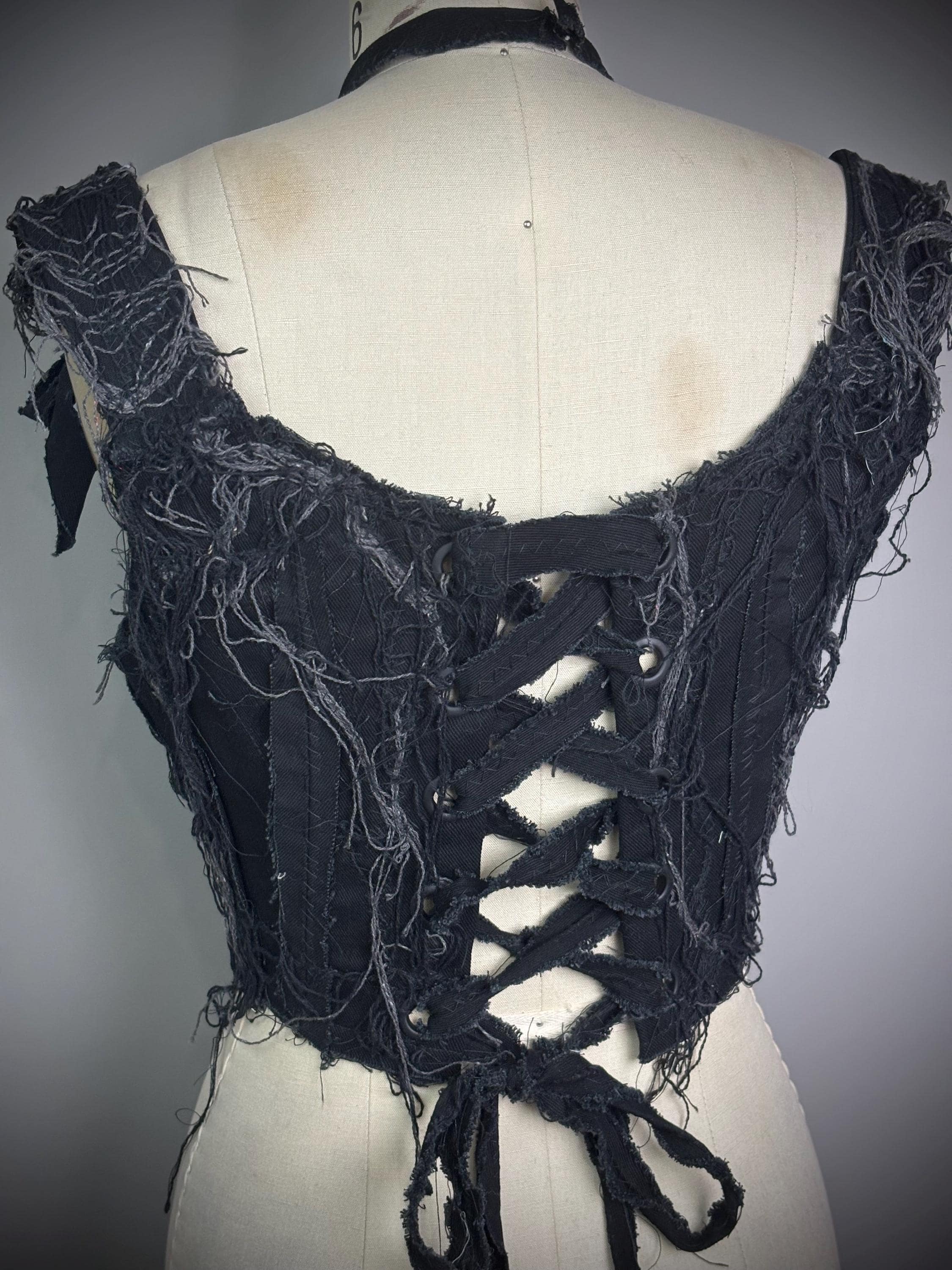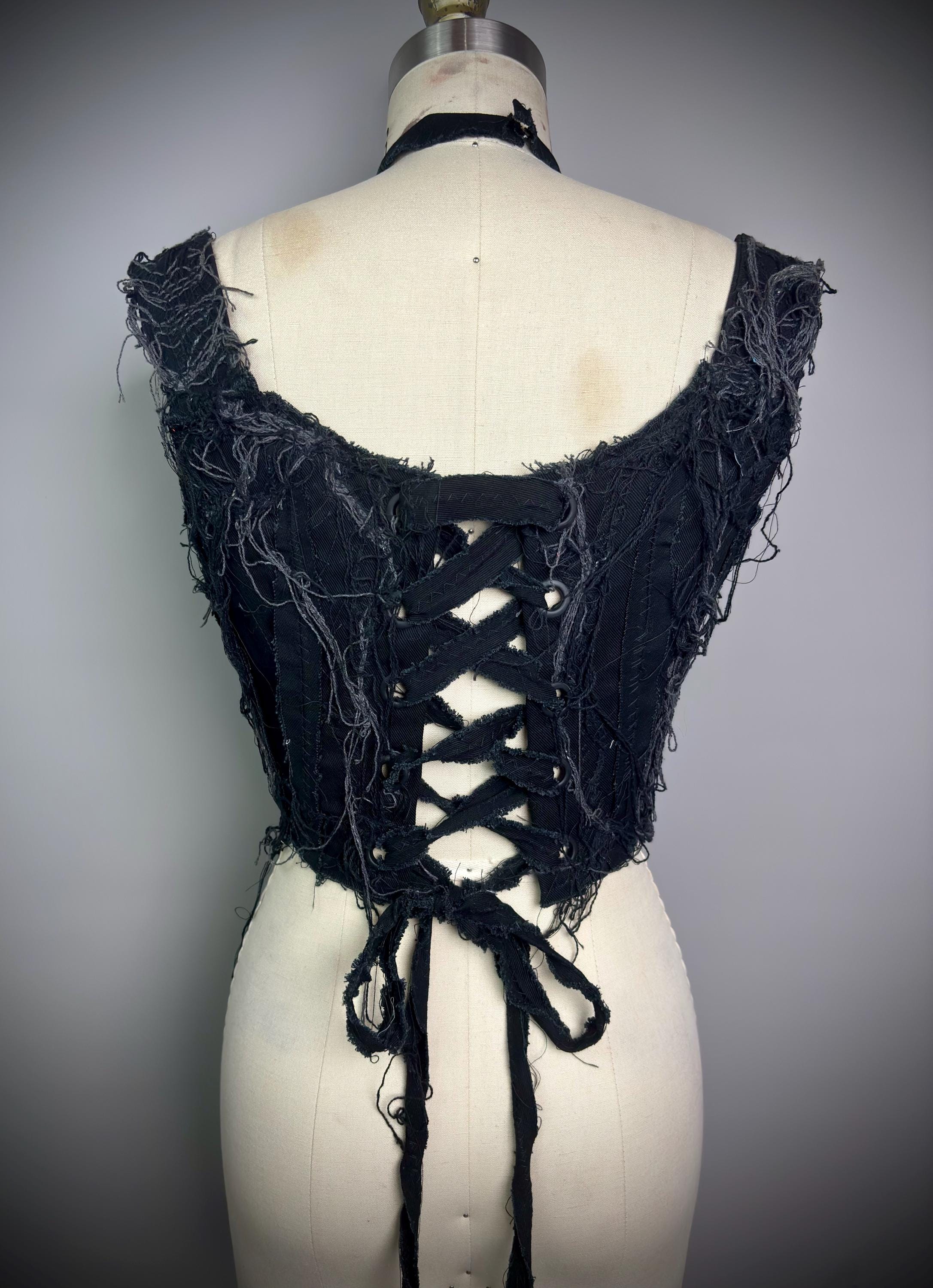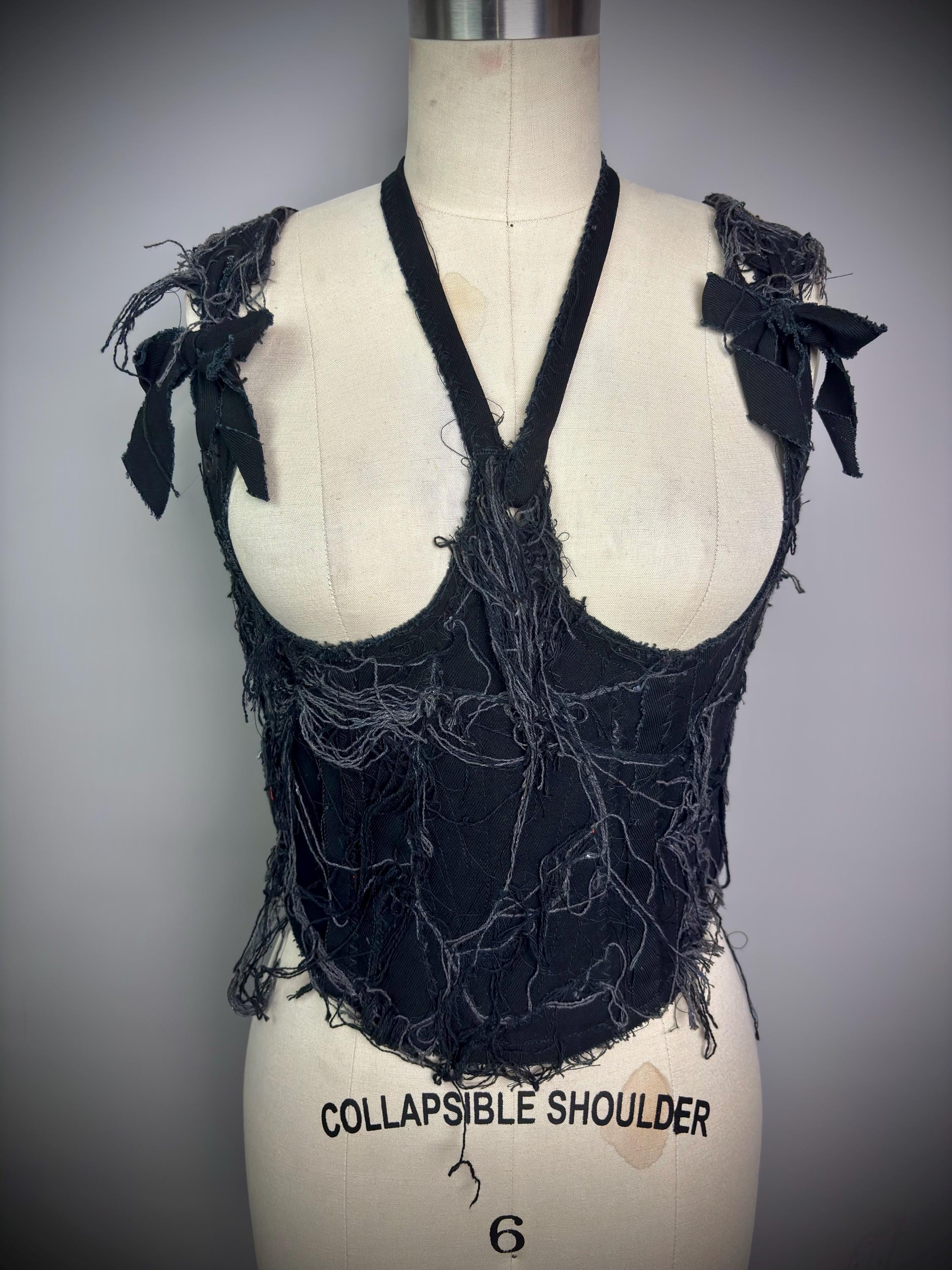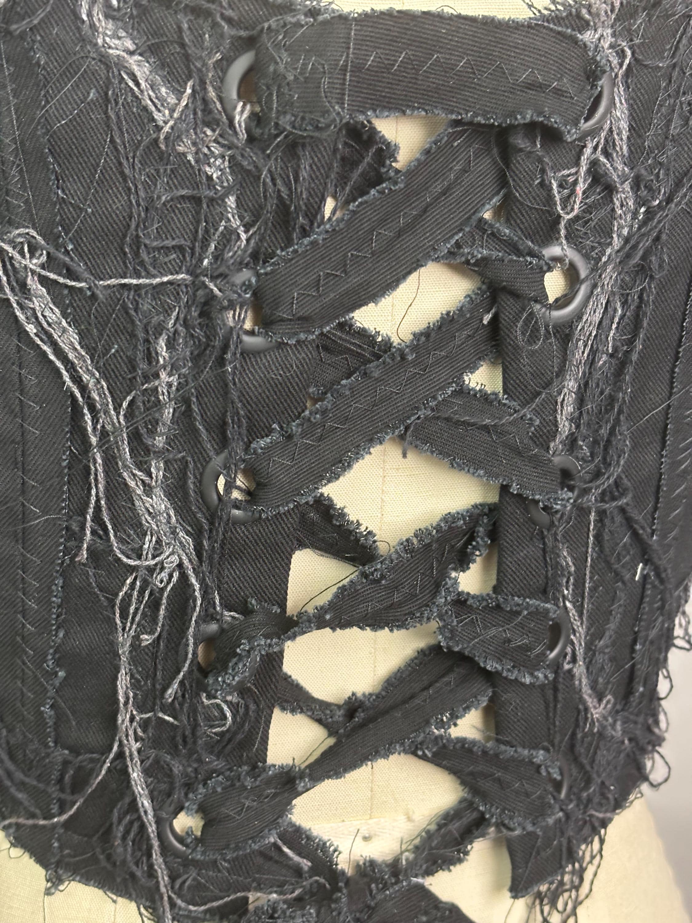 AntiLabel one-of-a-kind heavyweight, black bull denim underbust corset. Corset has gray fraying stringy mesh, lots of loose threads, and heavy duty black grommets. Bustier has plastic boning, adjustable lace up back and hook and eye neck strap. Blouse comes along with; distressed and painted, extra long sleeve straps and no closure.