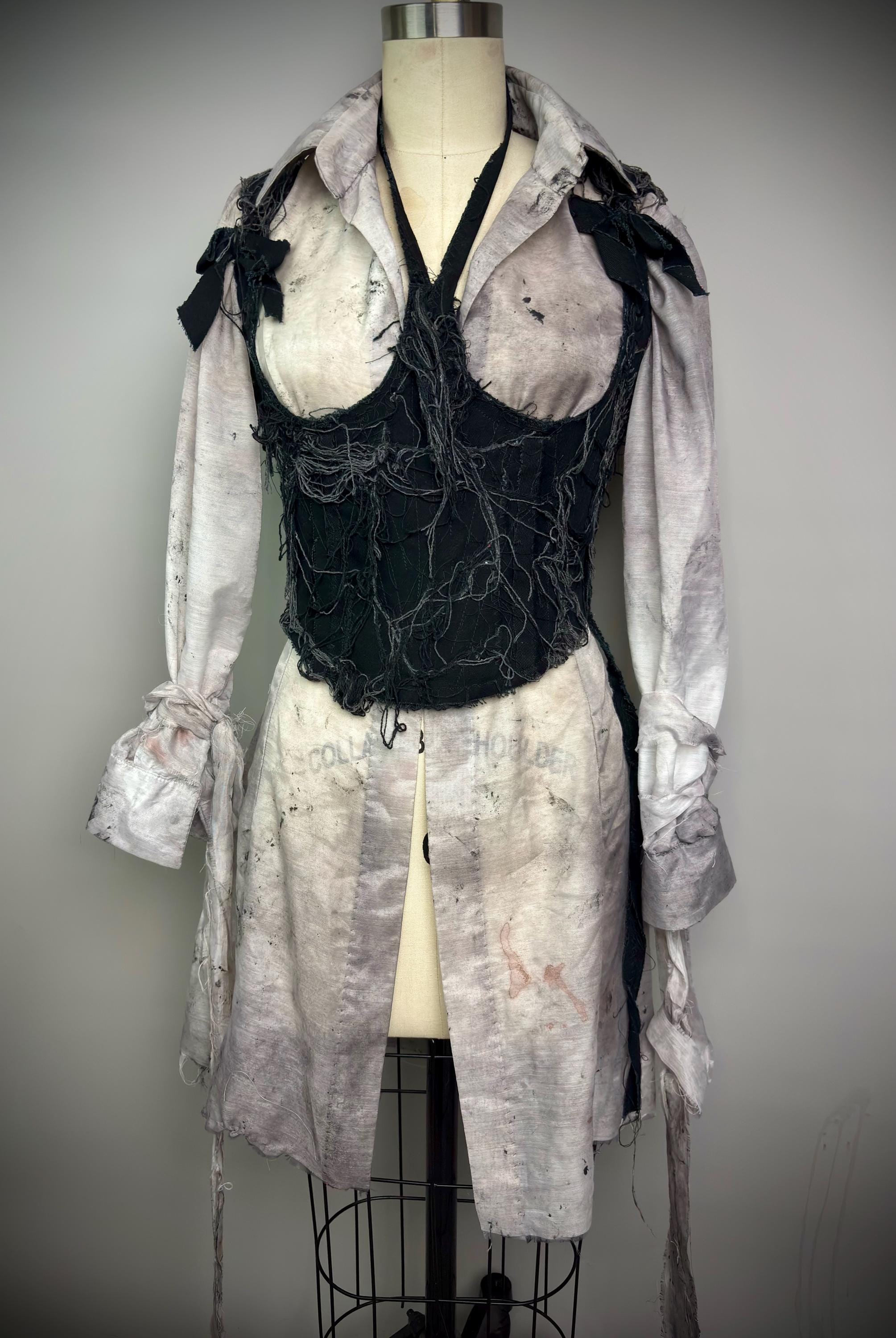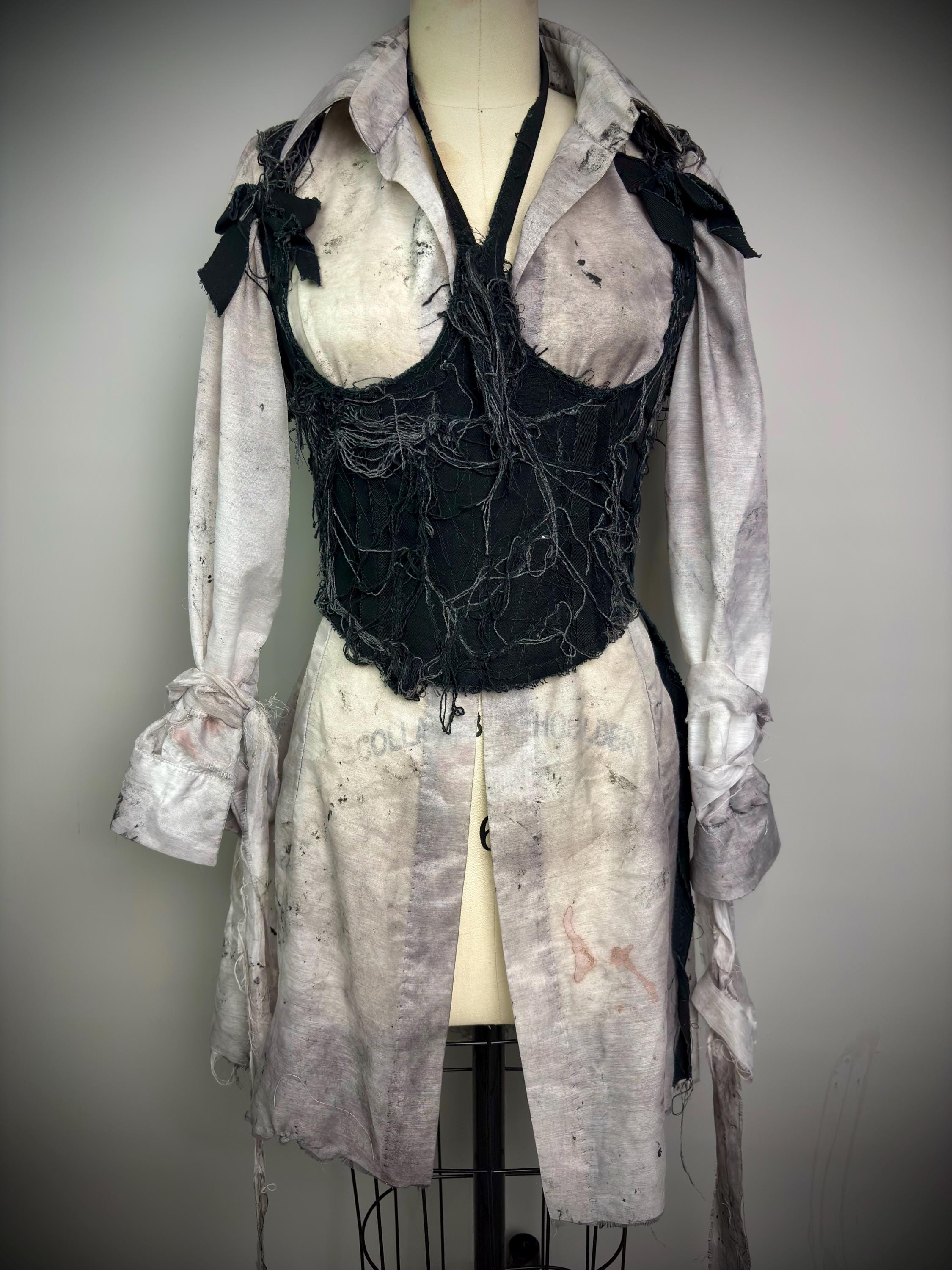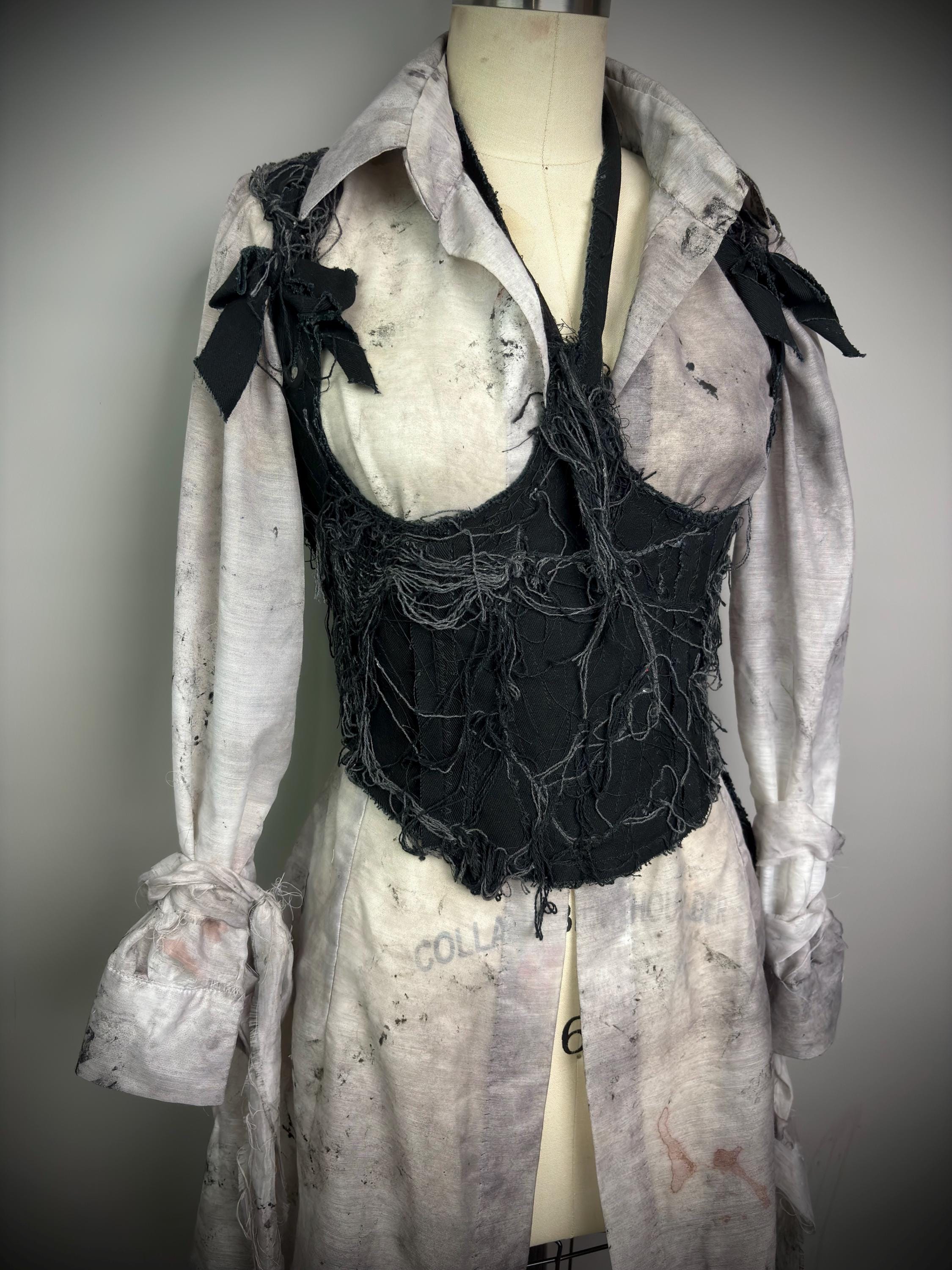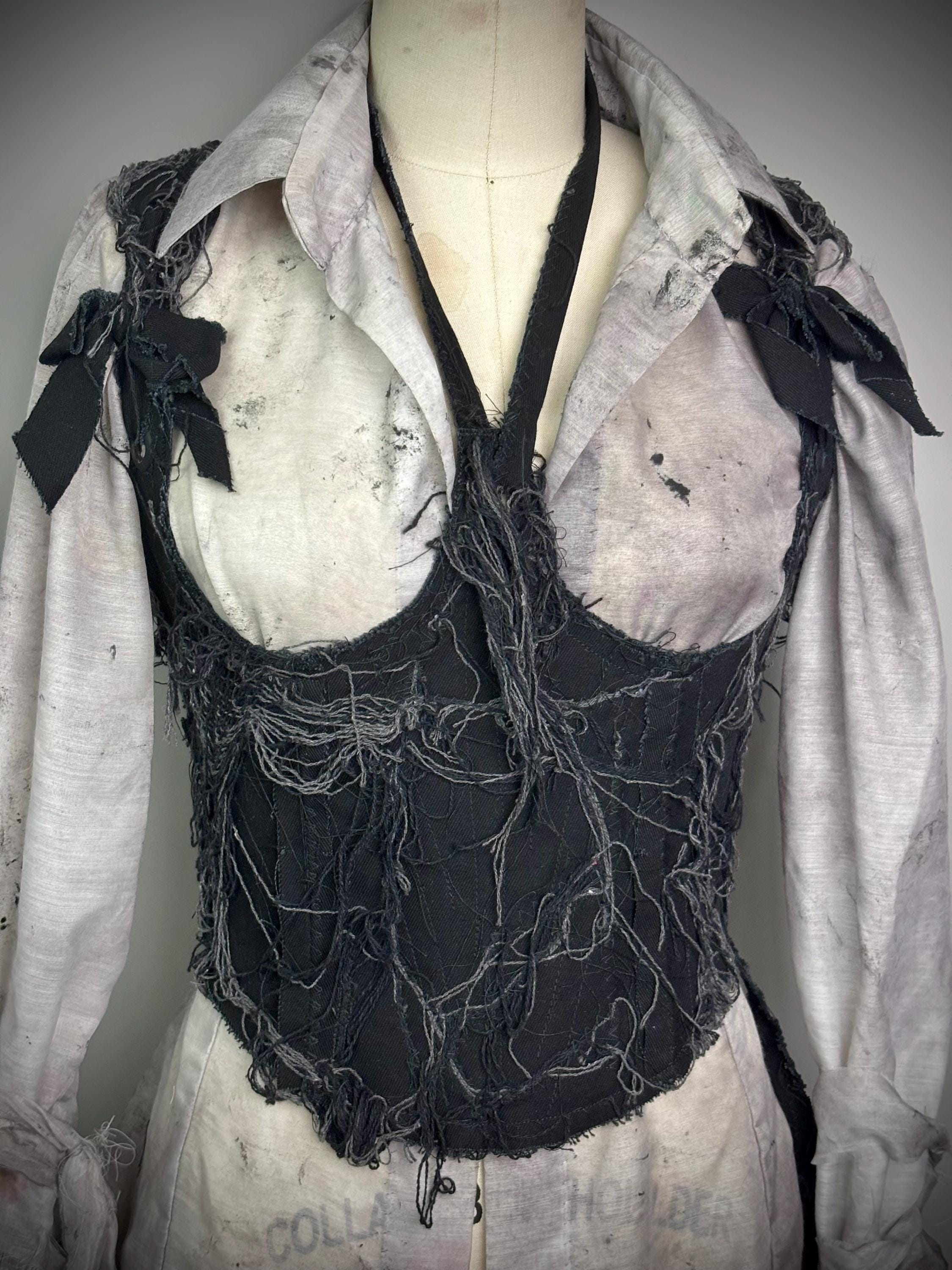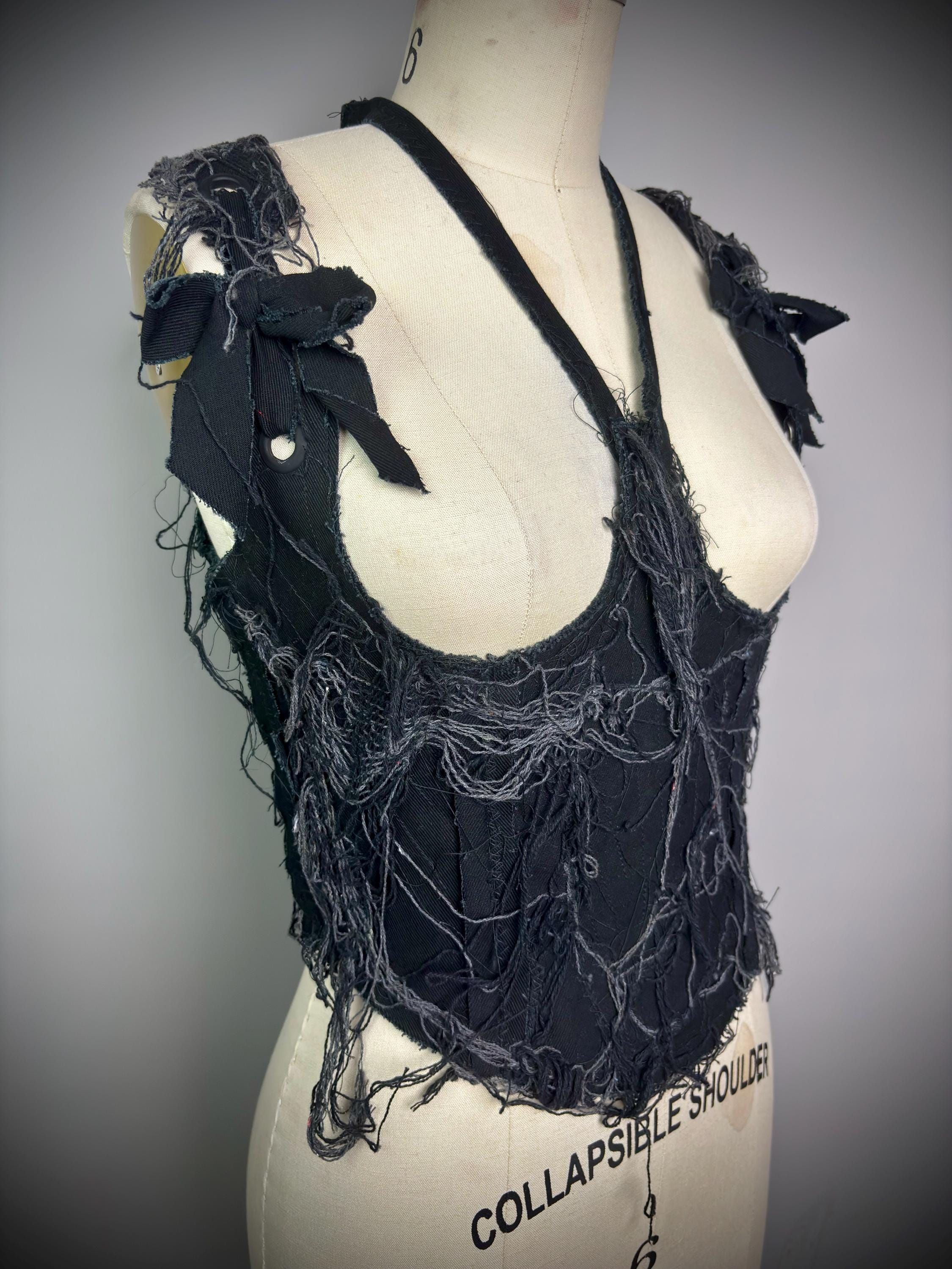 AntiLabel one-of-a-kind heavyweight, black bull denim underbust corset. Corset has gray fraying stringy mesh, lots of loose threads, and heavy duty black grommets. Bustier has plastic boning, adjustable lace up back and hook and eye neck strap. Blouse comes along with; distressed and painted, extra long sleeve straps and no closure.